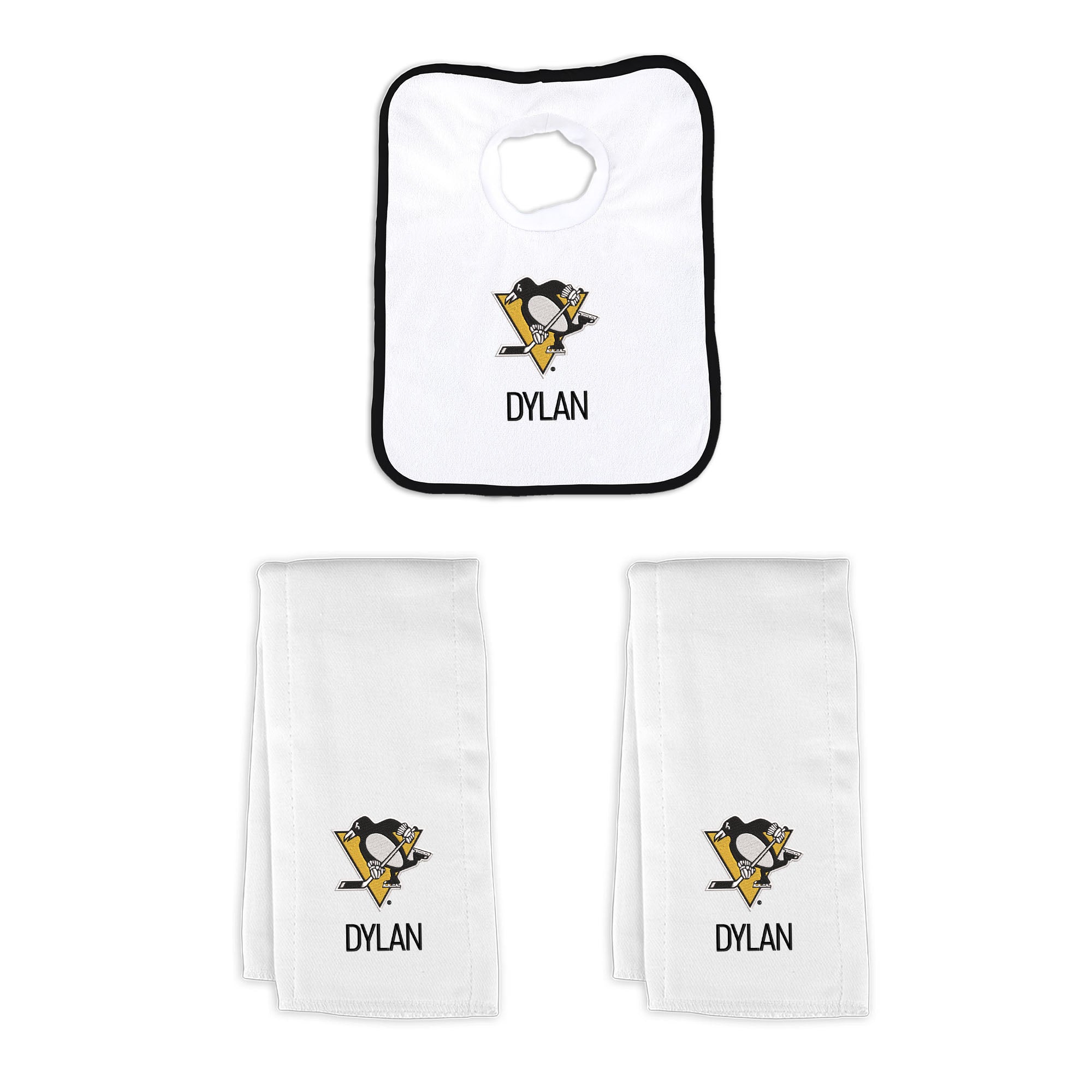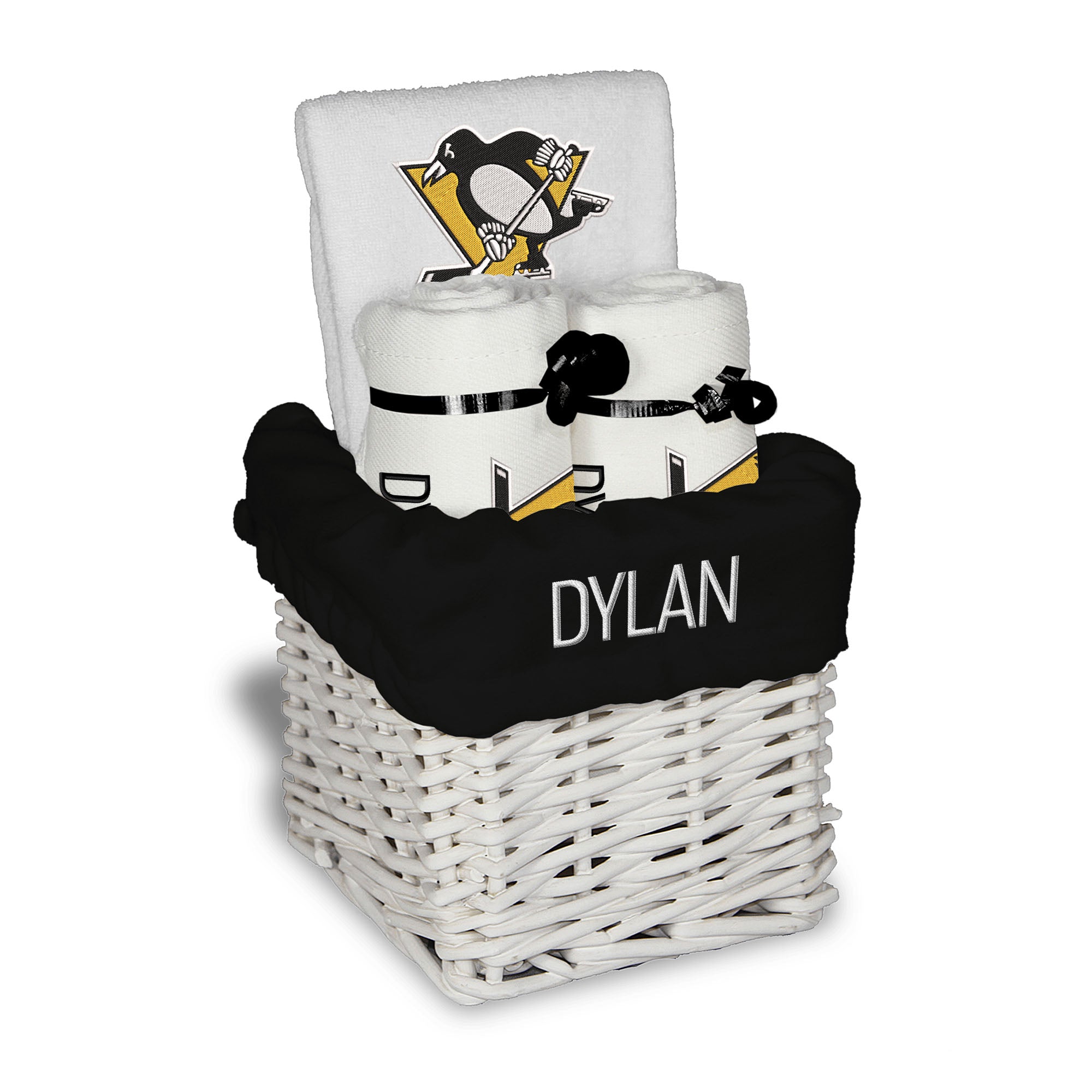 Our Personalized Pittsburgh Penguins Small Gift Basket contains 3 of our best-selling items packaged in a white willow basket with a personalized cotton liner. Each basket holds 2 of our 100% cotton burp cloths and a 100% cotton terry pullover bib. each piece is embroidered with the official Penguins logo and baby's name or nickname.