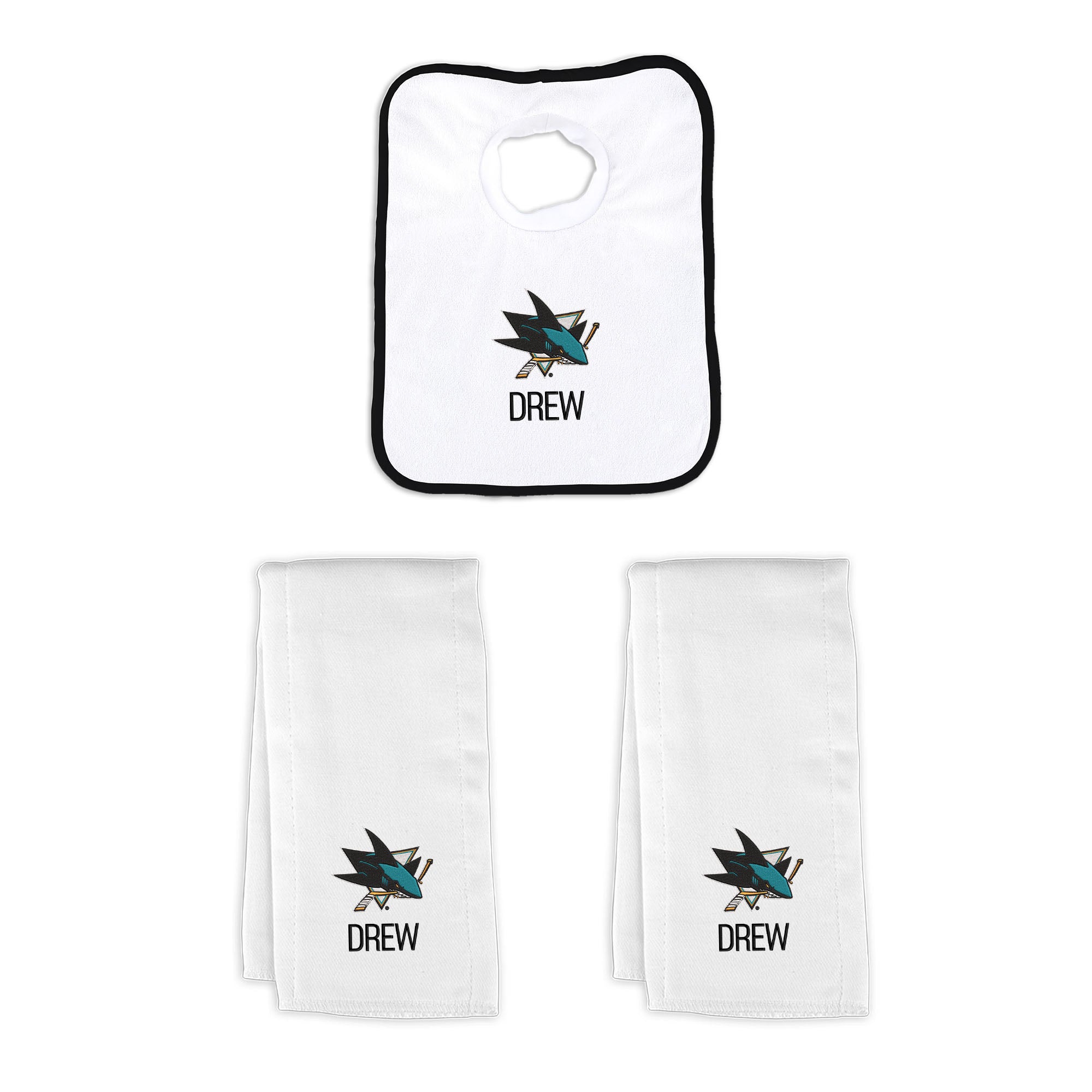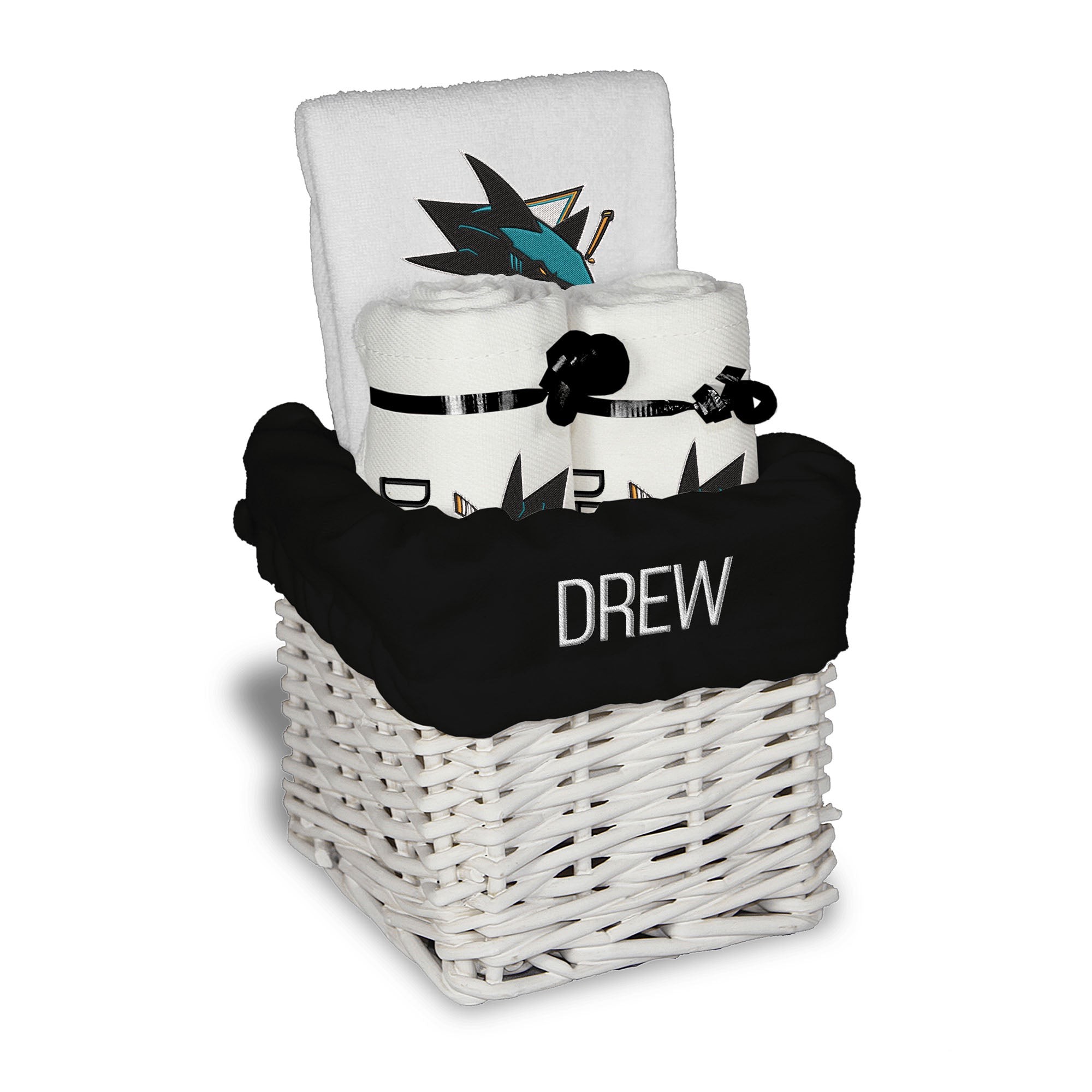 Our Personalized San Jose Sharks Small Gift Basket contains 3 of our best-selling items packaged in a white willow basket with a personalized cotton liner. Each basket holds 2 of our 100% cotton burp cloths and a 100% cotton terry pullover bib. each piece is embroidered with the official Sharks logo and baby's name or nickname.