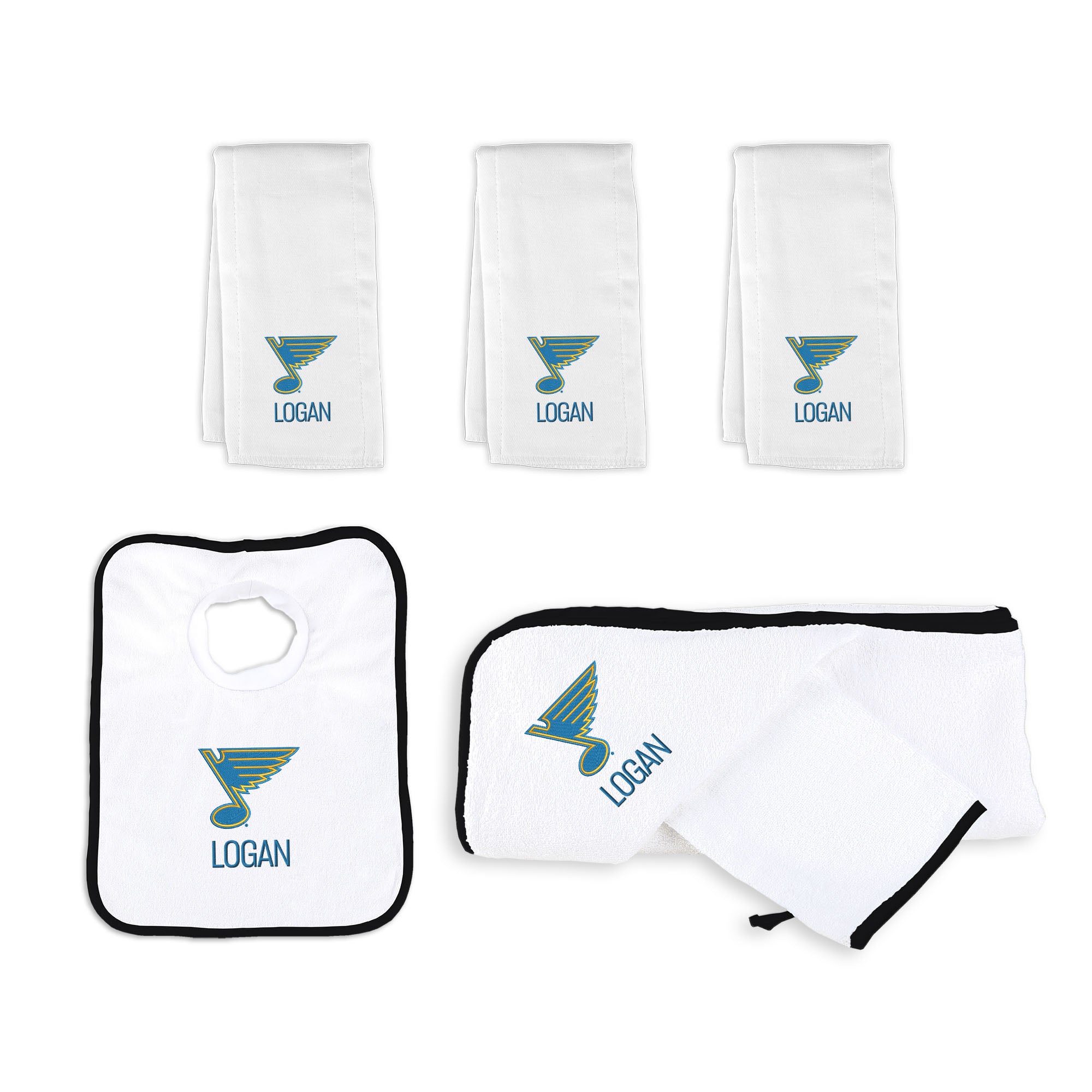This personalized gift basket contains a trio of 100% cotton burp cloths, a 100% cotton terry pullover bib, and a 100% cotton terry hooded towel with a wash mitt. Each of these high-quality items is expertly embroidered with the iconic St. Louis Blues logo, making them the ideal choice for young Blues fans in the making.