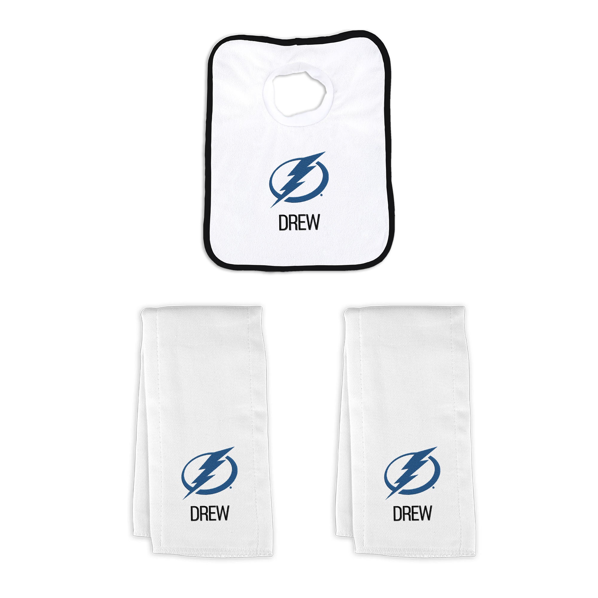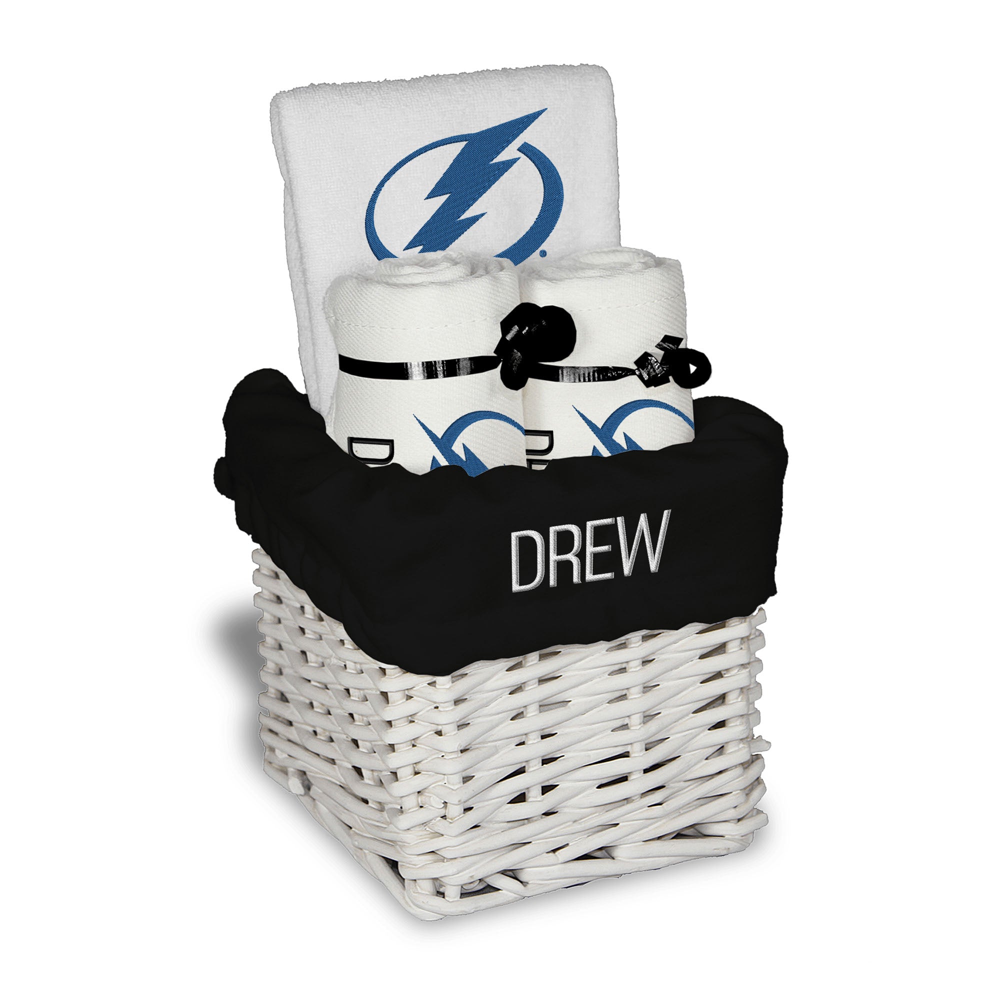 Our Personalized Tampa Bay Lightning Small Gift Basket contains 3 of our best-selling items packaged in a white willow basket with a personalized cotton liner. Each basket holds 2 of our 100% cotton burp cloths and a 100% cotton terry pullover bib. each piece is embroidered with the official Lightning logo and baby's name or nickname.
