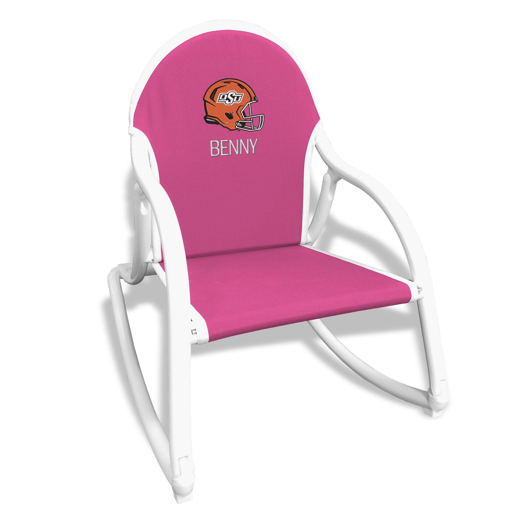 Our kid-sized Personalized Oklahoma State Cowboys Rocking Chair will be the best seat in the house (and everywhere else!). This Cowboys chair is not only super comfortable, but also foldable and lightweight, making it easy to transport from room to room or put away for storage. The adult weight fabric and sturdy construction ensure that your little Cowboys fan will be both comfortable and safe. The rockers are 3 inches wider than the seat, so the Cowboys chair is extra stable, and foot pads under the fronts of the rockers hold the chair steady so toddlers can safely climb in to sit. This Cowboys rocker is also 100% water-safe, so it can be used outside in the yard, at the park, at a game or even at the beach!