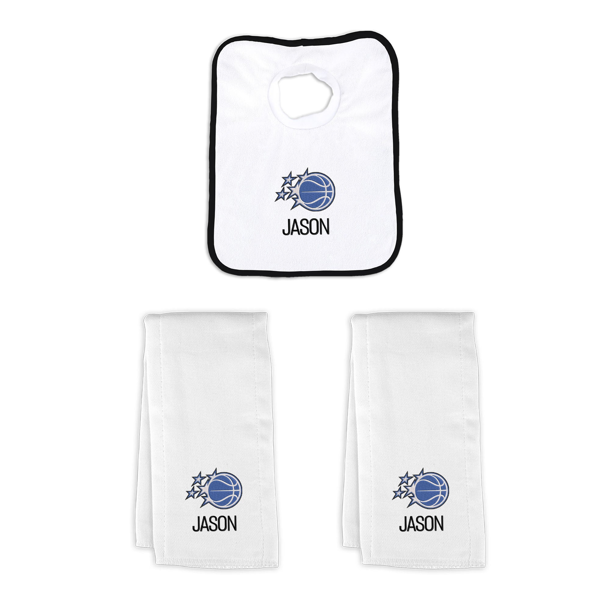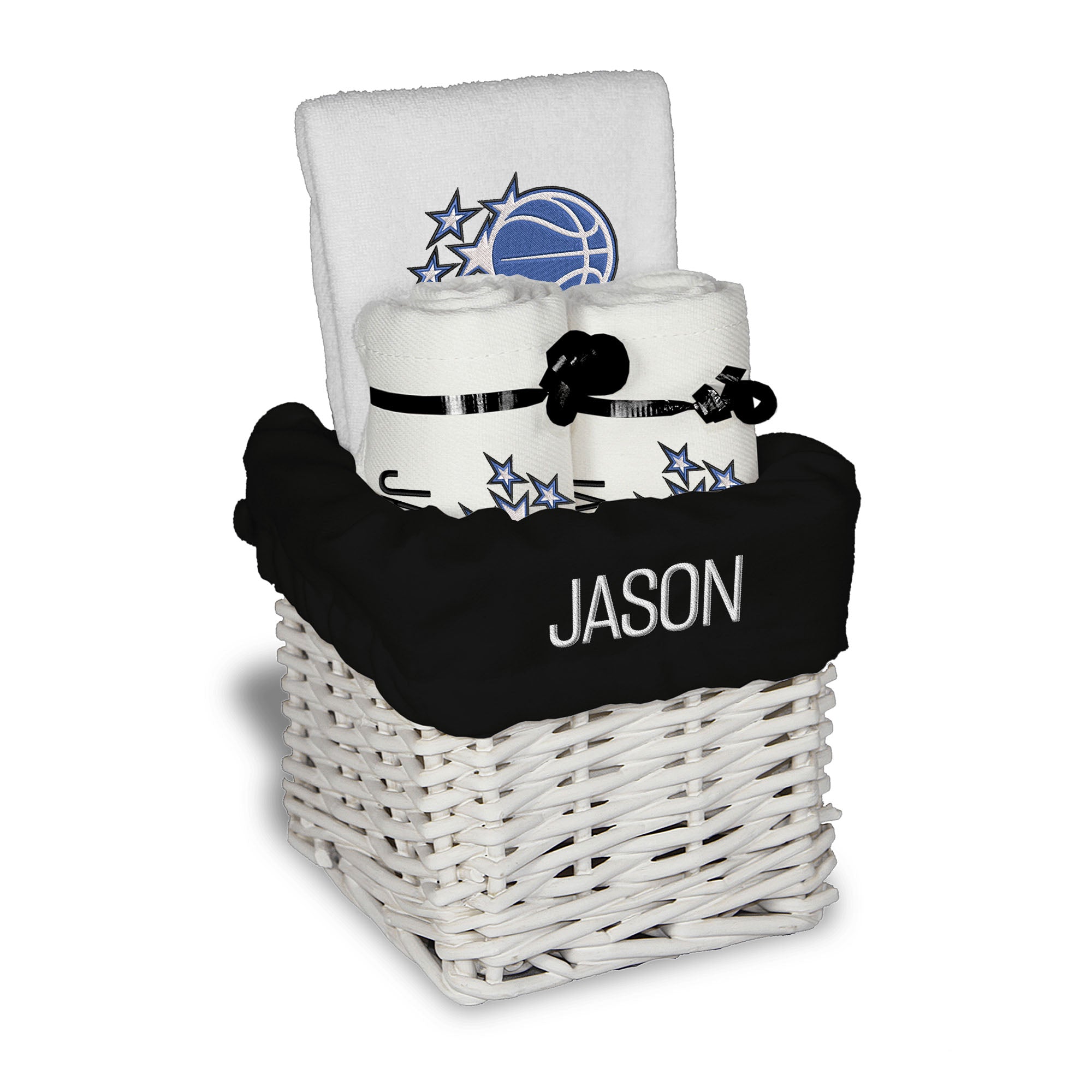 Our Personalized Orlando Magic Small Gift Basket contains 3 of our best-selling items packaged in a white willow basket with a personalized cotton liner. Each basket holds 2 of our 100% cotton burp cloths and a 100% cotton terry pullover bib. each piece is embroidered with the official Magic logo and baby's name or nickname.