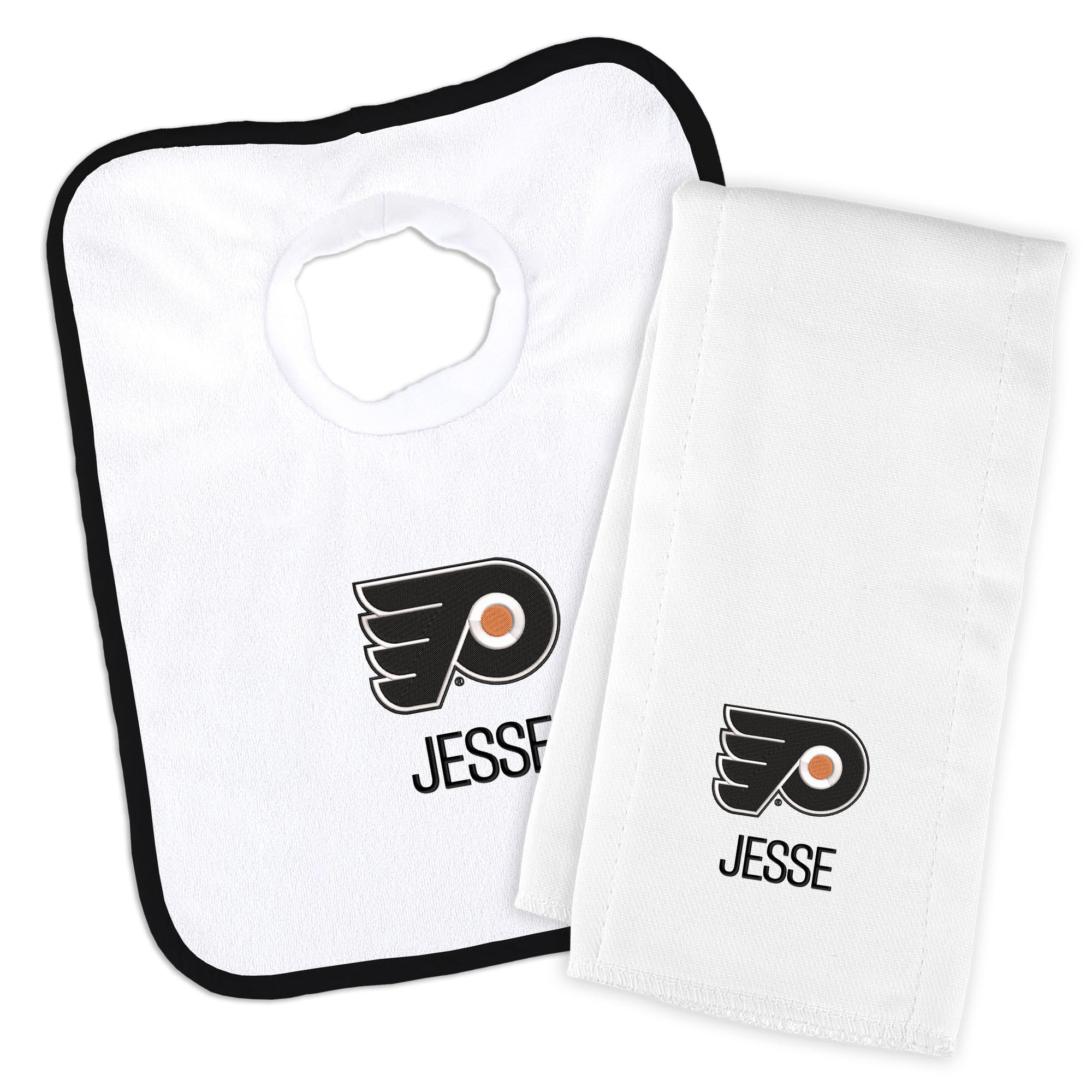 Our Personalized Philadelphia Flyers Bib and Burp Cloth Set is a thoughtful and useful gift for every baby Flyers fan. The Flyers burp cloth is generously sized and made of soft, absorbent 100% cotton, and the bib has a soft, stretchable cotton neck hole for baby’s comfort. Parents, the bib slips easily over your baby's head and features a soft, gently gathered stretch cotton neck hole for maximum comfort; also, the burp cloth is a must-have asset. Each item features the embroidered logo and the baby's name or nickname underneath.