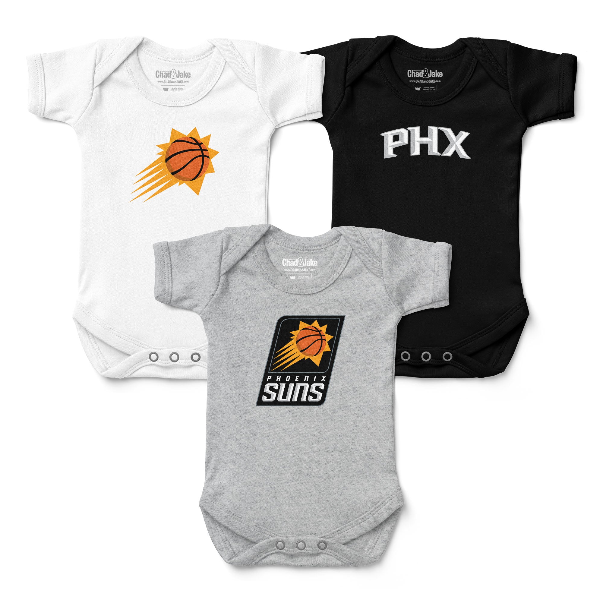 Introduce your little one to the world of hockey with our officially licensed Phoenix Suns 3-Pack Bodysuits. Crafted from soft and breathable cotton, these bodysuits are perfect for keeping your baby comfortable throughout the day. Each pack includes three unique designs that proudly represent the Phoenix Suns, ensuring your baby looks adorable while supporting the team. Available in five sizes: 0-3 Months, 3-6 Months, 6-12 Months, 12-18 Months, and 18-24 Months. Whether it's game day or everyday wear, your little one will be the cutest Suns fan in town. Get your 3-pack today and show your Phoenix Suns spirit!