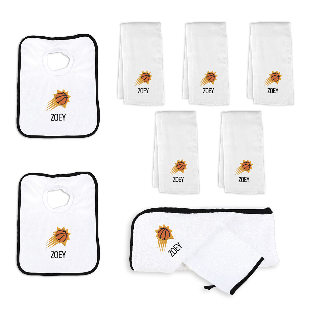 Our Personalized Phoenix Suns Large Gift Basket contains an assortment of our best-selling items packaged in a white willow basket with a personalized cotton liner. Each basket holds five of our 100% cotton burp cloths, two 100% cotton terry pullover bibs, and one 100% cotton terry hooded towel and wash mitt. The burp cloths, bibs and hooded towel are each embroidered with the Suns logo and baby’s name or nickname; the basket liner is embroidered with the baby’s name.
