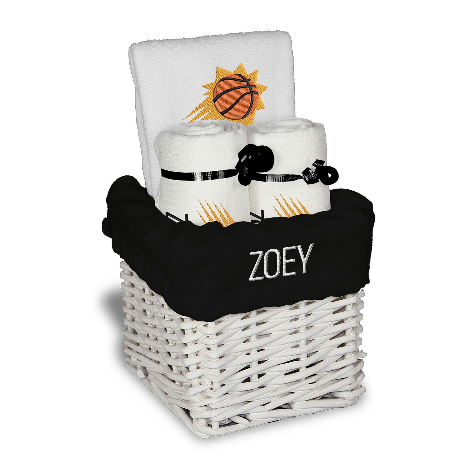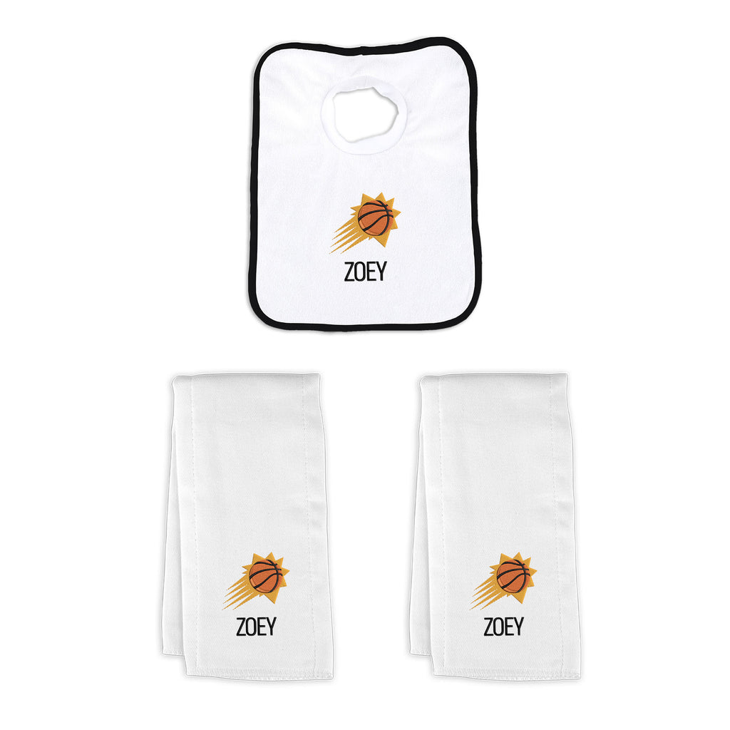 Our Personalized Phoenix Suns Small Gift Basket contains 3 of our best-selling items packaged in a white willow basket with a personalized cotton liner. Each basket holds 2 of our 100% cotton burp cloths and a 100% cotton terry pullover bib. each piece is embroidered with the official Suns logo and baby's name or nickname.