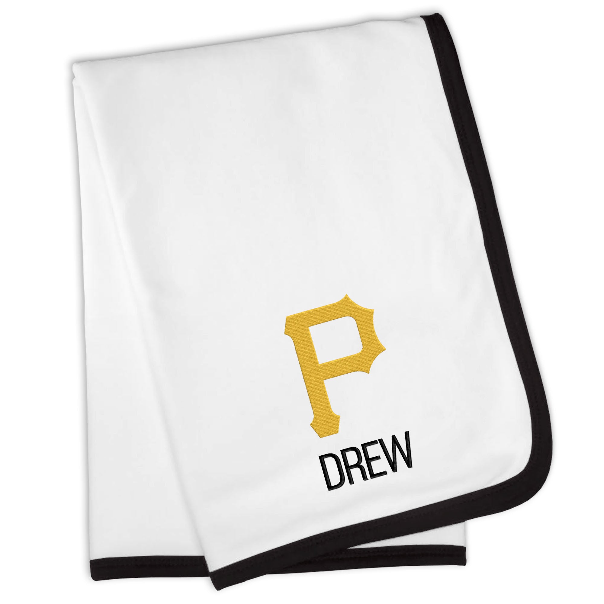 Our Personalized Pittsburgh Pirates Blanket is sized just right for a baby baseball fan. Constructed from super soft 100% cotton jersey knit and trimmed in Pirates team colors, this blanket is perfect for walks in the stroller or swaddling at bedtime.  Each blanket is embroidered with the official Pirates logo and your little one’s name or nickname.