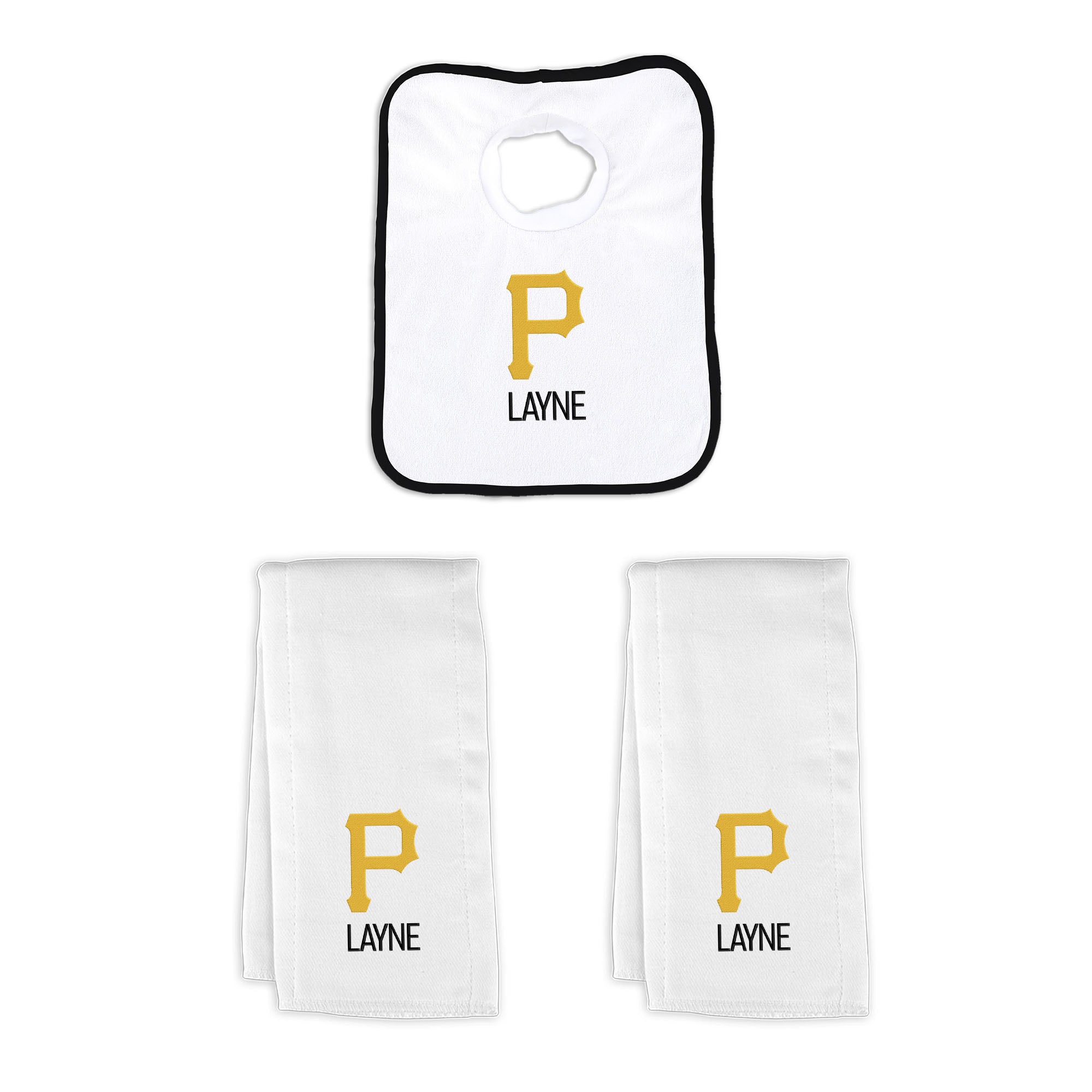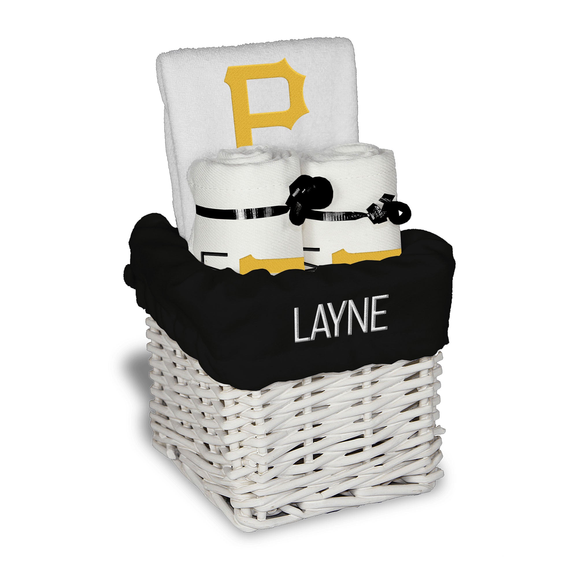 Our Personalized Pittsburgh Pirates Small Gift Basket contains 3 of our best-selling items packaged in a white willow basket with a personalized cotton liner. Each basket holds 2 of our 100% cotton burp cloths and a 100% cotton terry pullover bib. each piece is embroidered with the official Pirates logo and baby's name or nickname.