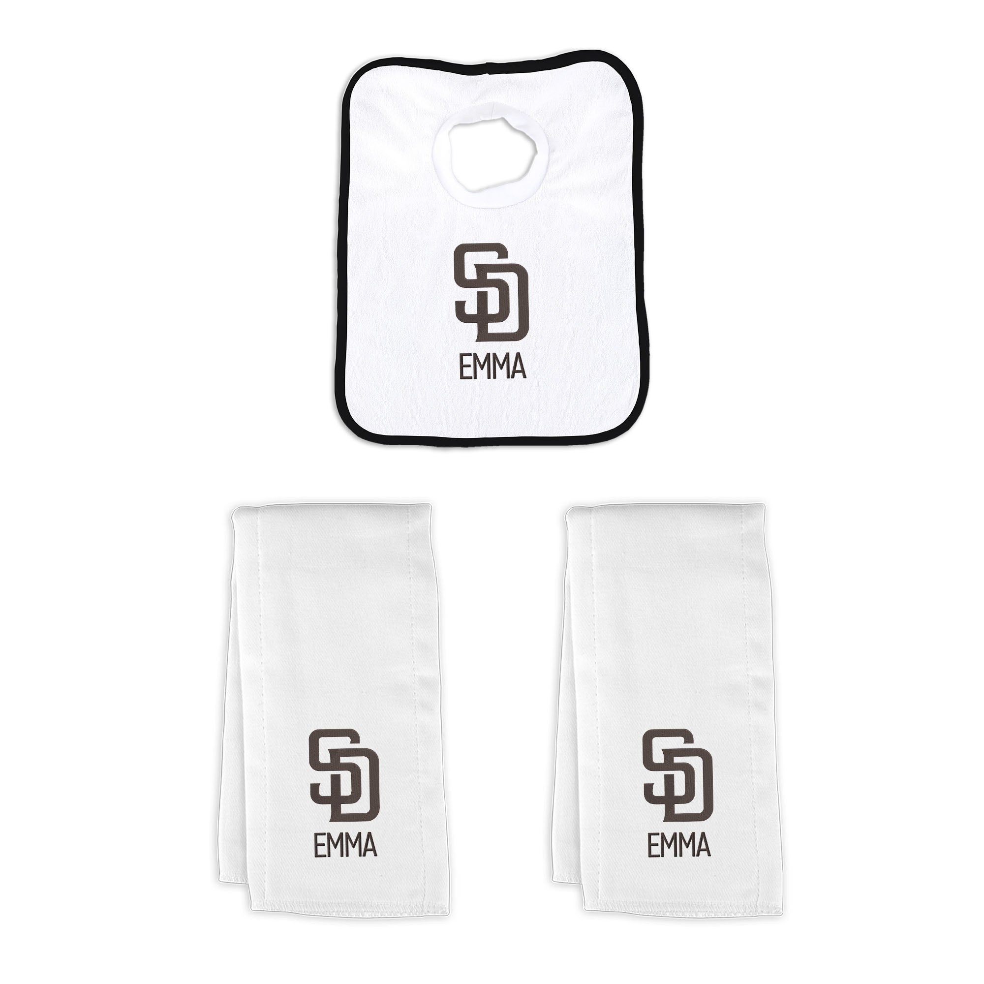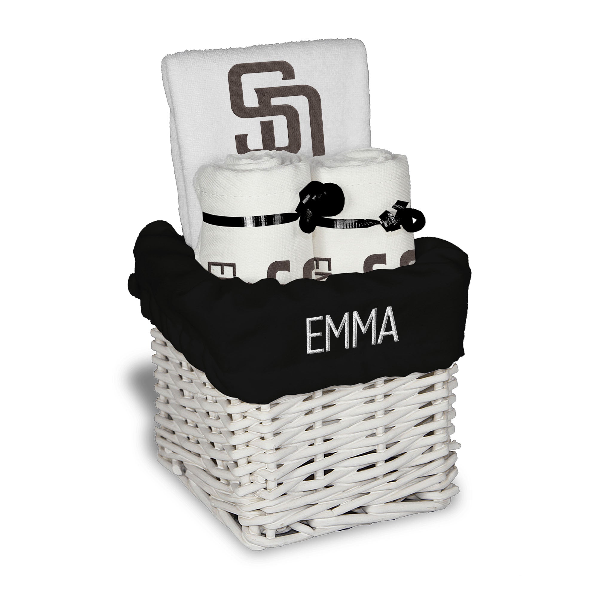 Our Personalized San Diego Padres Small Gift Basket contains 3 of our best-selling items packaged in a white willow basket with a personalized cotton liner. Each basket holds 2 of our 100% cotton burp cloths and a 100% cotton terry pullover bib. each piece is embroidered with the official Padres logo and baby's name or nickname.
