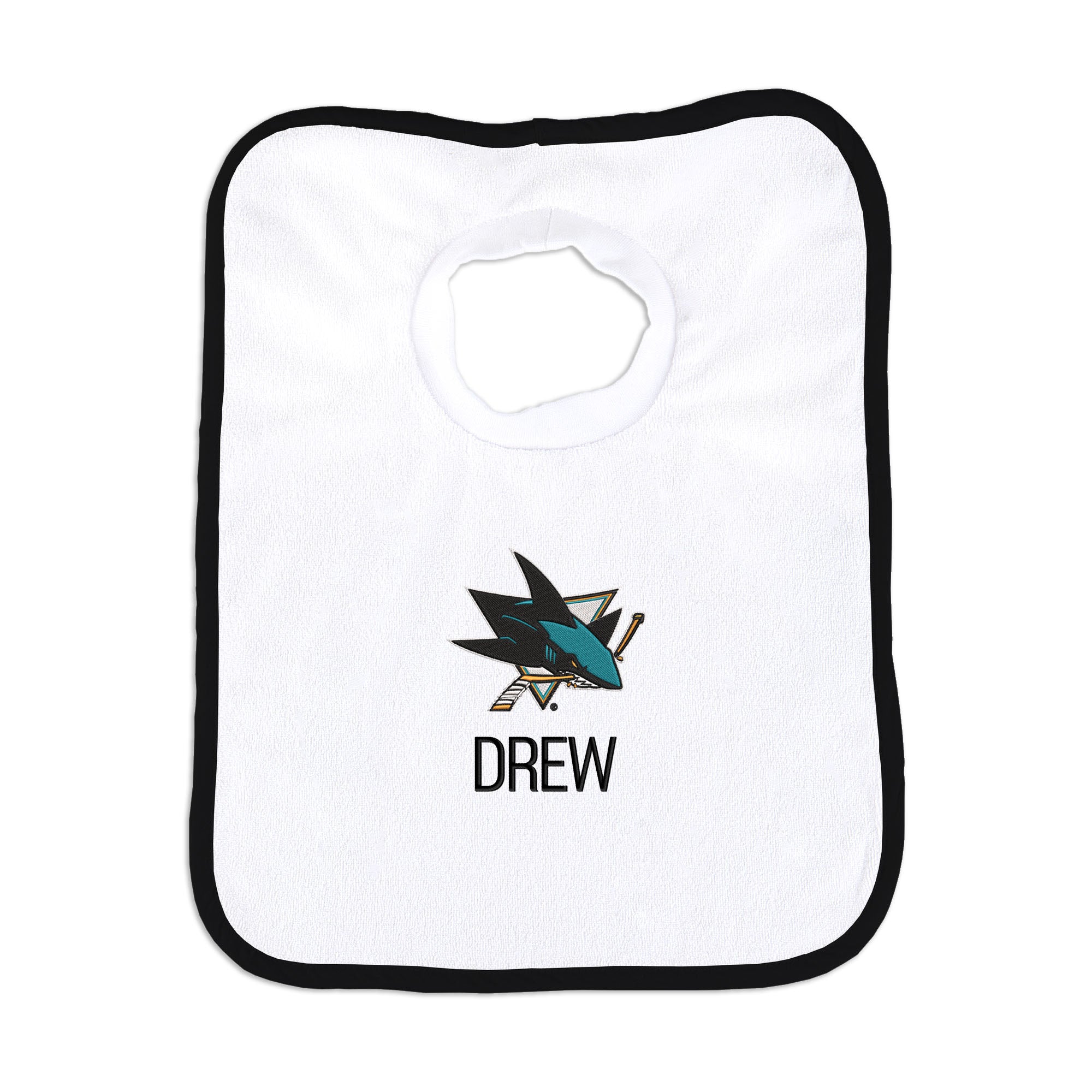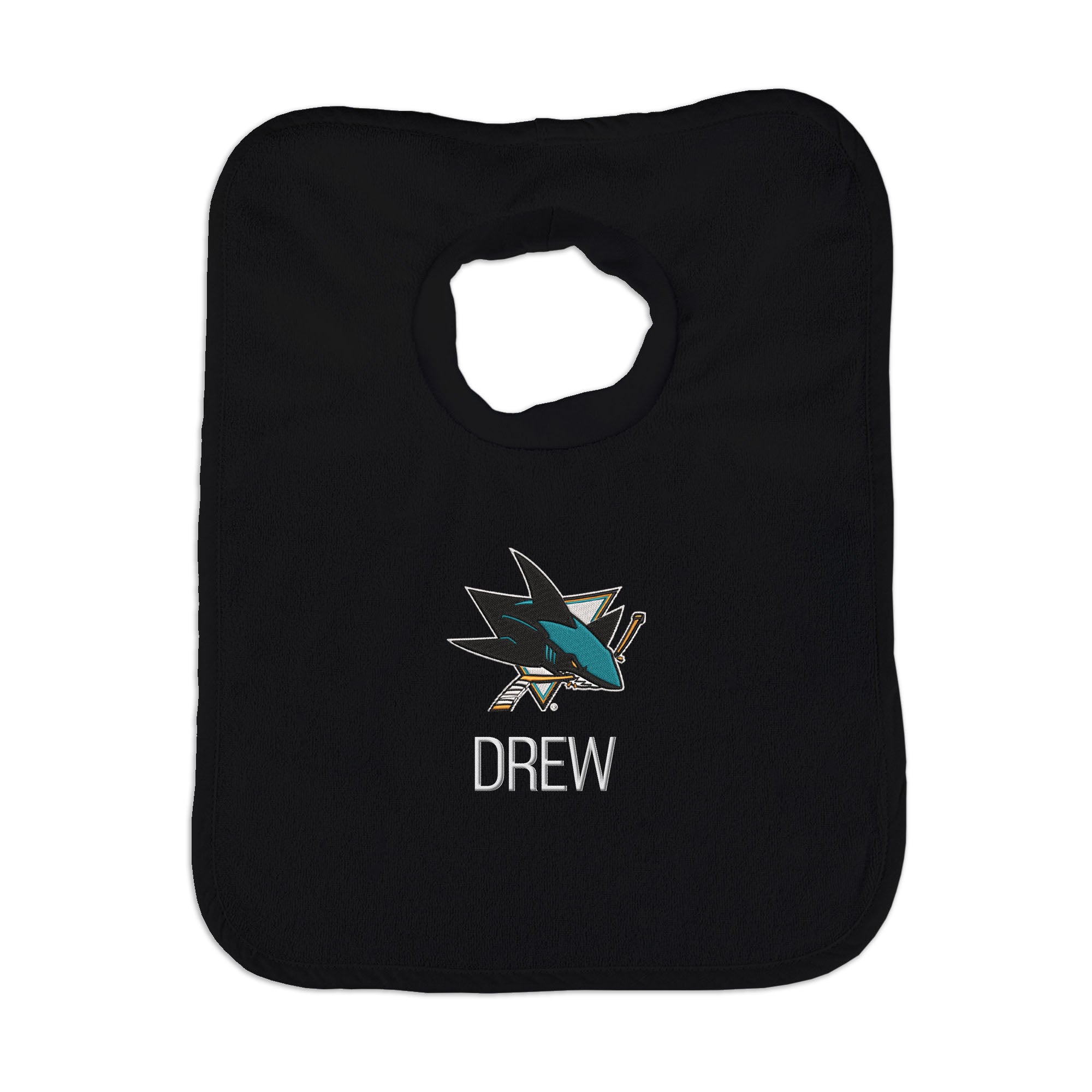 Our Personalized San Jose Sharks Bib is the perfect accessory for every baby Sharks fan. The bib slips on easily over baby’s head, with a neck hole that is specially designed for extra comfort with super soft, gently gathered stretch cotton. Each bib is embroidered with the Sharks logo and your little one’s name or nickname. Makes a wonderful gift for new hockey babies and their families.