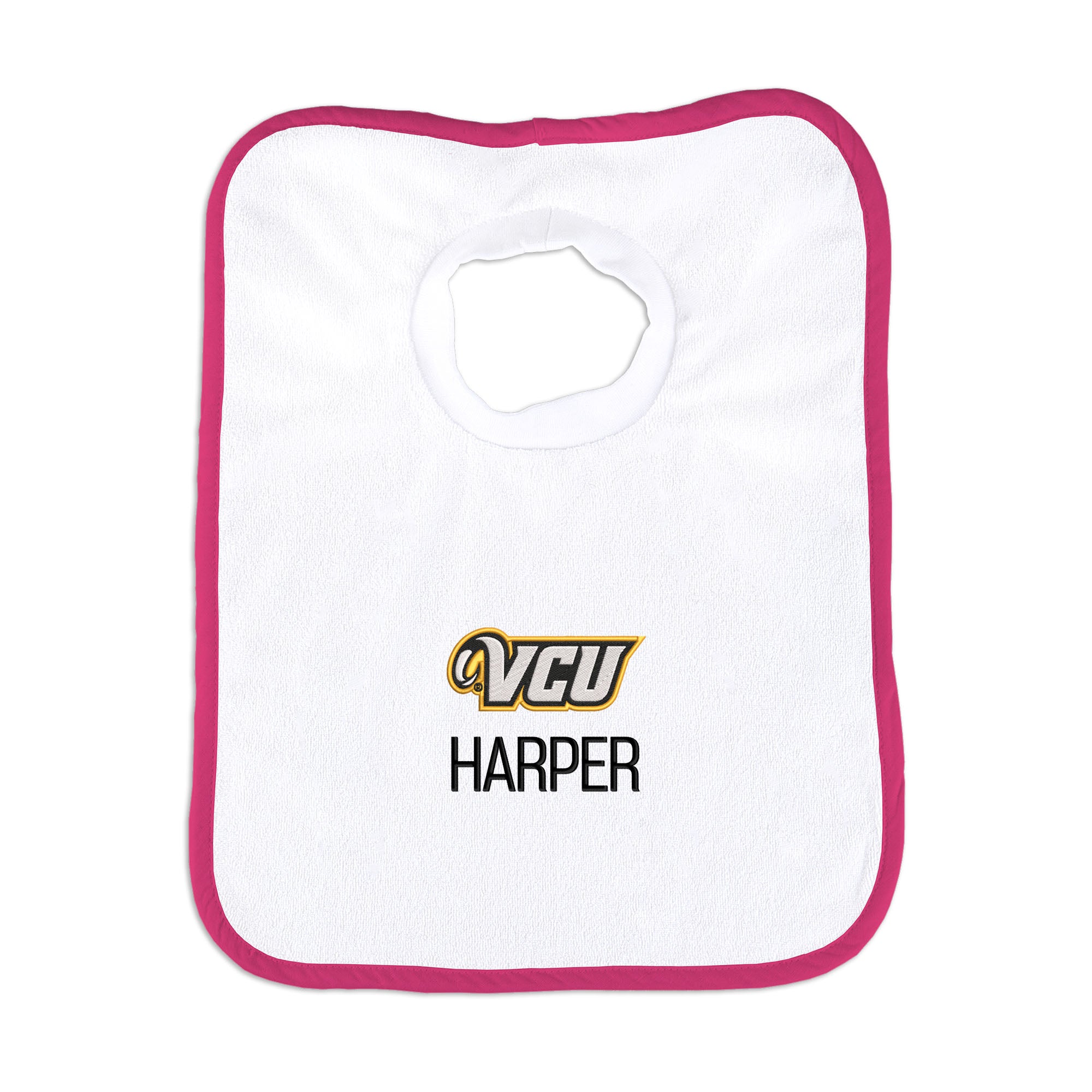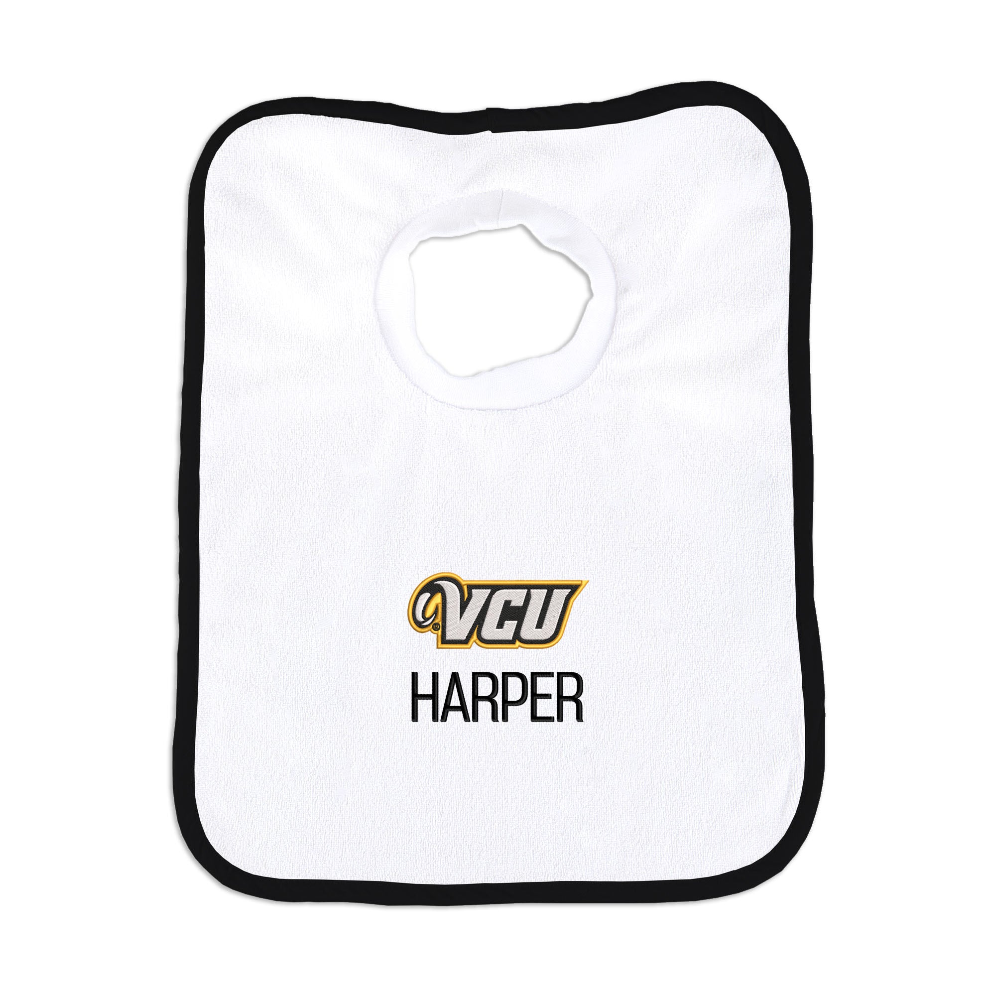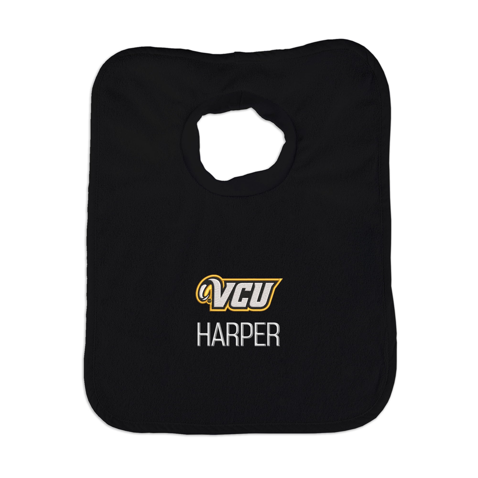 Dress your little Ram in style with our Personalized VCU Rams Pullover Bib. This bib is a game day essential for your little fan! Crafted from stretch terry cloth, it offers a comfortable and snug fit with its stretchable neck hole. Featuring the iconic Rams logo, officially licensed by the university, this bib adds a touch of team spirit to every mealtime. Personalize it with your baby's name for an extra special touch. Whether it's for catching dribbles or spills, this pullover bib combines functionality with team pride seamlessly. Order the Personalized VCU Rams Pullover Bib today and let your little one showcase their team pride from mealtime to playtime!