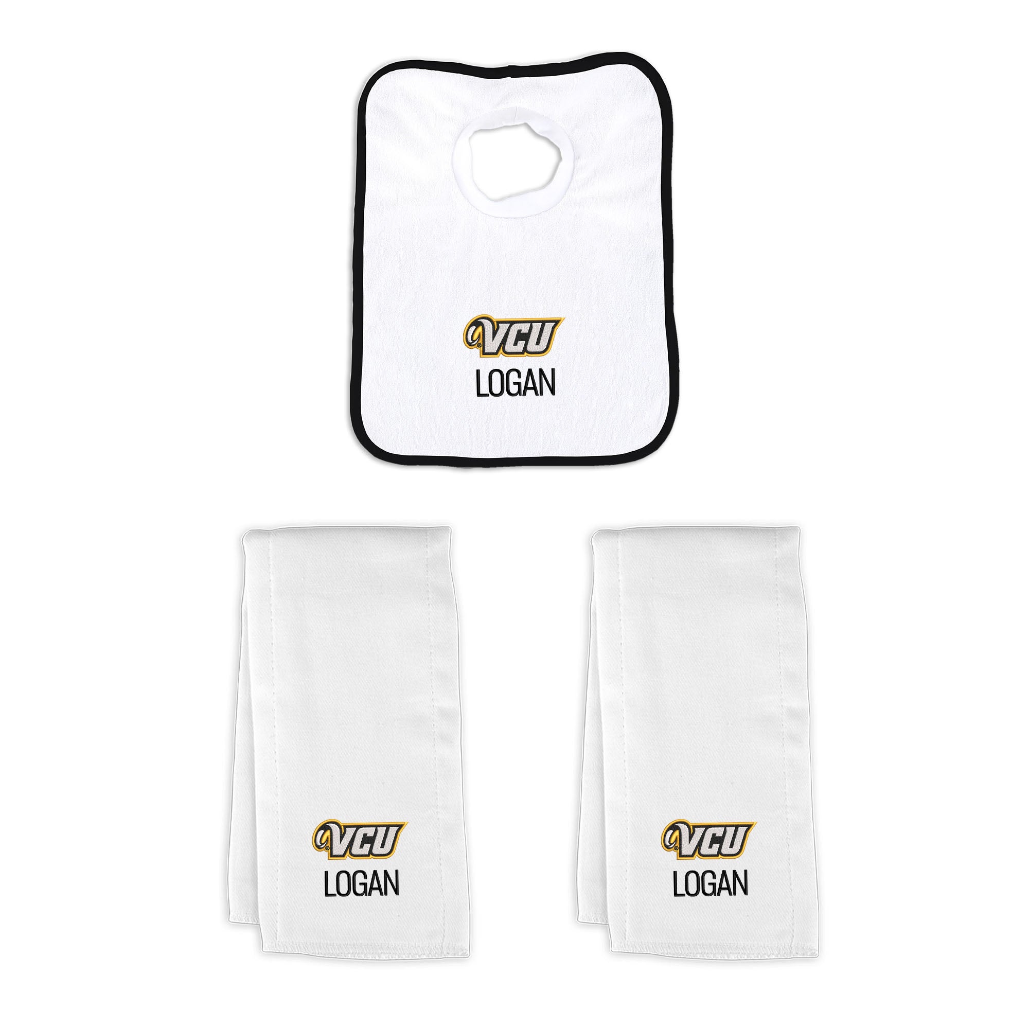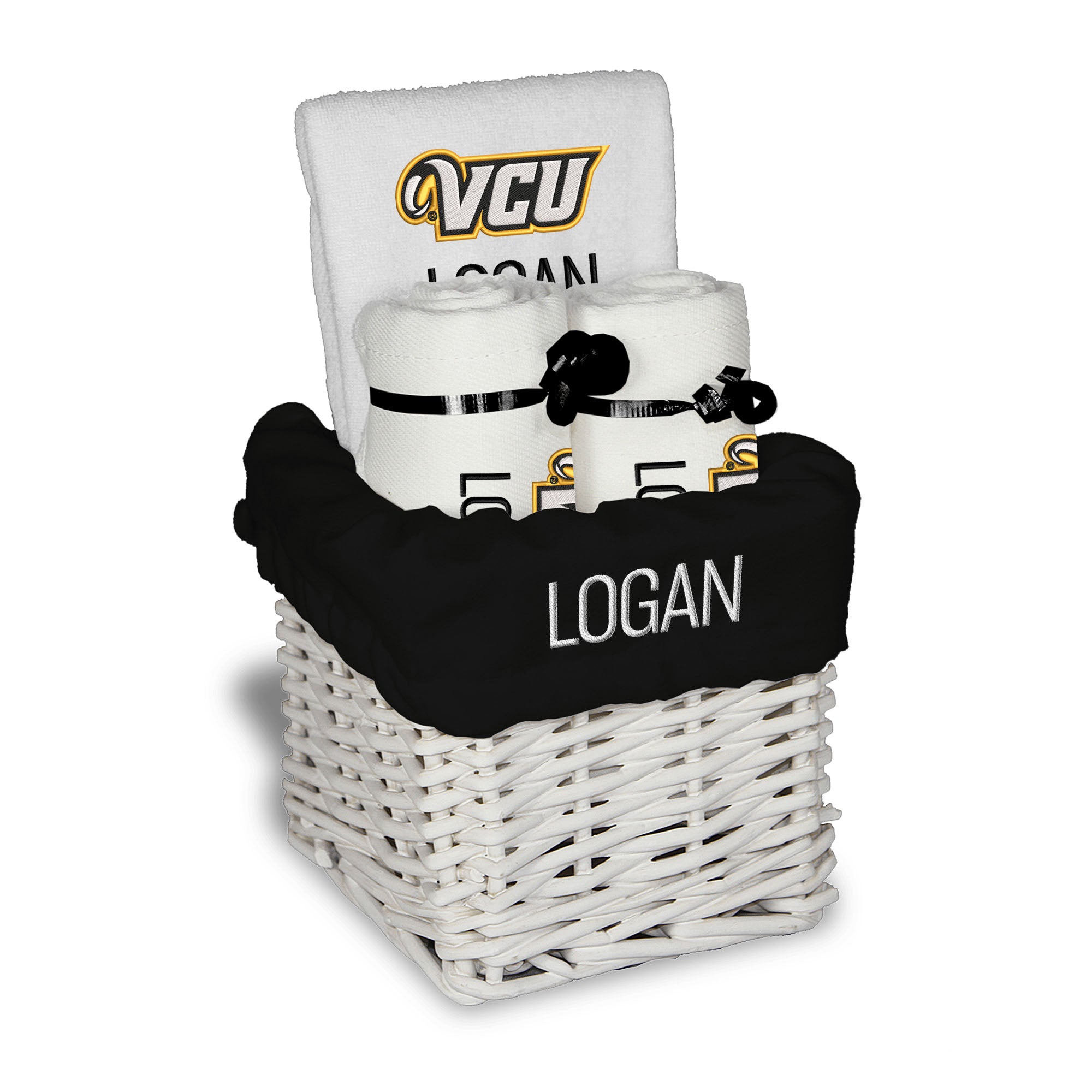 Our Personalized VCU Rams Small Gift Basket contains 3 of our best-selling items packaged in a white willow basket with a personalized cotton liner. Each basket holds 2 of our 100% cotton burp cloths and a 100% cotton terry pullover bib. each piece is embroidered with the official Rams logo and baby's name or nickname.
