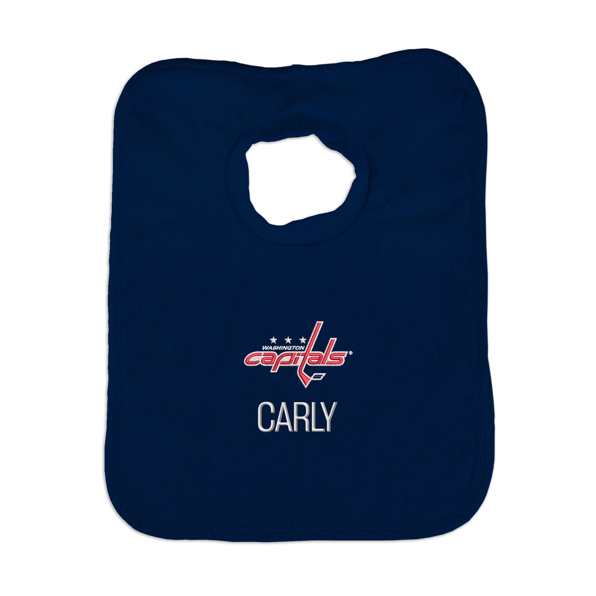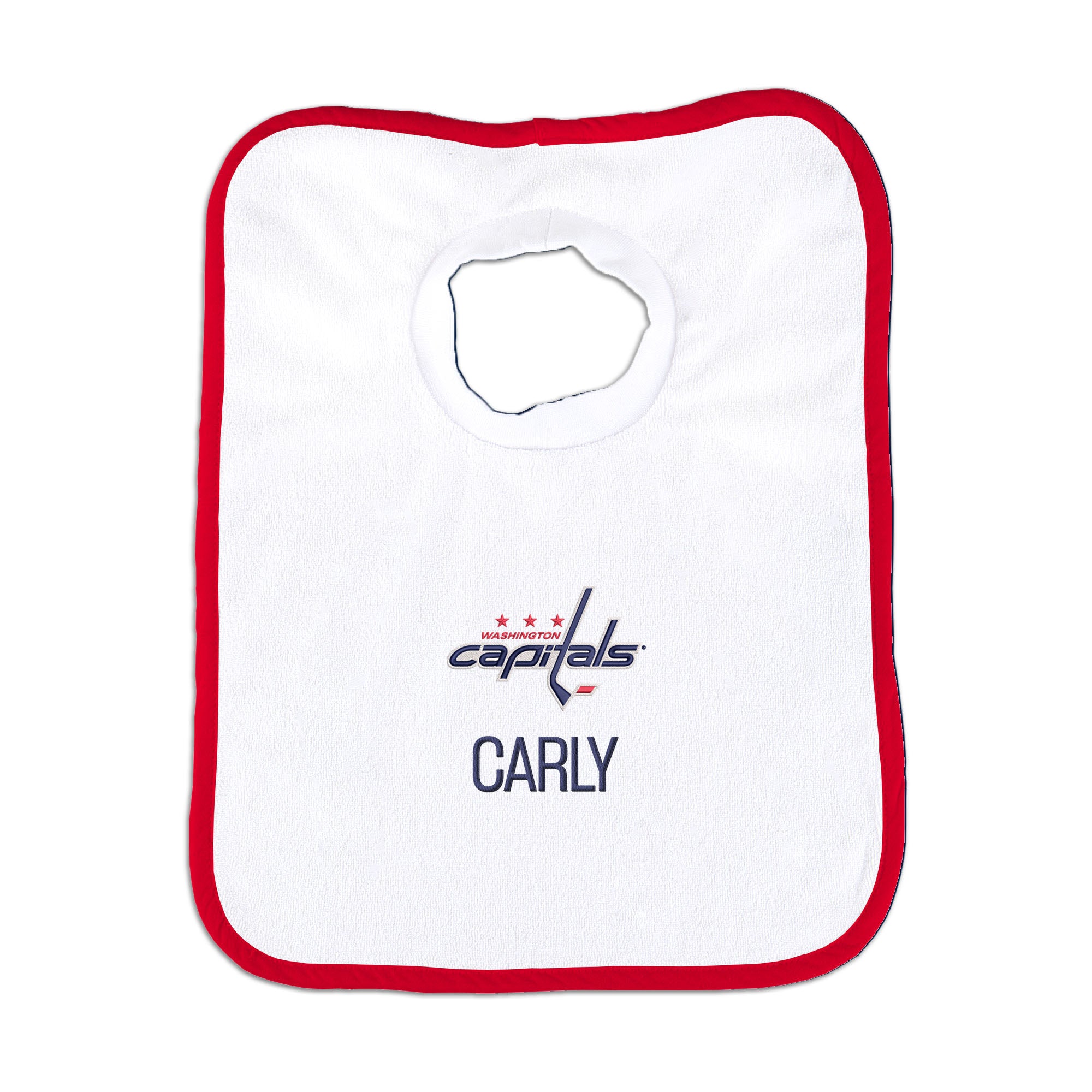 Our Personalized Washington Capitals Bib is the perfect accessory for every baby Capitals fan. The bib slips on easily over baby’s head, with a neck hole that is specially designed for extra comfort with super soft, gently gathered stretch cotton. Each bib is embroidered with the Capitals logo and your little one’s name or nickname. Makes a wonderful gift for new hockey babies and their families.
