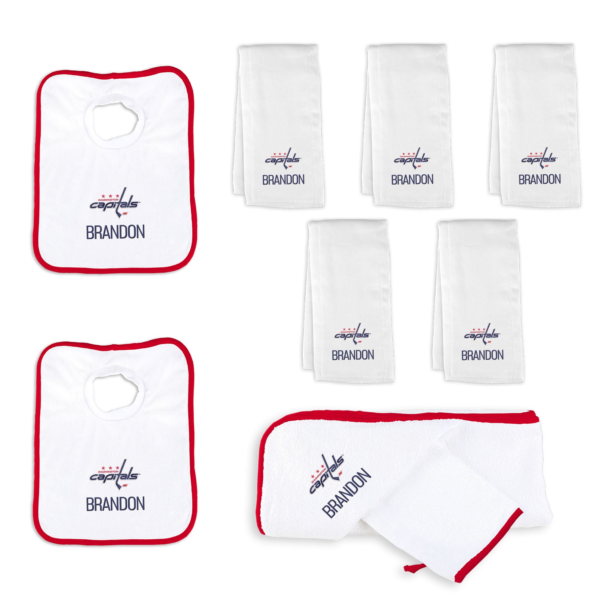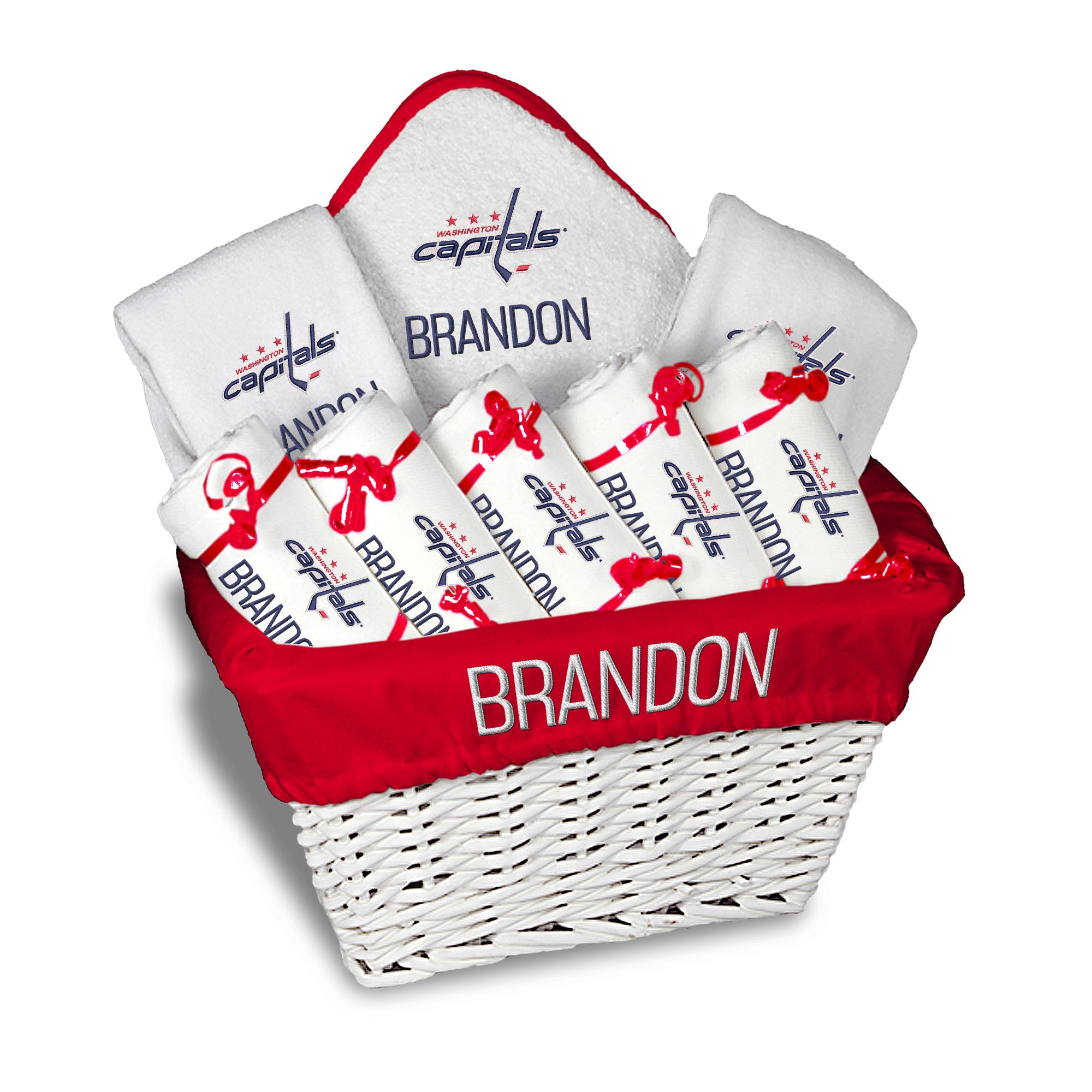 Our Personalized Washington Capitals Large Gift Basket contains an assortment of our best-selling items packaged in a white willow basket with a personalized cotton liner.  Each basket holds five of our 100% cotton burp cloths, two 100% cotton terry pullover bibs, and one 100% cotton terry hooded towel and wash mitt. The burp cloths, bibs and hooded towel are each embroidered with the Capitals logo and baby’s name or nickname; the basket liner is embroidered with the baby’s name.