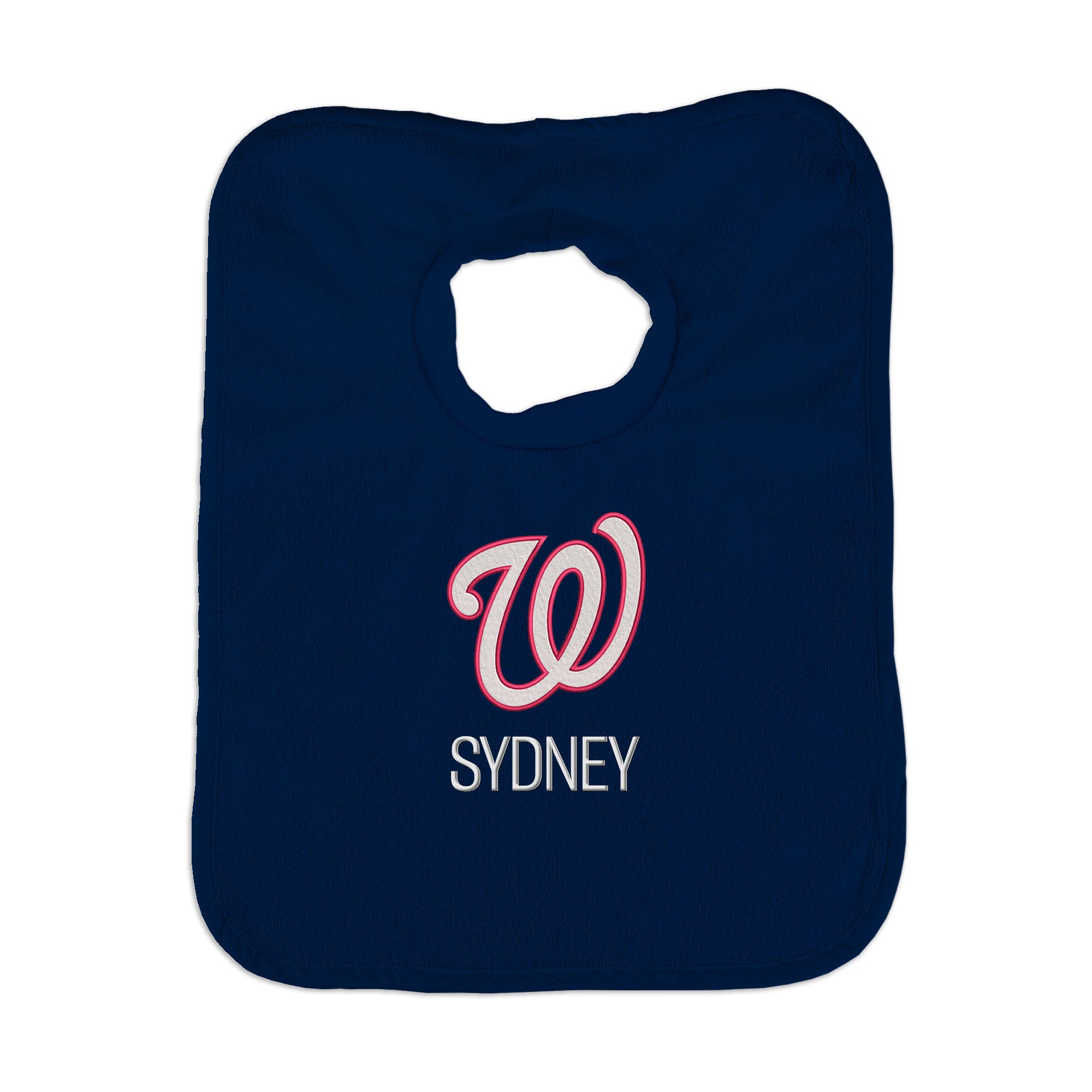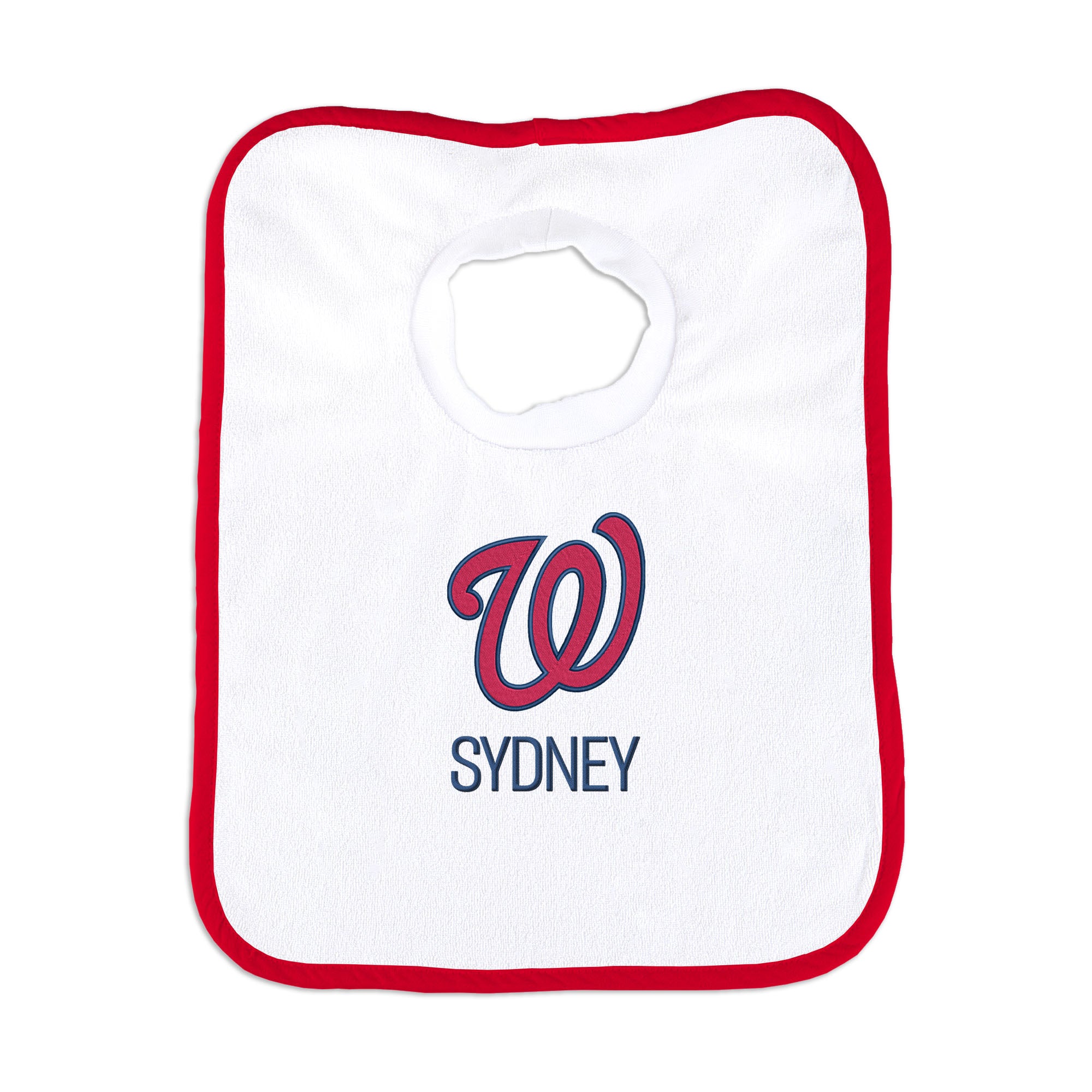 Enhanced with an embroidered Washington Nationals logo, this bib proudly displays your family's passion for the game. Additionally, personalize the bib with an embroidered name or phrase, adding a unique touch to your baby's Nationals-themed collection.