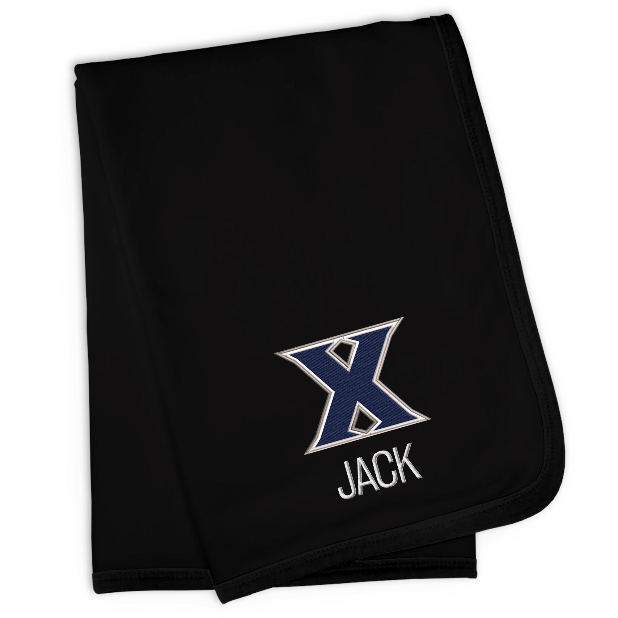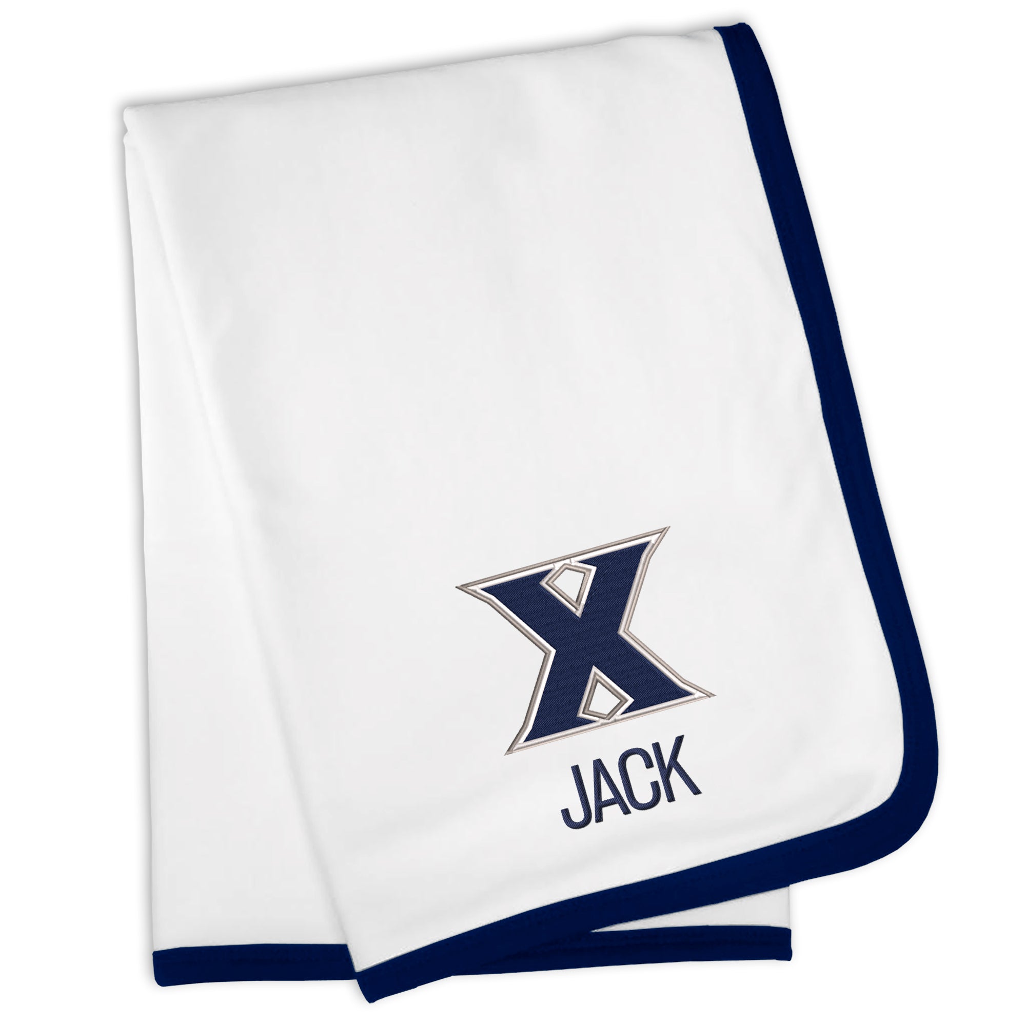 Our Personalized Xavier Musketeers Blanket is sized just right for a baby fan. Constructed from super soft 100% cotton jersey knit and trimmed in Musketeers team colors, this blanket is perfect for walks in the stroller or swaddling at bedtime. Each blanket is embroidered with the official Musketeers logo and your little one’s name or nickname.