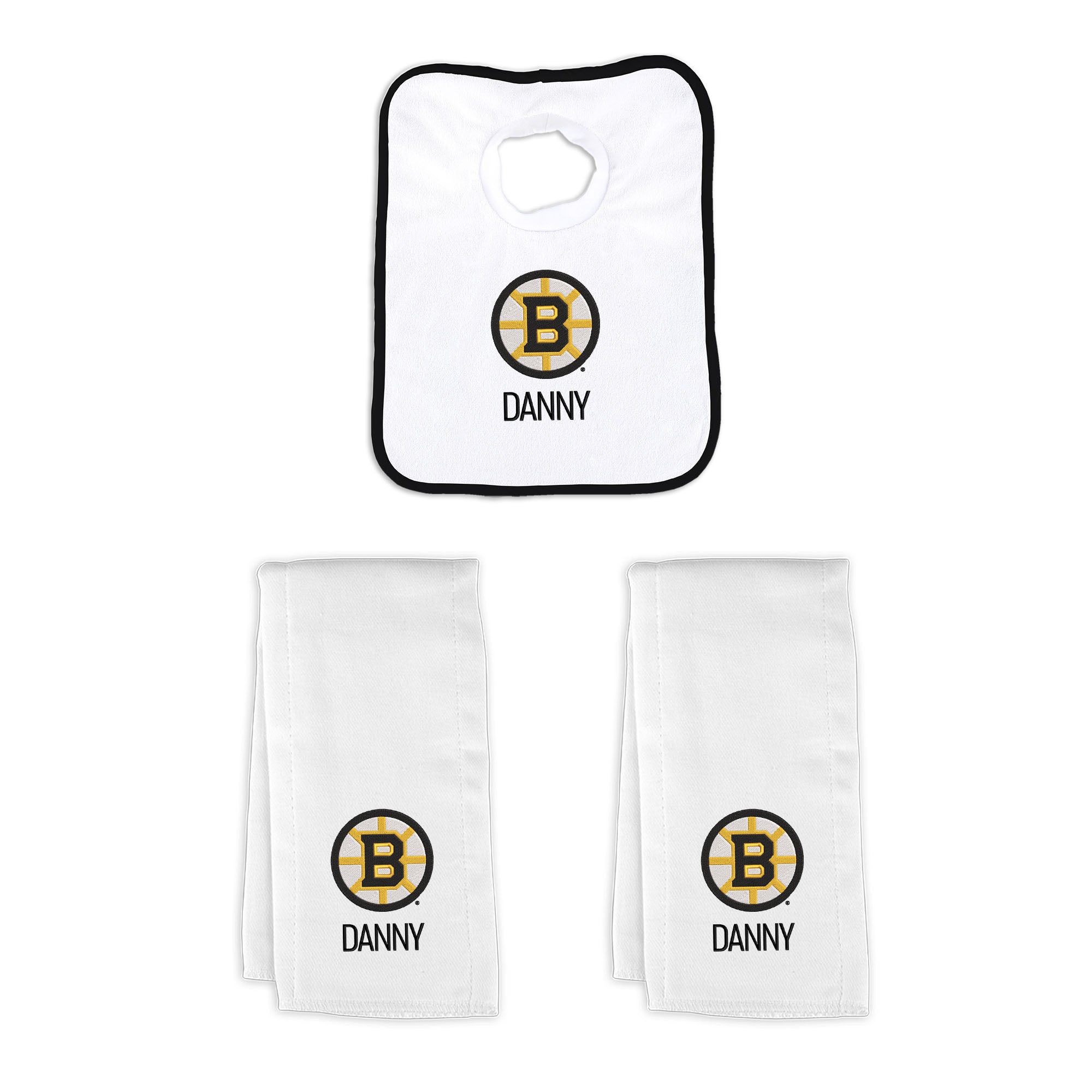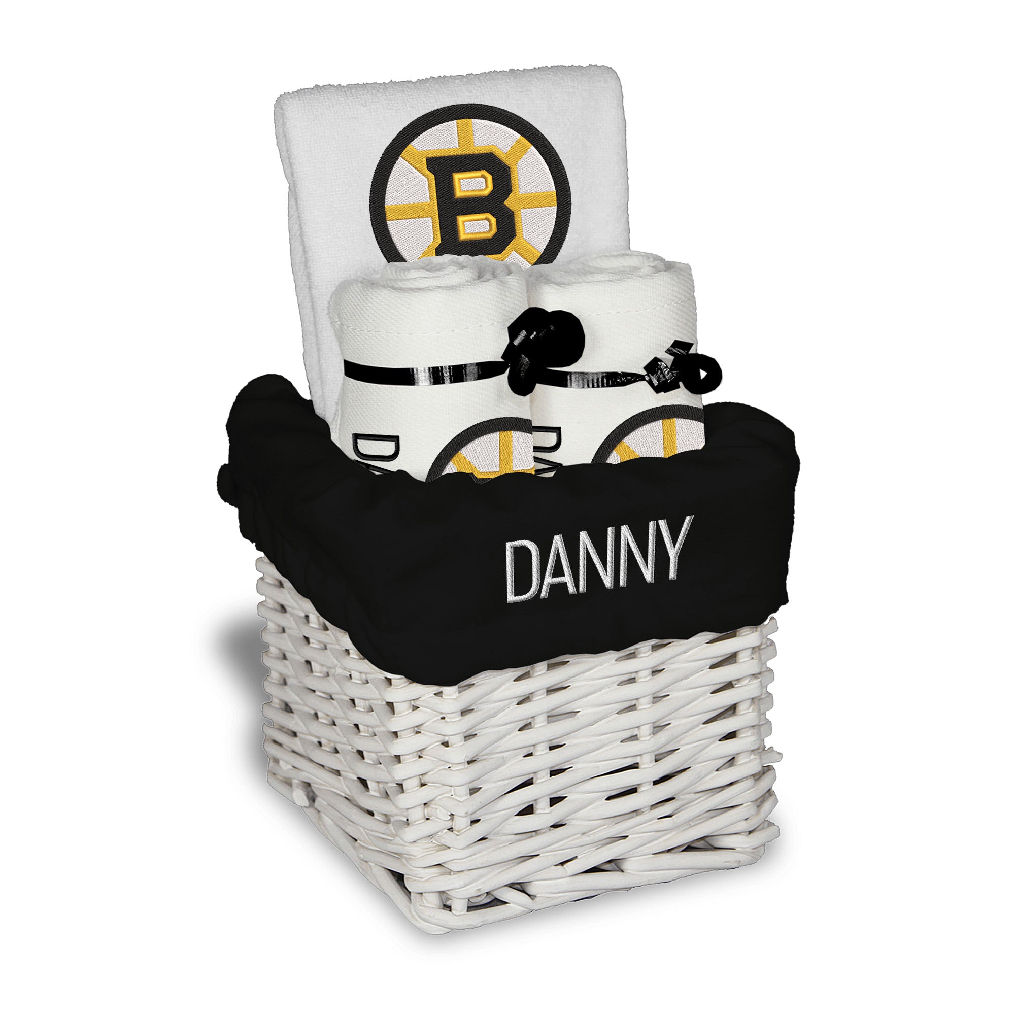 Our Personalized Boston Bruins Small Gift Basket contains 3 of our best-selling items packaged in a white willow basket with a personalized cotton liner. Each basket holds 2 of our 100% cotton burp cloths and a 100% cotton terry pullover bib. each piece is embroidered with the official Bruins logo and baby's name or nickname.