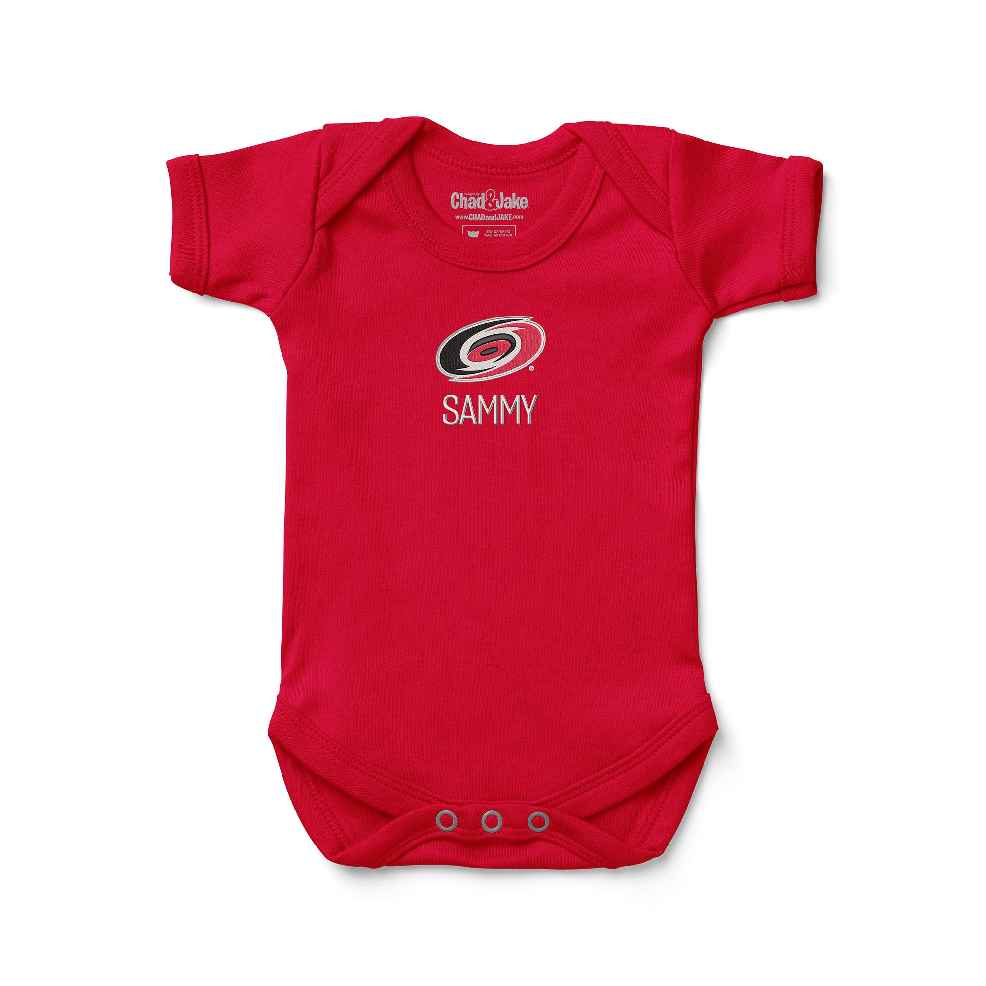 The bodysuit features an envelope neck for extra comfort and a three-snap closure for easy dressing and undressing. It is embroidered with the Carolina Hurricanes logo on the front and can be personalized with your child's name, initials, or nickname under the logo. This personalized bodysuit is the perfect way to show off your family's support for the Hurricanes and their "Take Warning" slogan.