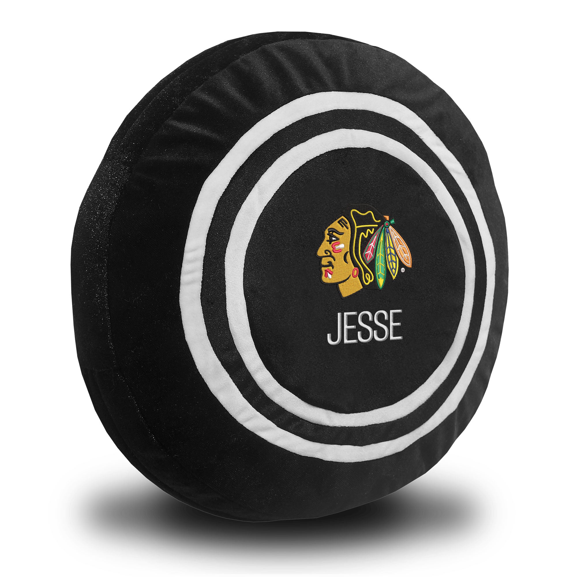 There is no better way to celebrate your team than with your very own oversized plush hockey puck! Measuring 13" tall, this plush puck is customized with your team's logo and a name or phrase beneath the logo! Add some Blackhawks spirit to the decor of a bedroom or playroom, which becomes a fun toy for children of any age. With a removable cover for easy cleaning, our Blavkhawks puck is great for years of fun and entertainment.