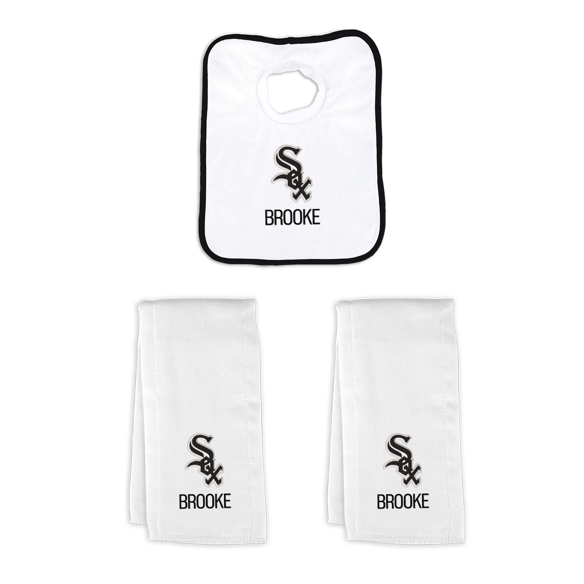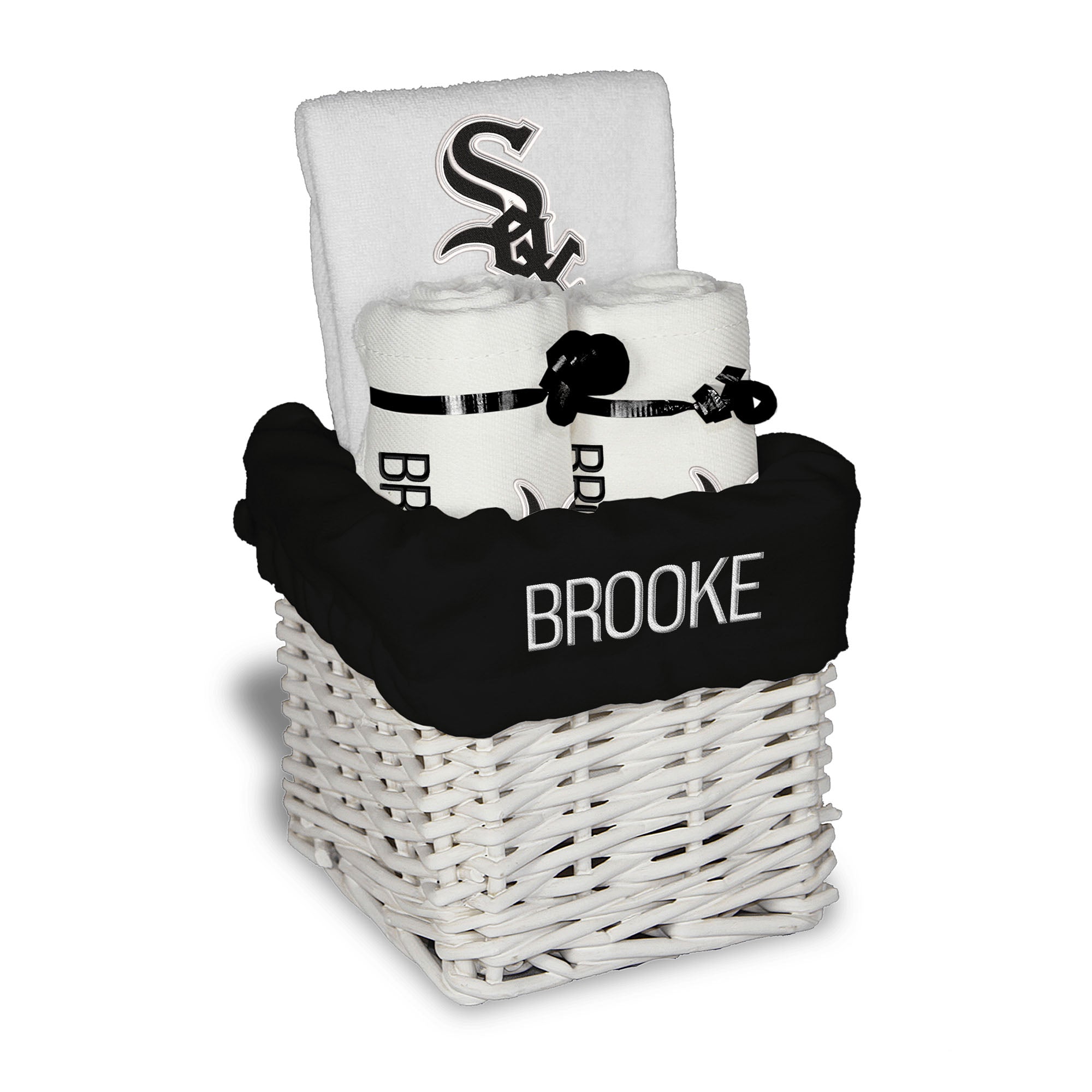 Our Personalized Chicago White Sox Small Gift Basket contains 3 of our best-selling items packaged in a white willow basket with a personalized cotton liner. Each basket holds 2 of our 100% cotton burp cloths and a 100% cotton terry pullover bib. each piece is embroidered with the official White Sox logo and baby's name or nickname.