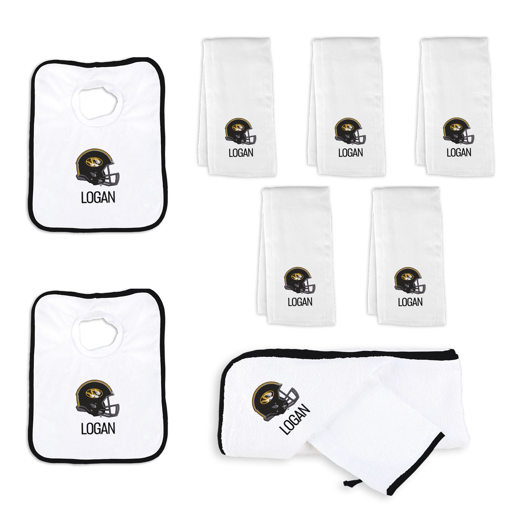 Our Personalized Missouri Tigers Large Gift Basket contains an assortment of our best-selling items packaged in a white willow basket with a personalized cotton liner.  Each basket holds five of our 100% cotton burp cloths, two 100% cotton terry pullover bibs, and one 100% cotton terry hooded towel and wash mitt. The burp cloths, bibs and hooded towel are each embroidered with the Tigers logo and baby’s name or nickname; the basket liner is embroidered with the baby’s name.