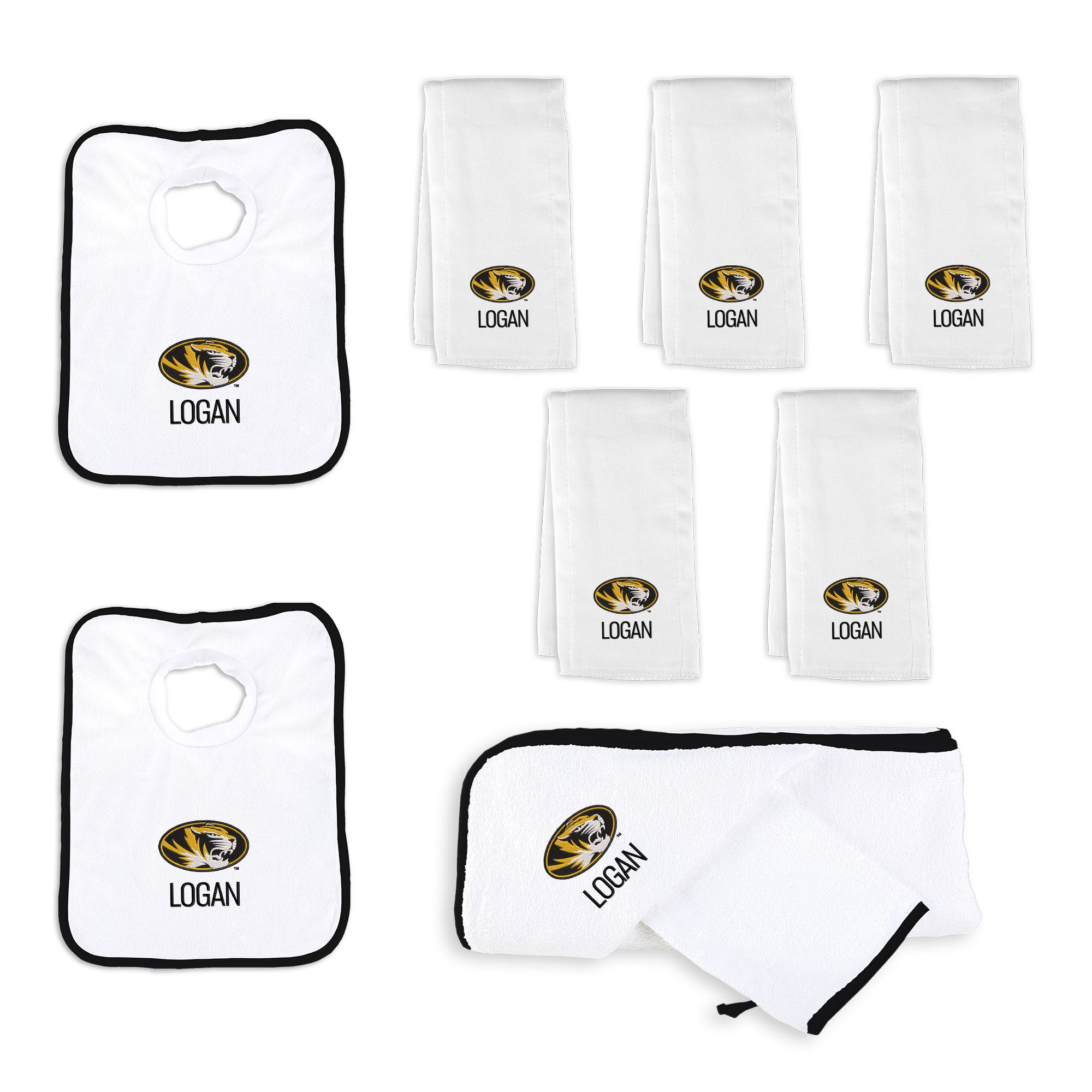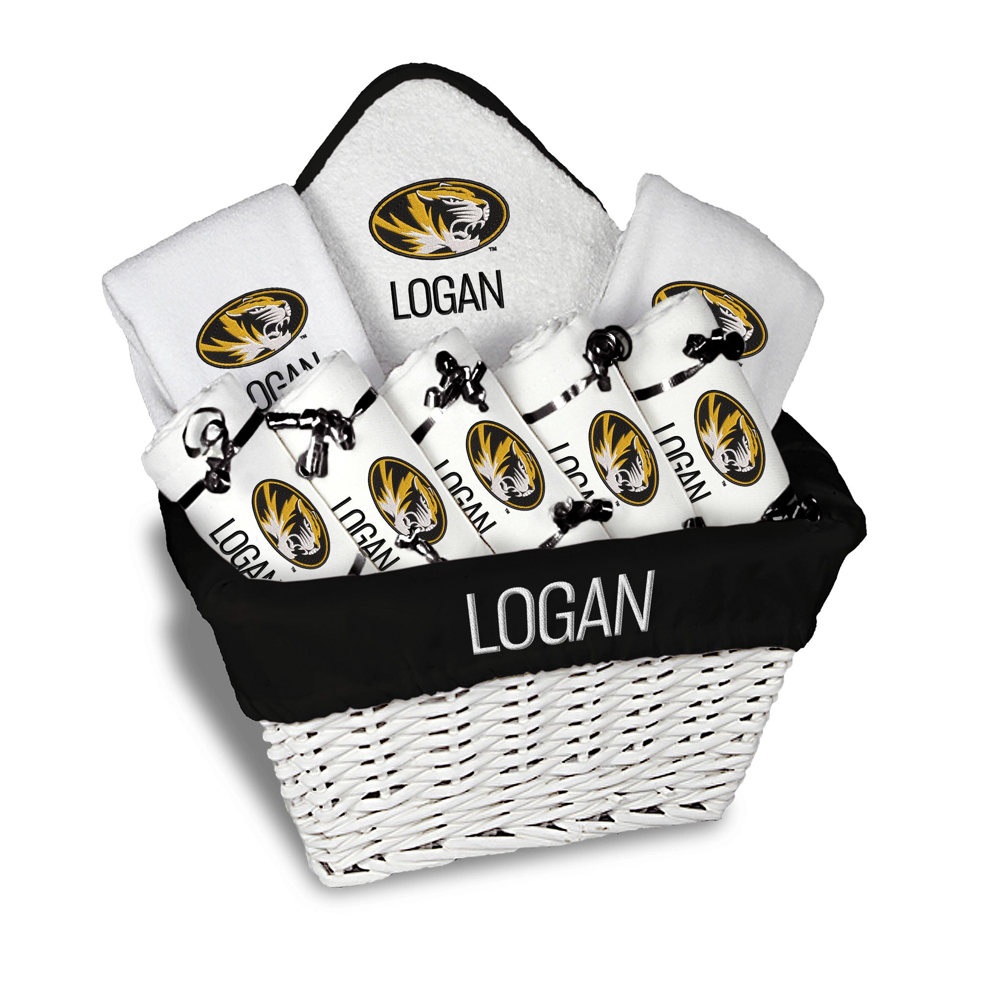 Our Personalized Missouri Tigers Large Gift Basket contains an assortment of our best-selling items packaged in a white willow basket with a personalized cotton liner. Each basket holds five of our 100% cotton burp cloths, two 100% cotton terry pullover bibs, and one 100% cotton terry hooded towel and wash mitt. The burp cloths, bibs and hooded towel are each embroidered with the Tigers logo and baby’s name or nickname; the basket liner is embroidered with the baby’s name.