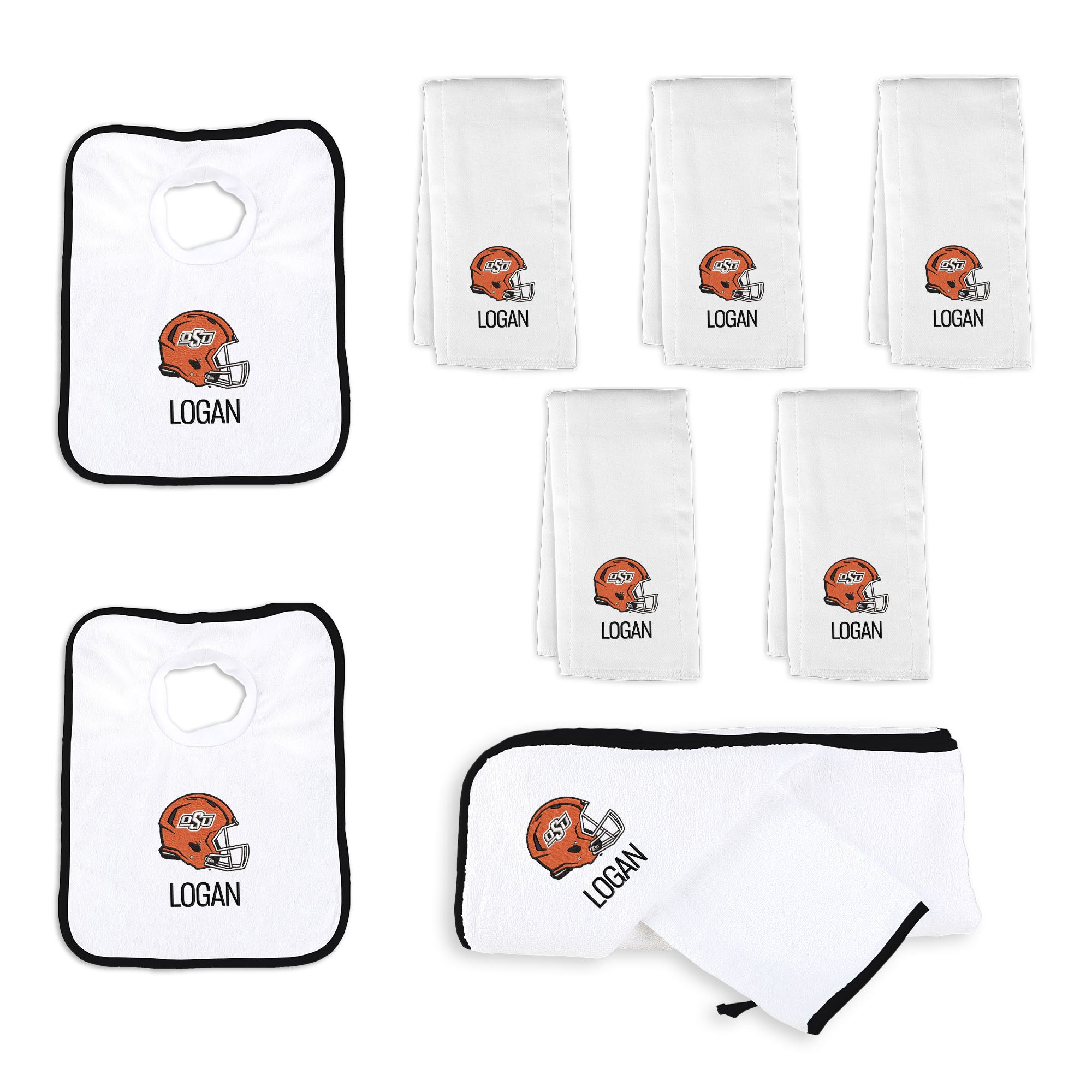 Our Personalized Oklahoma State Cowboys Large Gift Basket contains an assortment of our best-selling items packaged in a white willow basket with a personalized cotton liner.  Each basket holds five of our 100% cotton burp cloths, two 100% cotton terry pullover bibs, and one 100% cotton terry hooded towel and wash mitt. The burp cloths, bibs and hooded towel are each embroidered with the Cowboys logo and baby’s name or nickname; the basket liner is embroidered with the baby’s name.