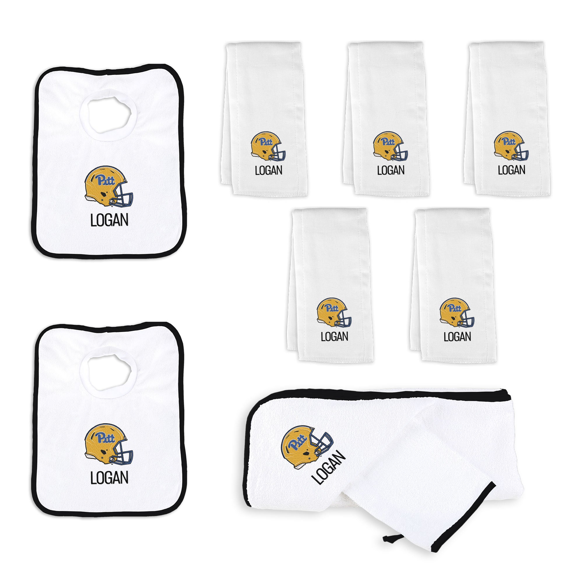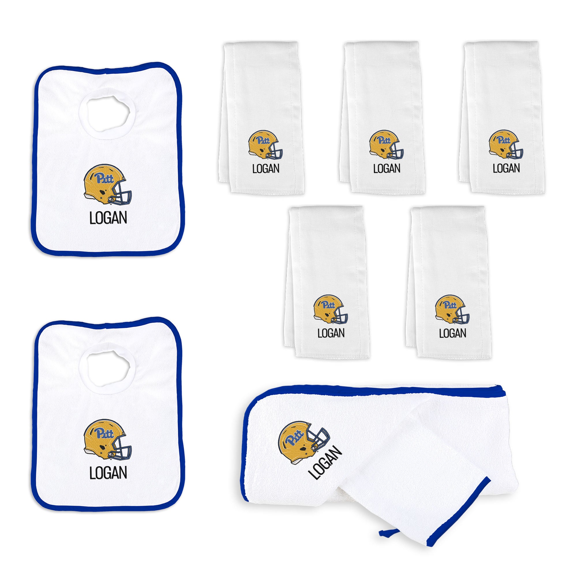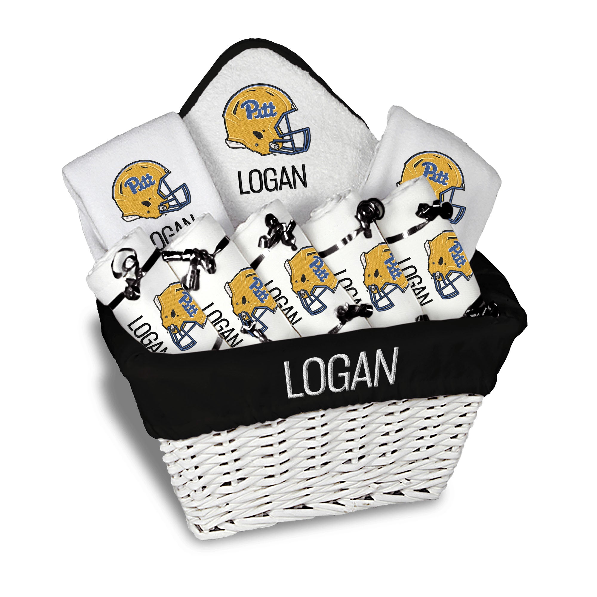 Our Personalized Pitt Panthers Large Gift Basket contains an assortment of our best-selling items packaged in a white willow basket with a personalized cotton liner. Each basket holds five of our 100% cotton burp cloths, two 100% cotton terry pullover bibs, and one 100% cotton terry hooded towel and wash mitt. The burp cloths, bibs and hooded towel are each embroidered with the Panthers logo and baby’s name or nickname; the basket liner is embroidered with the baby’s name.