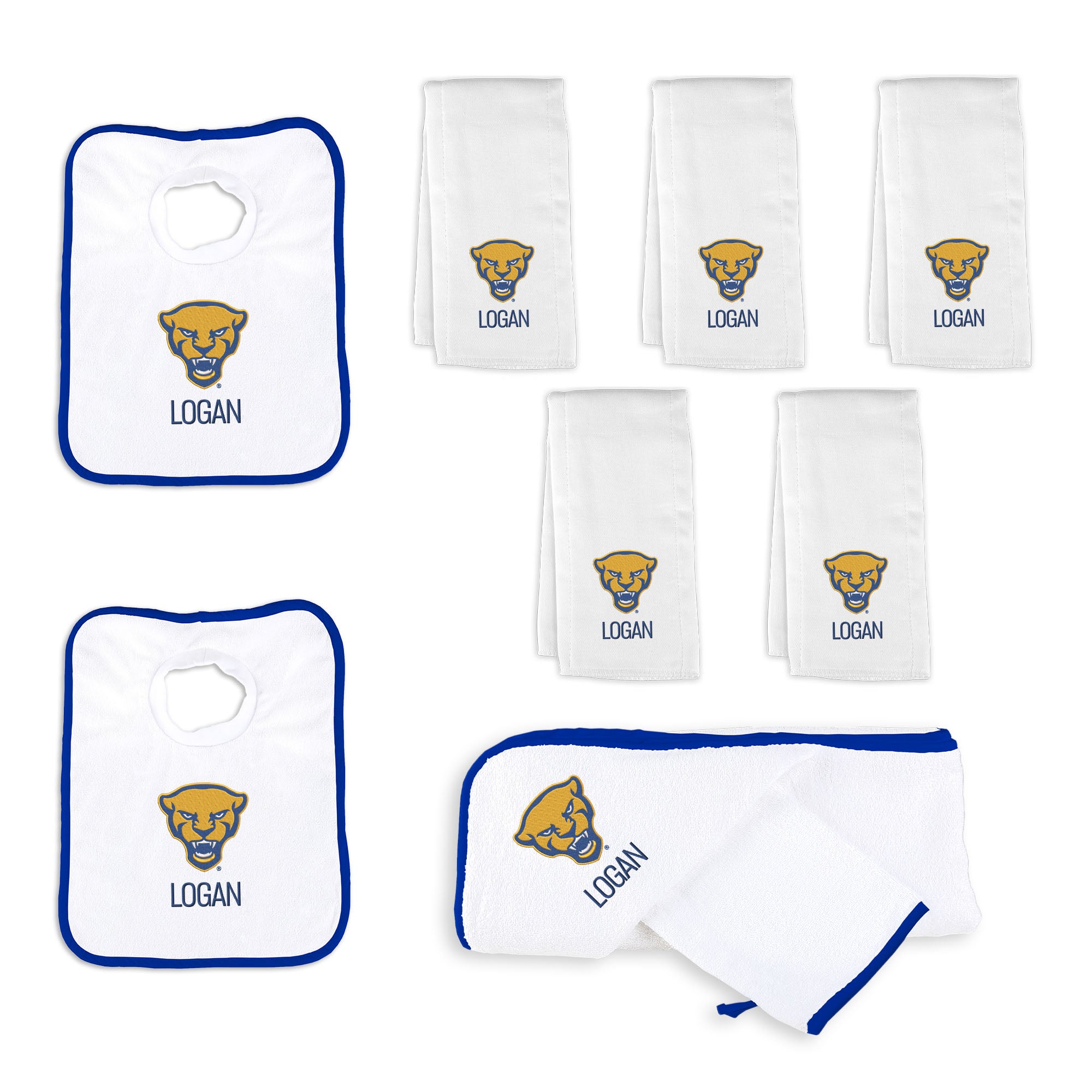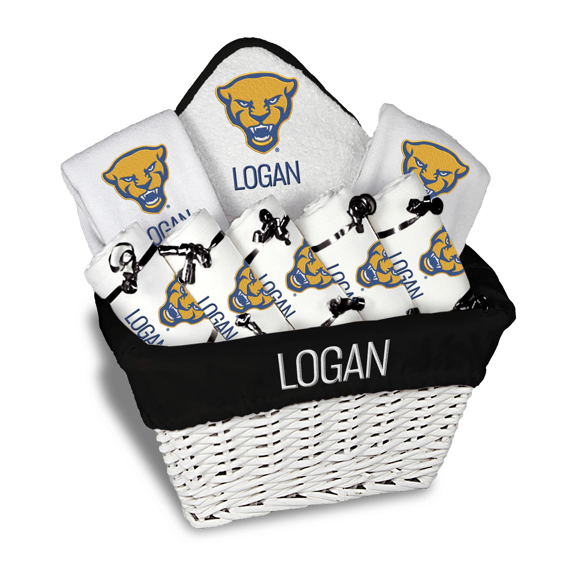 Our Personalized Pitt Panthers Large Gift Basket contains an assortment of our best-selling items packaged in a white willow basket with a personalized cotton liner.  Each basket holds five of our 100% cotton burp cloths, two 100% cotton terry pullover bibs, and one 100% cotton terry hooded towel and wash mitt. The burp cloths, bibs and hooded towel are each embroidered with the Panthers logo and baby’s name or nickname; the basket liner is embroidered with the baby’s name.