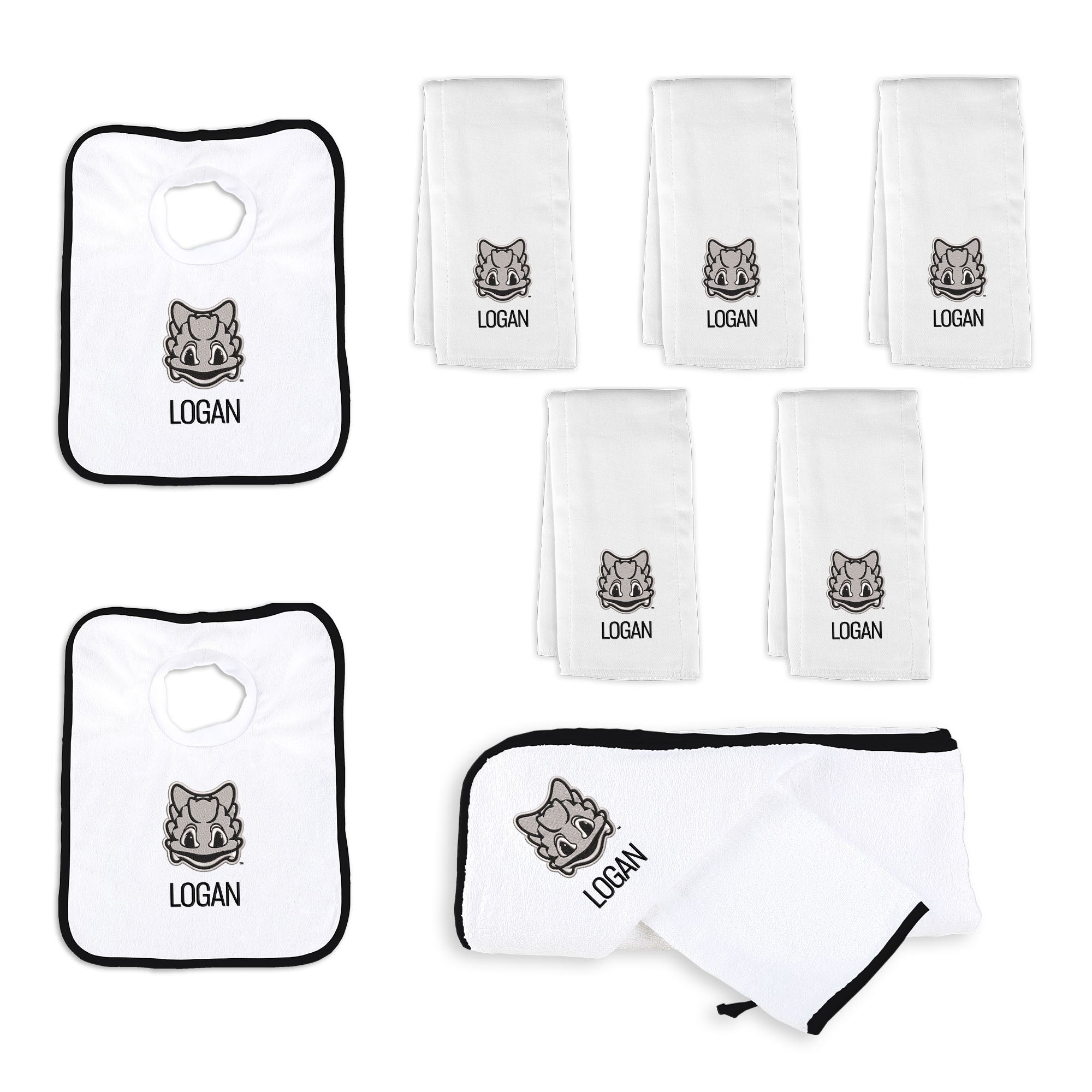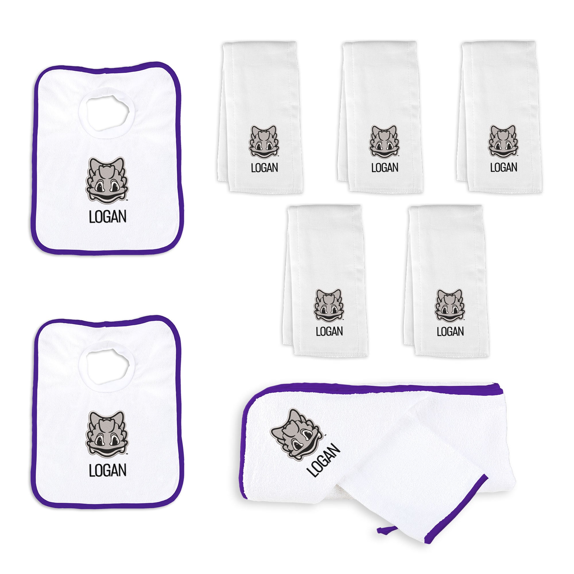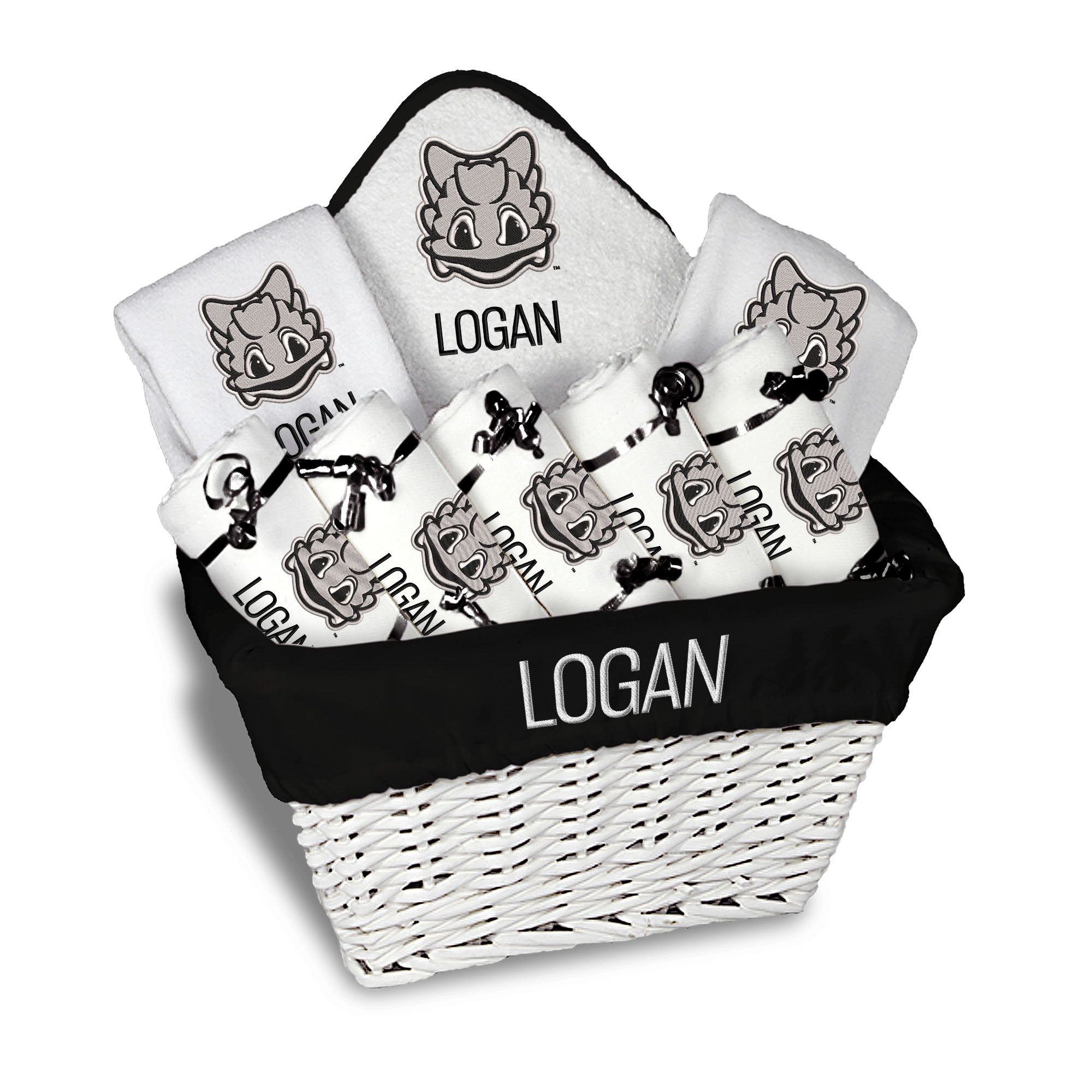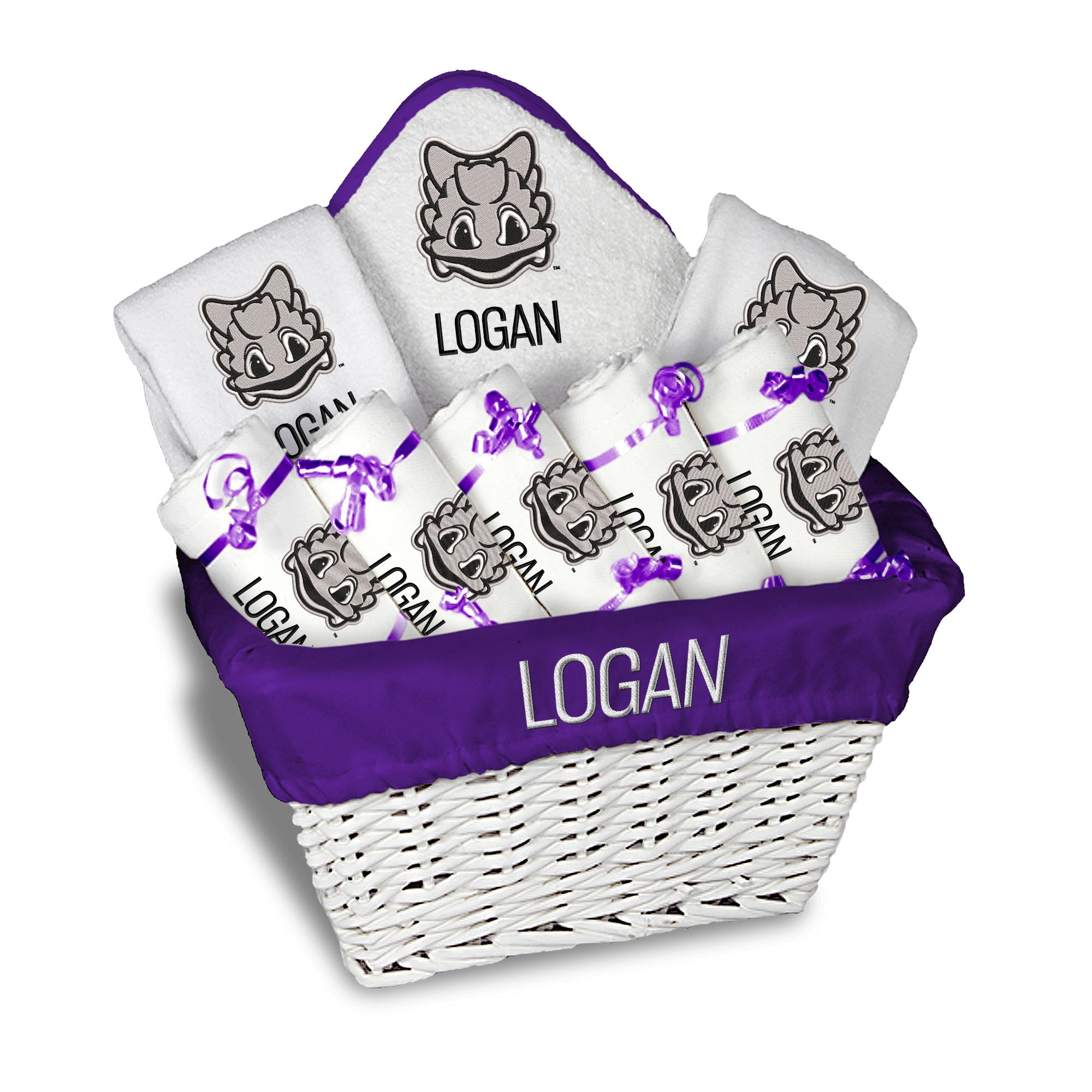 Our Personalized TCU Horned Frogs Large Gift Basket contains an assortment of our best-selling items packaged in a white willow basket with a personalized cotton liner.  Each basket holds five of our 100% cotton burp cloths, two 100% cotton terry pullover bibs, and one 100% cotton terry hooded towel and wash mitt. The burp cloths, bibs and hooded towel are each embroidered with the Horned Frogs logo and baby’s name or nickname; the basket liner is embroidered with the baby’s name.