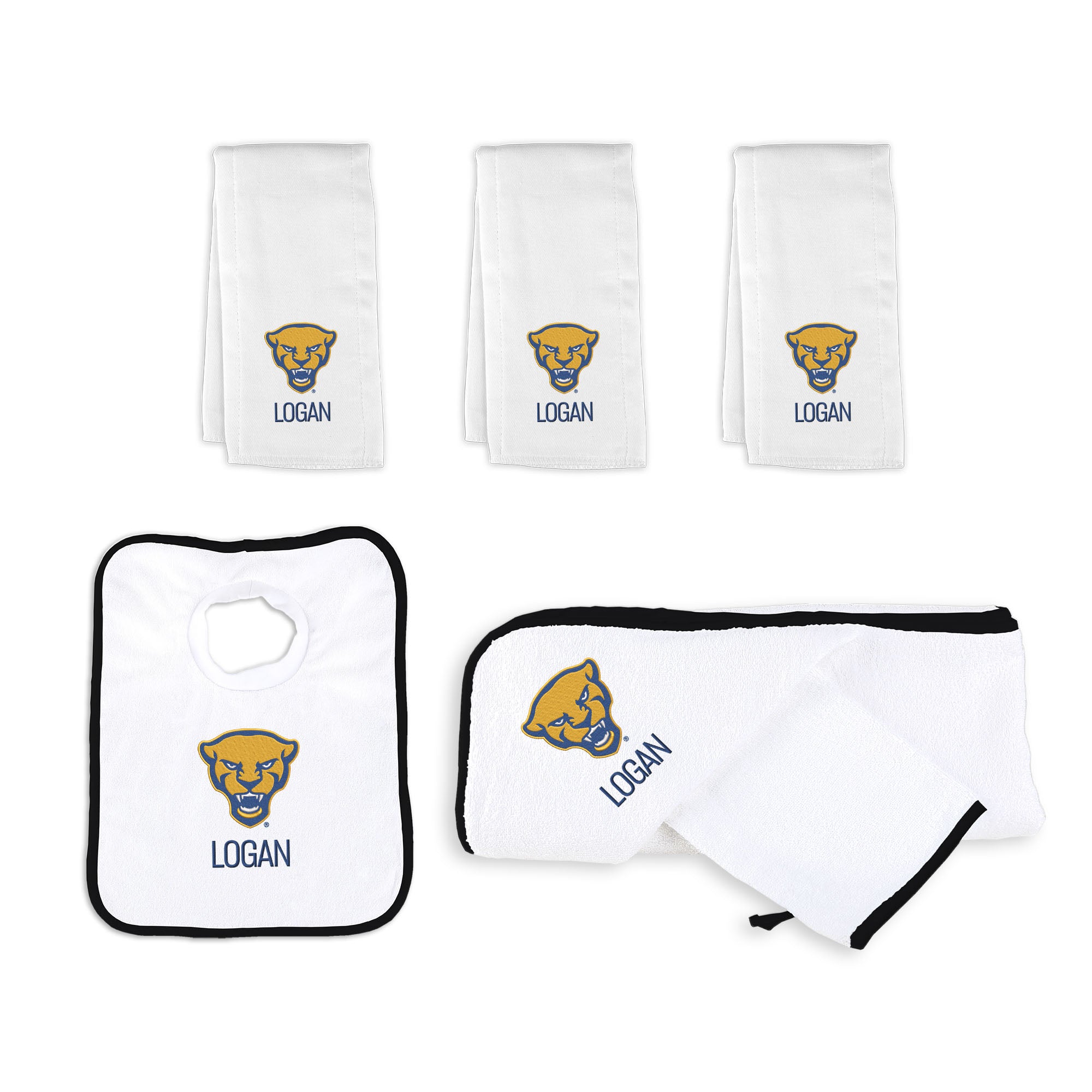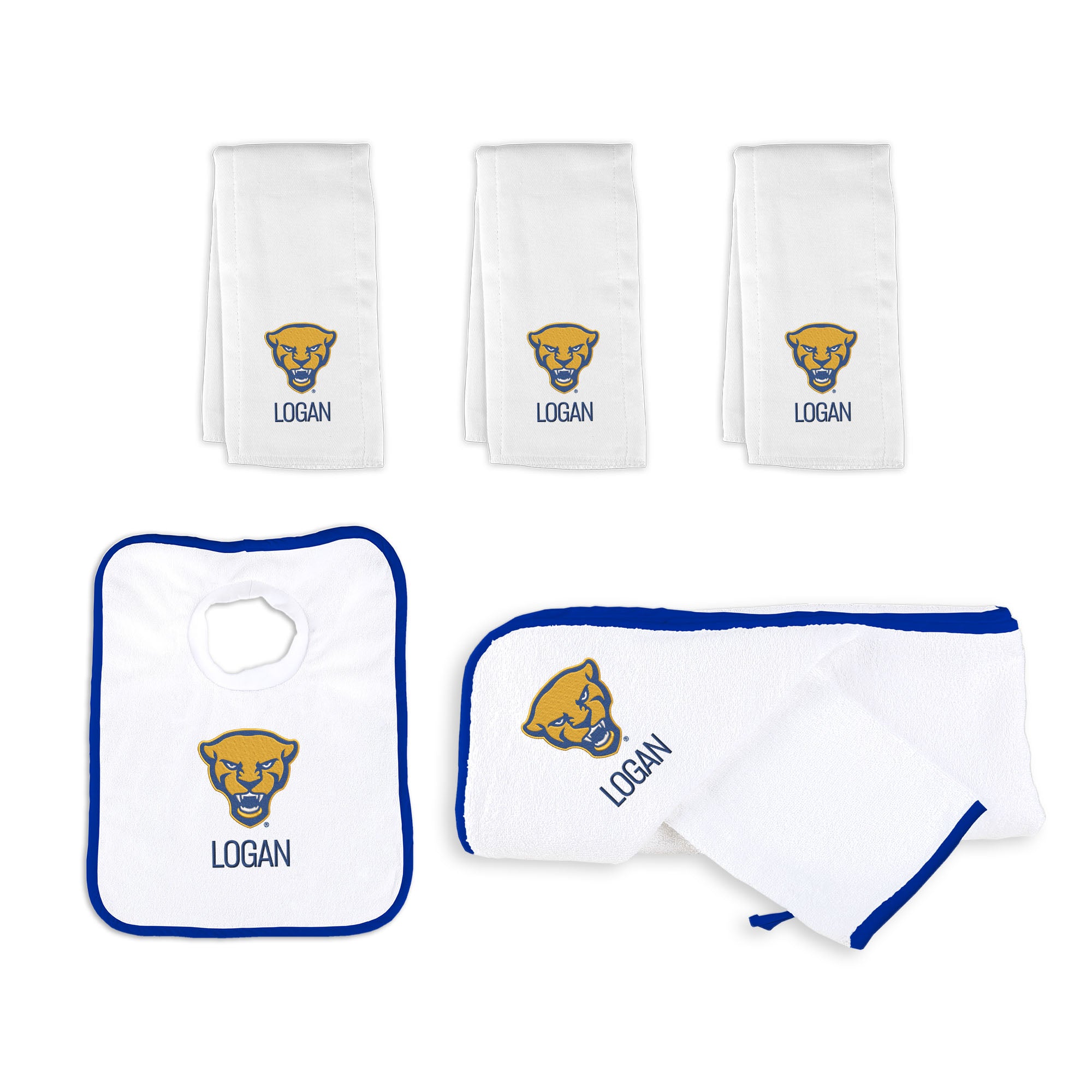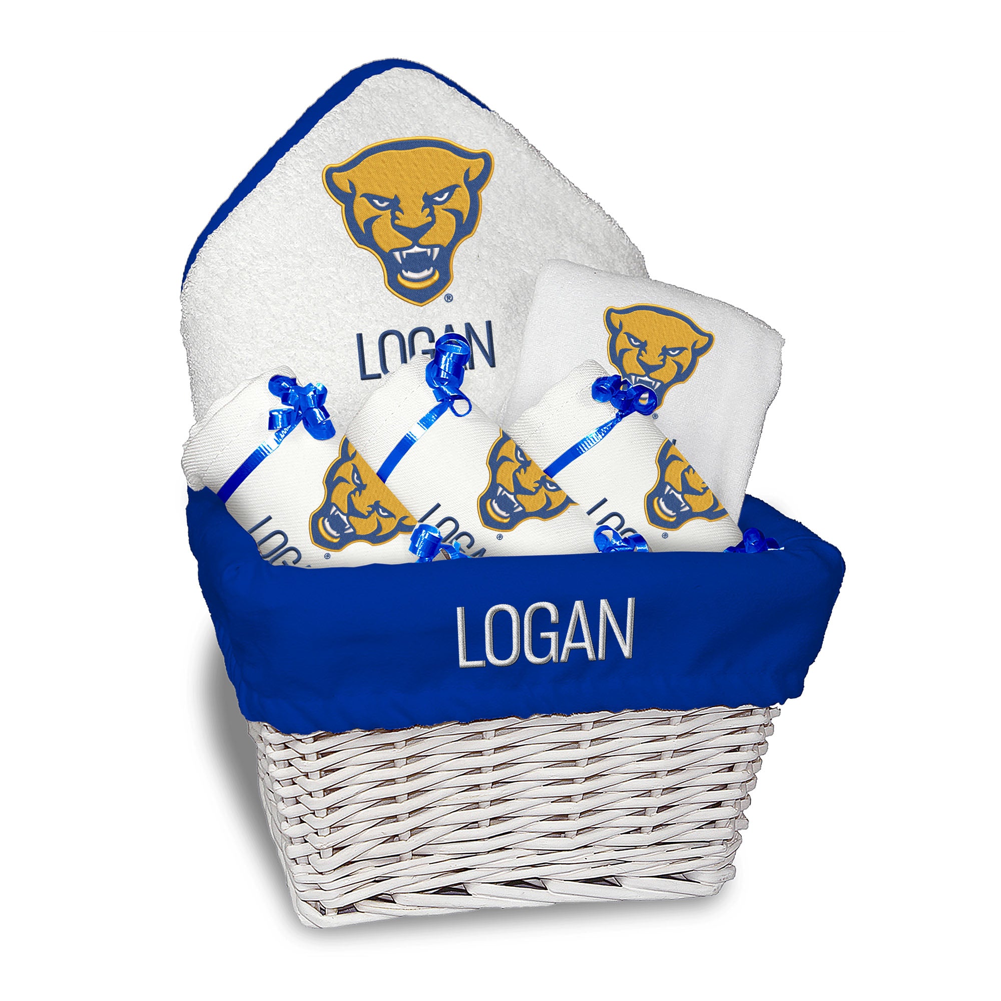 Our Personalized Pitt Panthers Medium Gift Basket contains an assortment of our best-selling items packaged in a white willow basket with a personalized cotton liner.  Each basket holds 3 of our 100% cotton burp cloths, one 100% cotton terry pullover bib, and one 100% cotton terry hooded towel and wash mitt. The burp cloths, bib and hooded towel are each embroidered with the Panthers logo and baby’s name or nickname; the basket liner is embroidered with the baby’s name.
