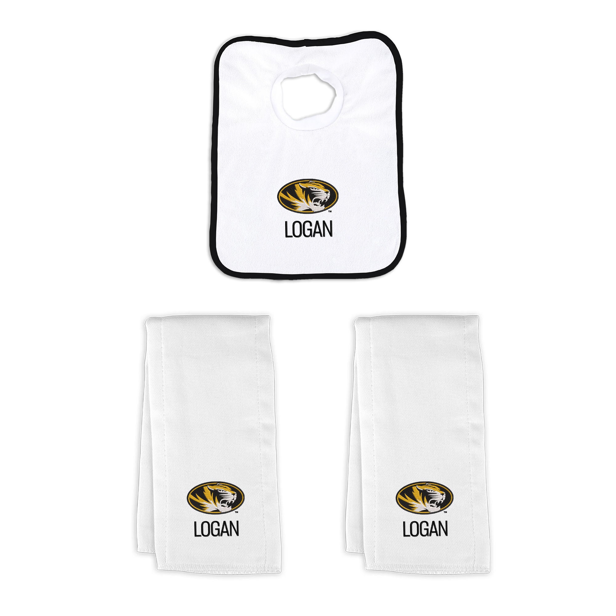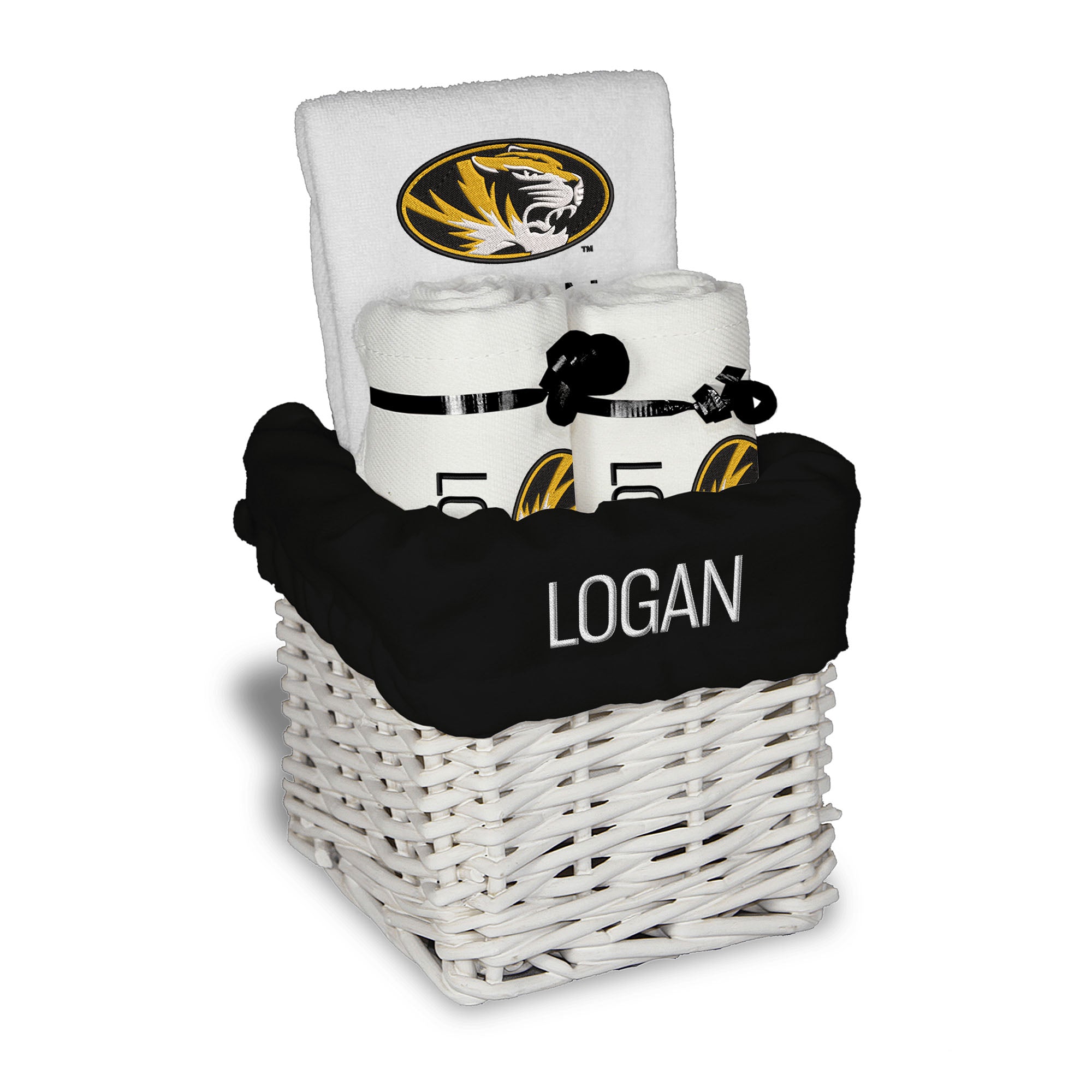 Our Personalized Missouri Tigers Small Gift Basket contains 3 of our best-selling items packaged in a white willow basket with a personalized cotton liner.  Each basket holds 2 of our 100% cotton burp cloths and a 100% cotton terry pullover bib. each piece is embroidered with the official Tigers logo and baby's name or nickname.