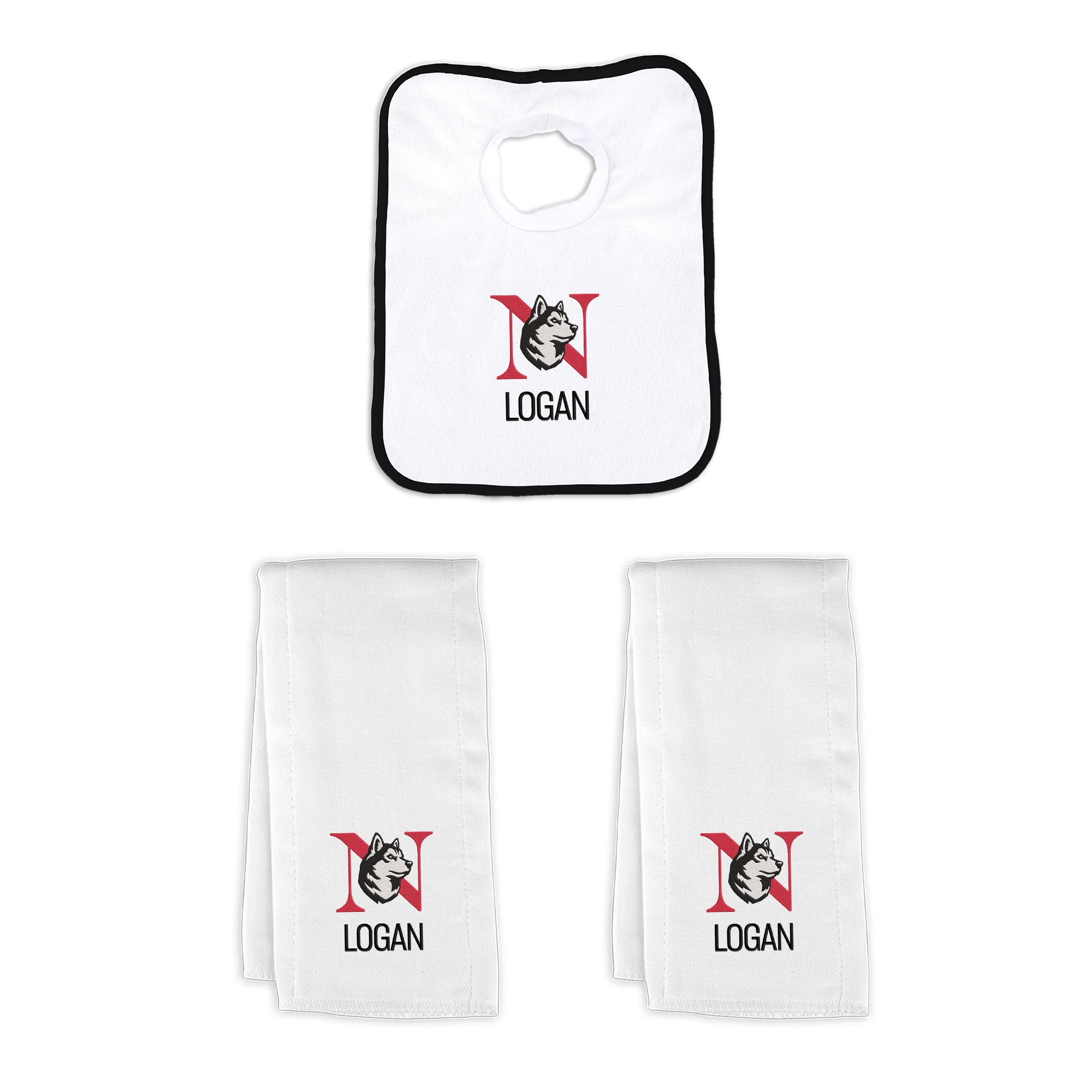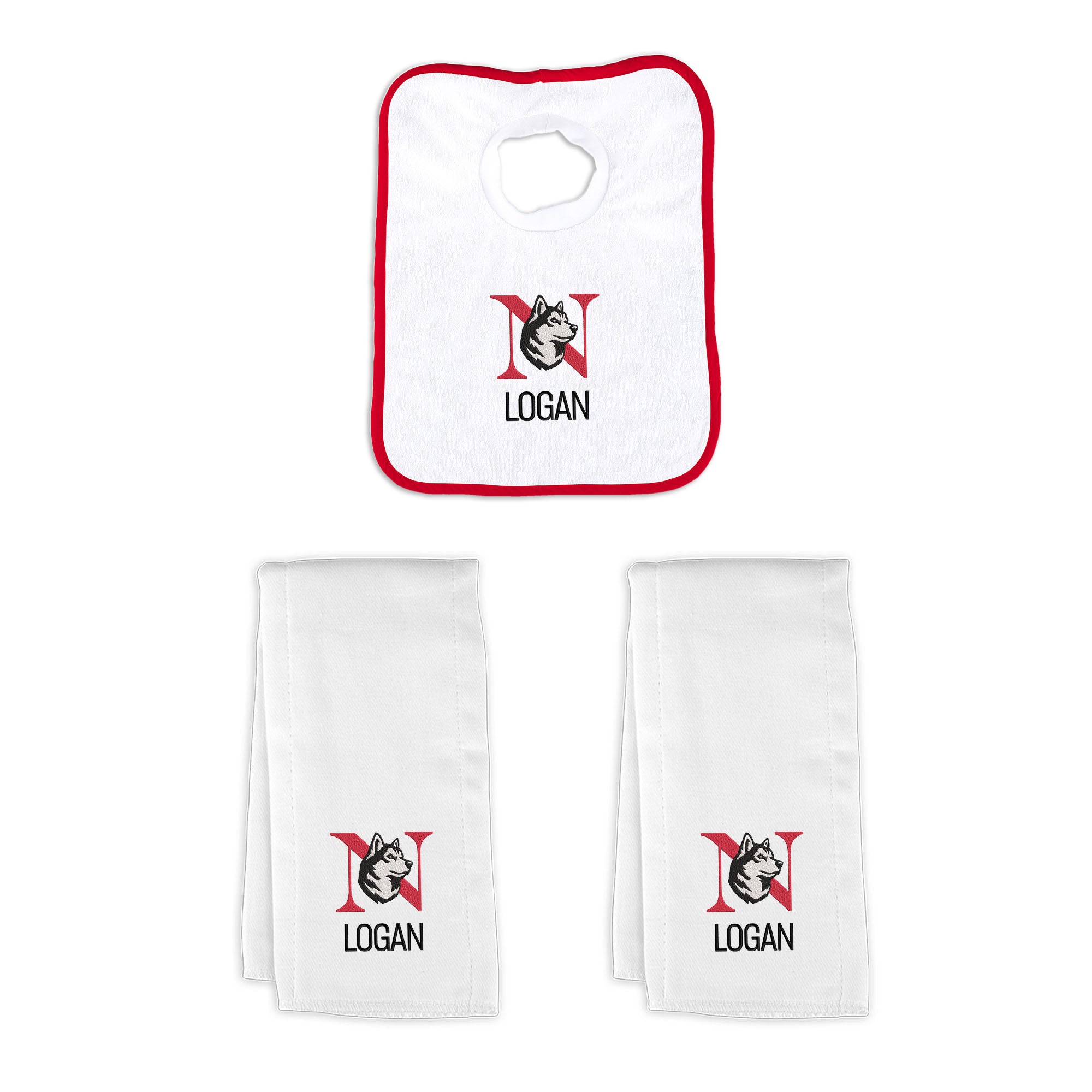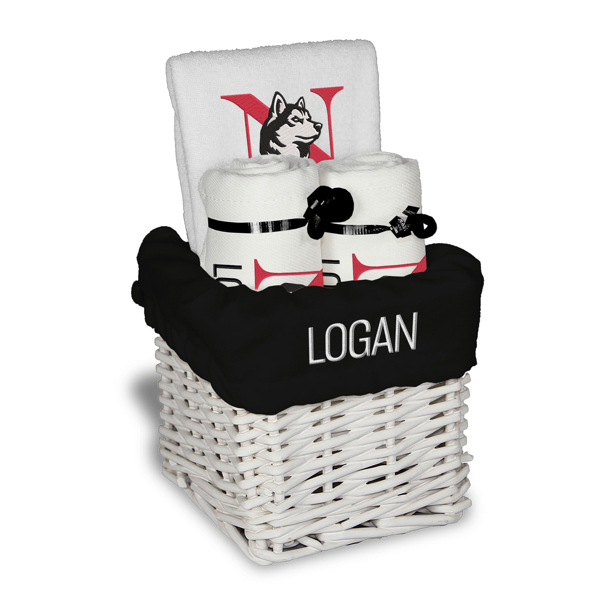 Our Personalized Northeastern Huskies Small Gift Basket contains 3 of our best-selling items packaged in a white willow basket with a personalized cotton liner.  Each basket holds 2 of our 100% cotton burp cloths and a 100% cotton terry pullover bib. each piece is embroidered with the official Huskies logo and baby's name or nickname.