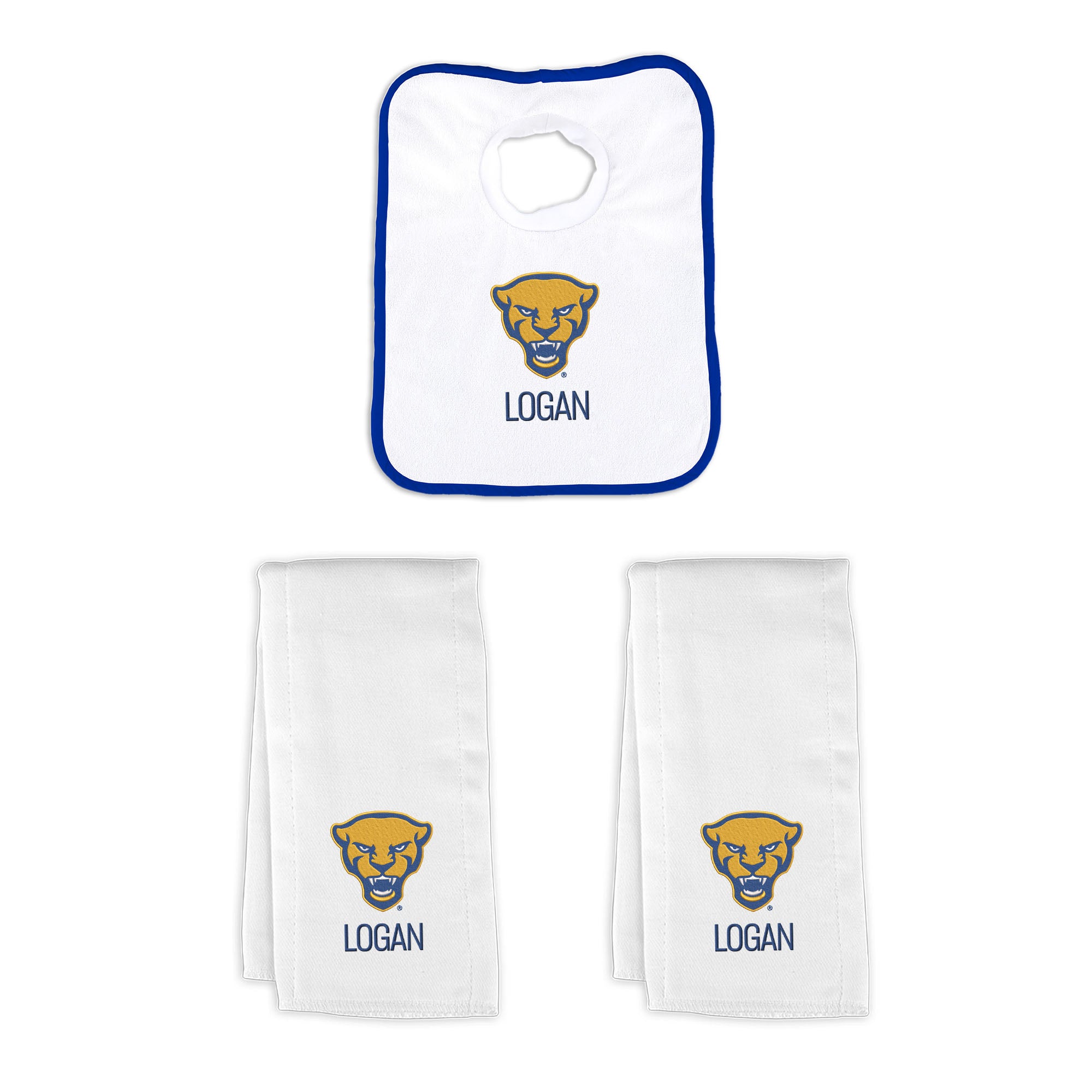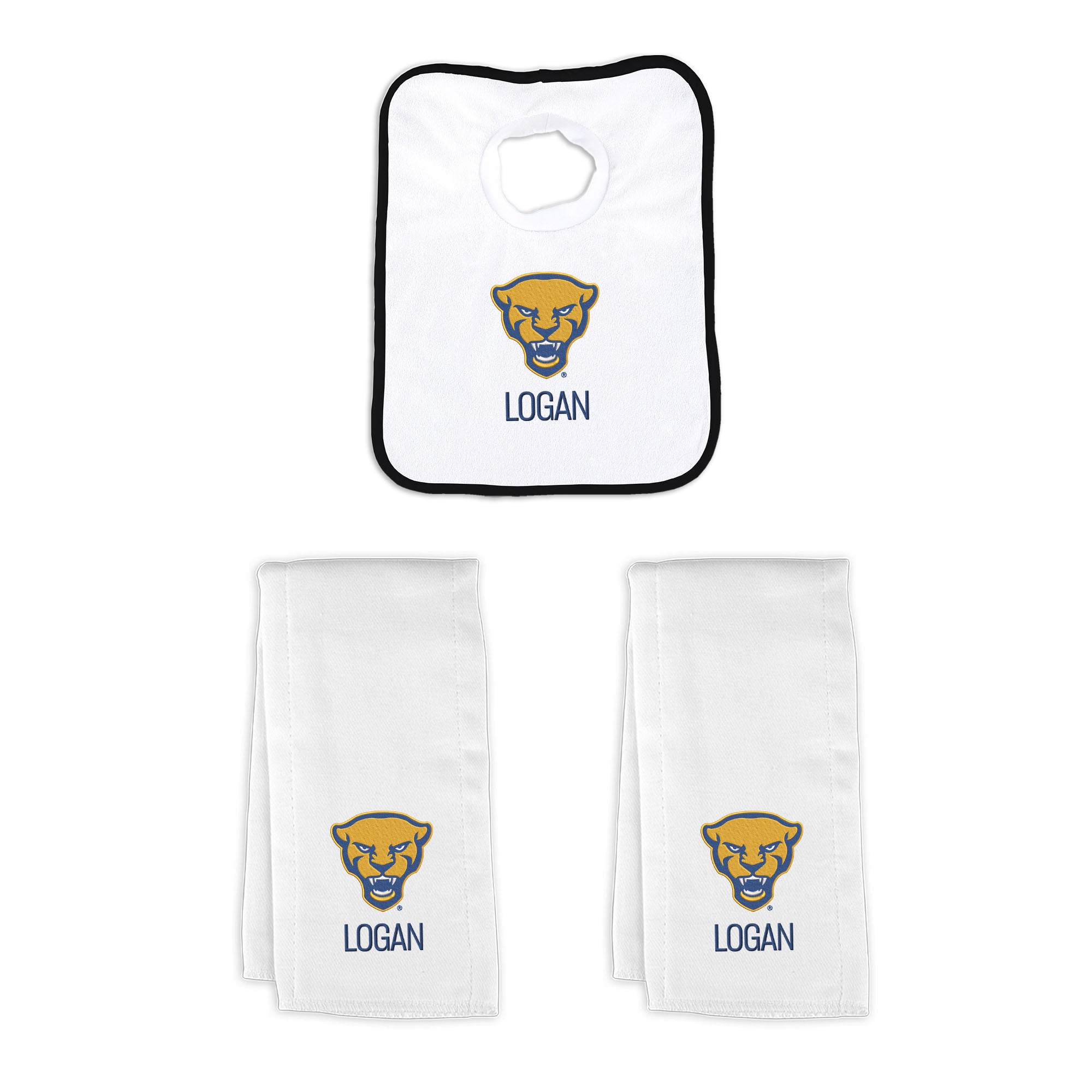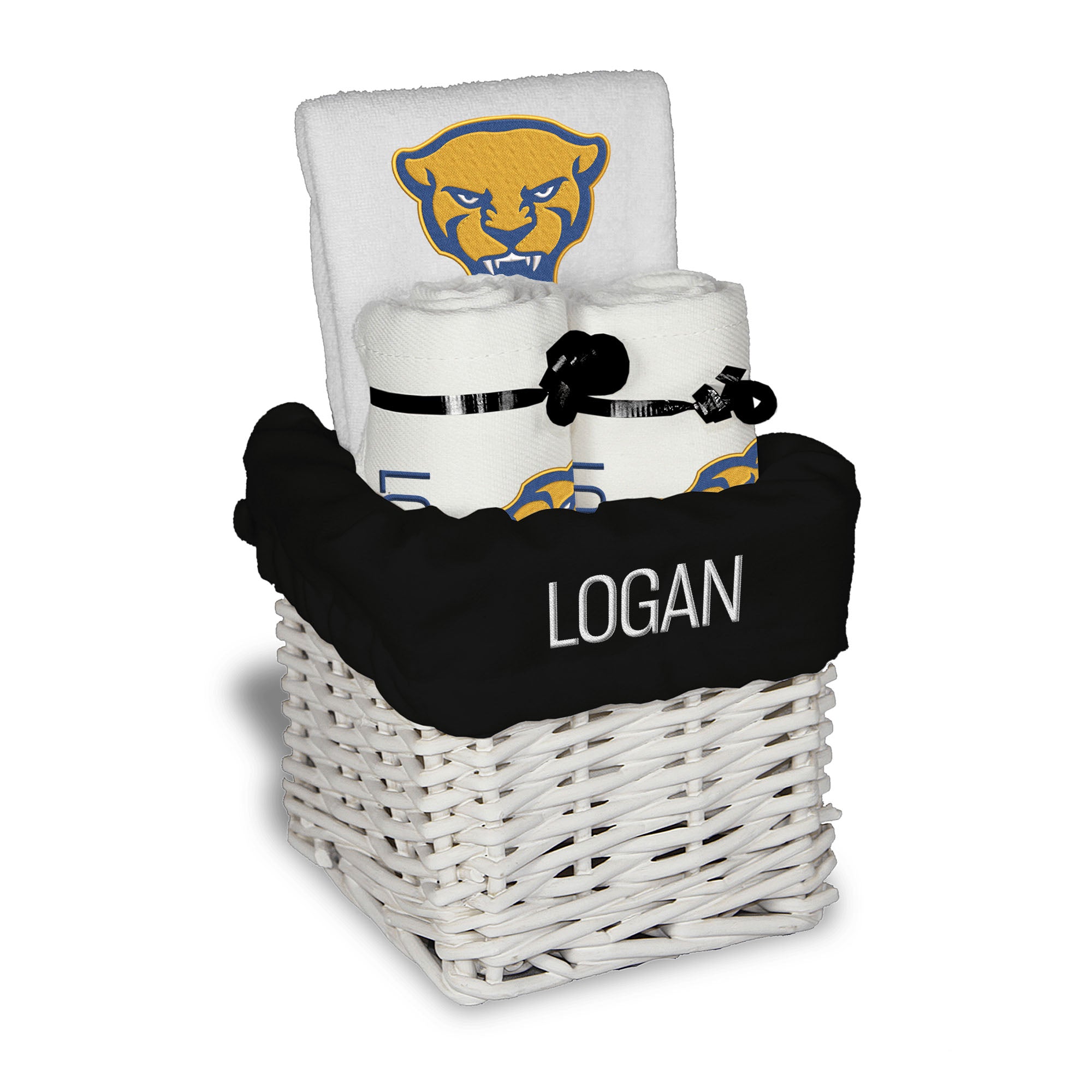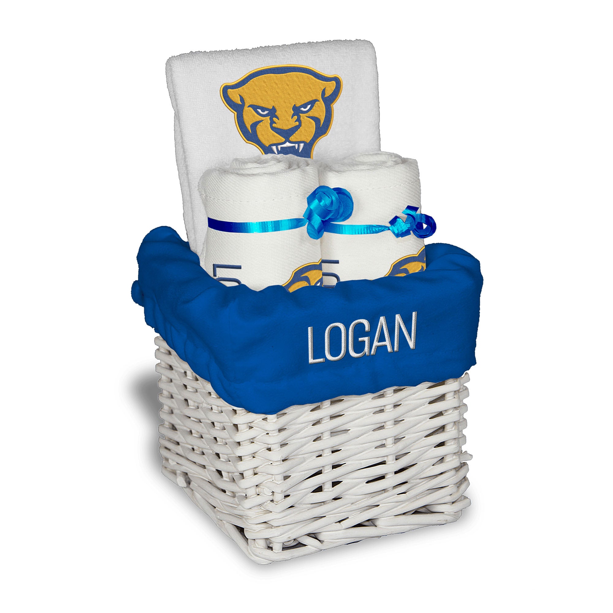 Our Personalized Pitt Panthers Small Gift Basket contains 3 of our best-selling items packaged in a white willow basket with a personalized cotton liner.  Each basket holds 2 of our 100% cotton burp cloths and a 100% cotton terry pullover bib. each piece is embroidered with the official Panthers logo and baby's name or nickname.