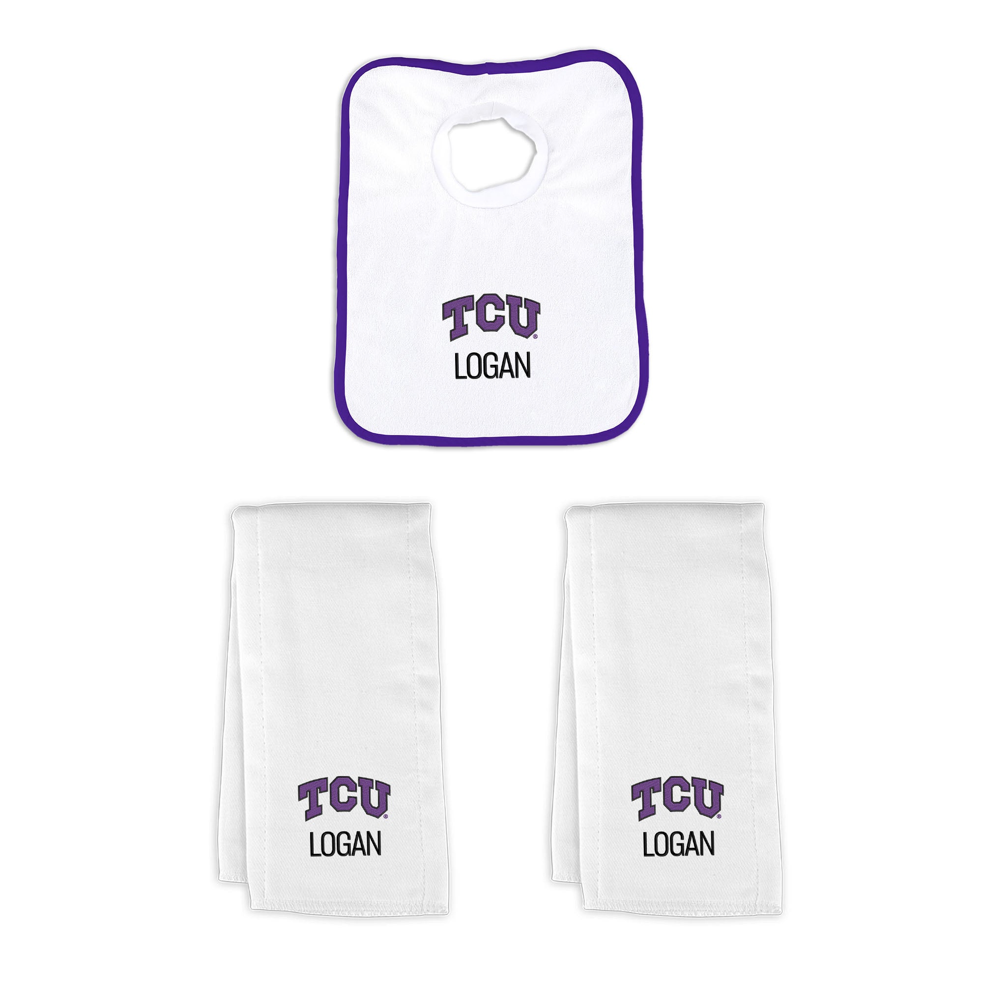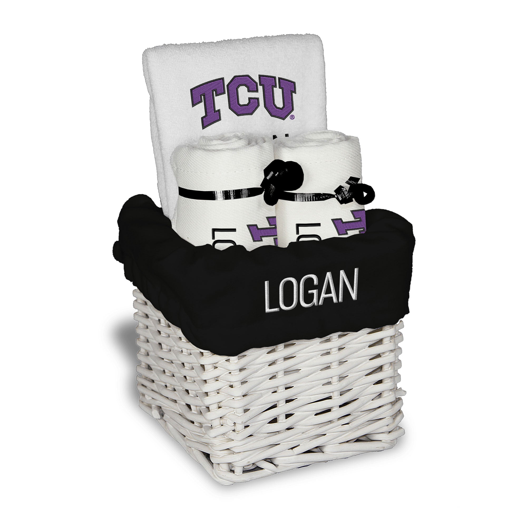 Our Personalized TCU Horned Frogs Small Gift Basket contains 3 of our best-selling items packaged in a white willow basket with a personalized cotton liner. Each basket holds 2 of our 100% cotton burp cloths and a 100% cotton terry pullover bib. each piece is embroidered with the official Horned Frogs logo and baby's name or nickname.