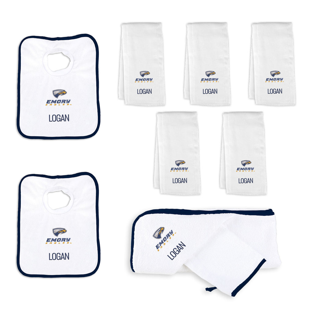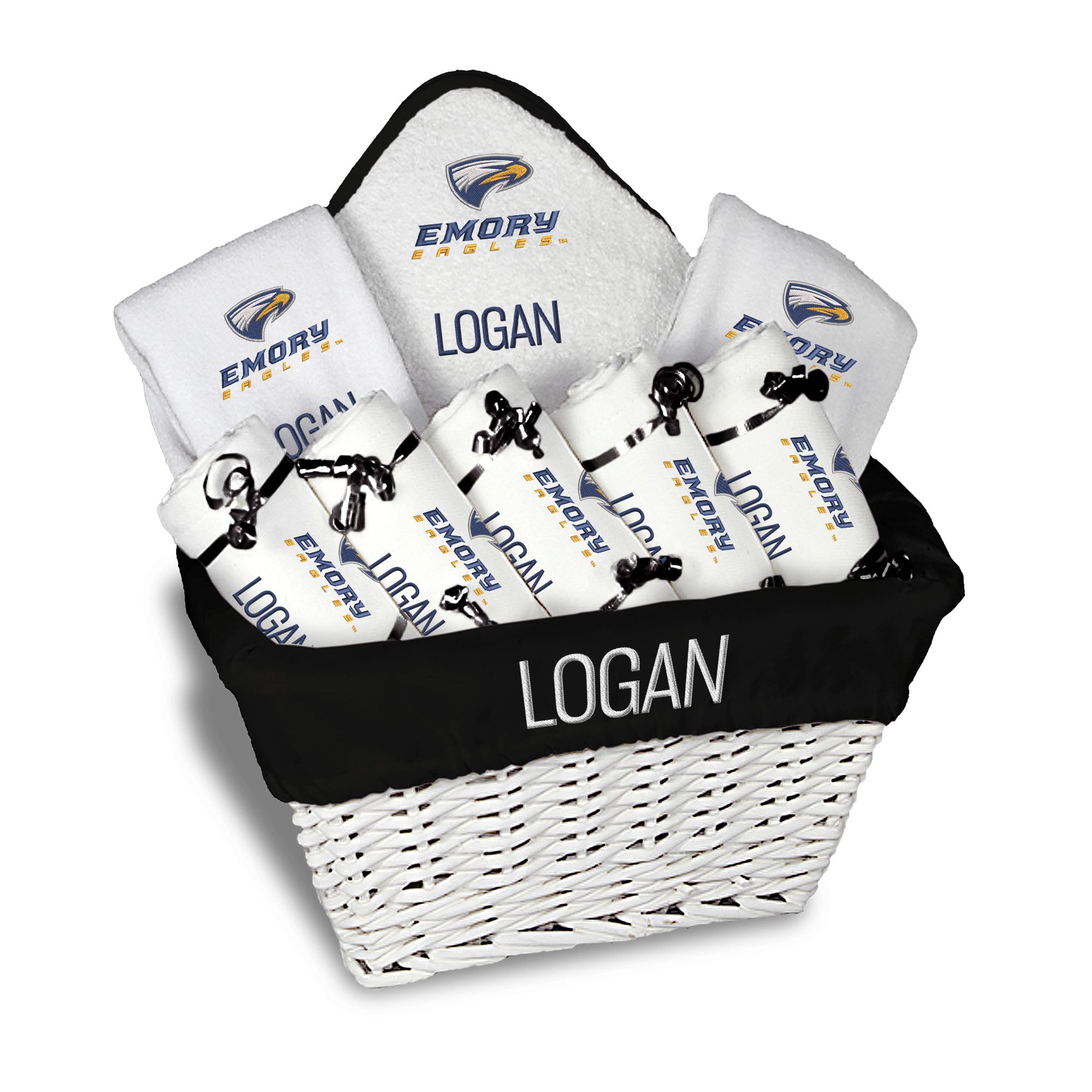 Our Personalized Emory Eagles Large Gift Basket contains an assortment of our best-selling items packaged in a white willow basket with a personalized cotton liner.  Each basket holds five of our 100% cotton burp cloths, two 100% cotton terry pullover bibs, and one 100% cotton terry hooded towel and wash mitt. The burp cloths, bibs and hooded towel are each embroidered with the Eagles logo and baby’s name or nickname; the basket liner is embroidered with the baby’s name.