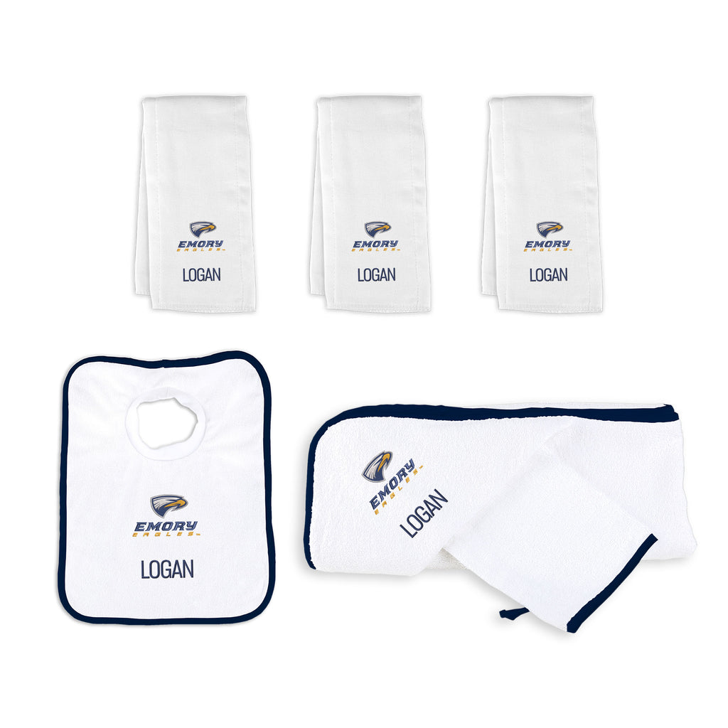 Our Personalized Emory Eagles Medium Gift Basket contains an assortment of our best-selling items packaged in a white willow basket with a personalized cotton liner. Each basket holds 3 of our 100% cotton burp cloths, one 100% cotton terry pullover bib, and one 100% cotton terry hooded towel and wash mitt. The burp cloths, bib and hooded towel are each embroidered with the Eagles logo and baby’s name or nickname; the basket liner is embroidered with the baby’s name.