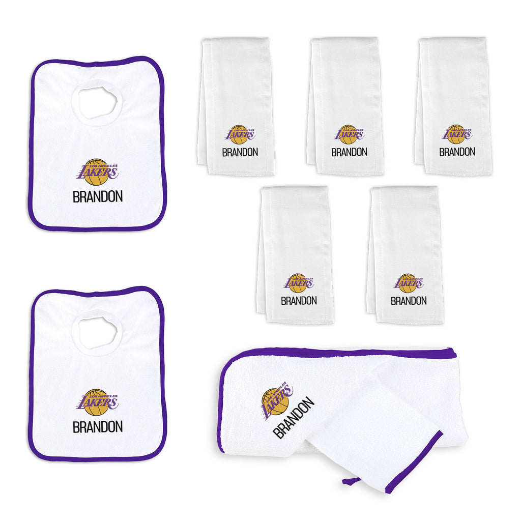 Our Personalized Los Angeles Lakers Large Gift Basket contains an assortment of our best-selling items packaged in a white willow basket with a personalized cotton liner.  Each basket holds five of our 100% cotton burp cloths, two 100% cotton terry pullover bibs, and one 100% cotton terry hooded towel and wash mitt. The burp cloths, bibs and hooded towel are each embroidered with the Lakers logo and baby’s name or nickname; the basket liner is embroidered with the baby’s name.