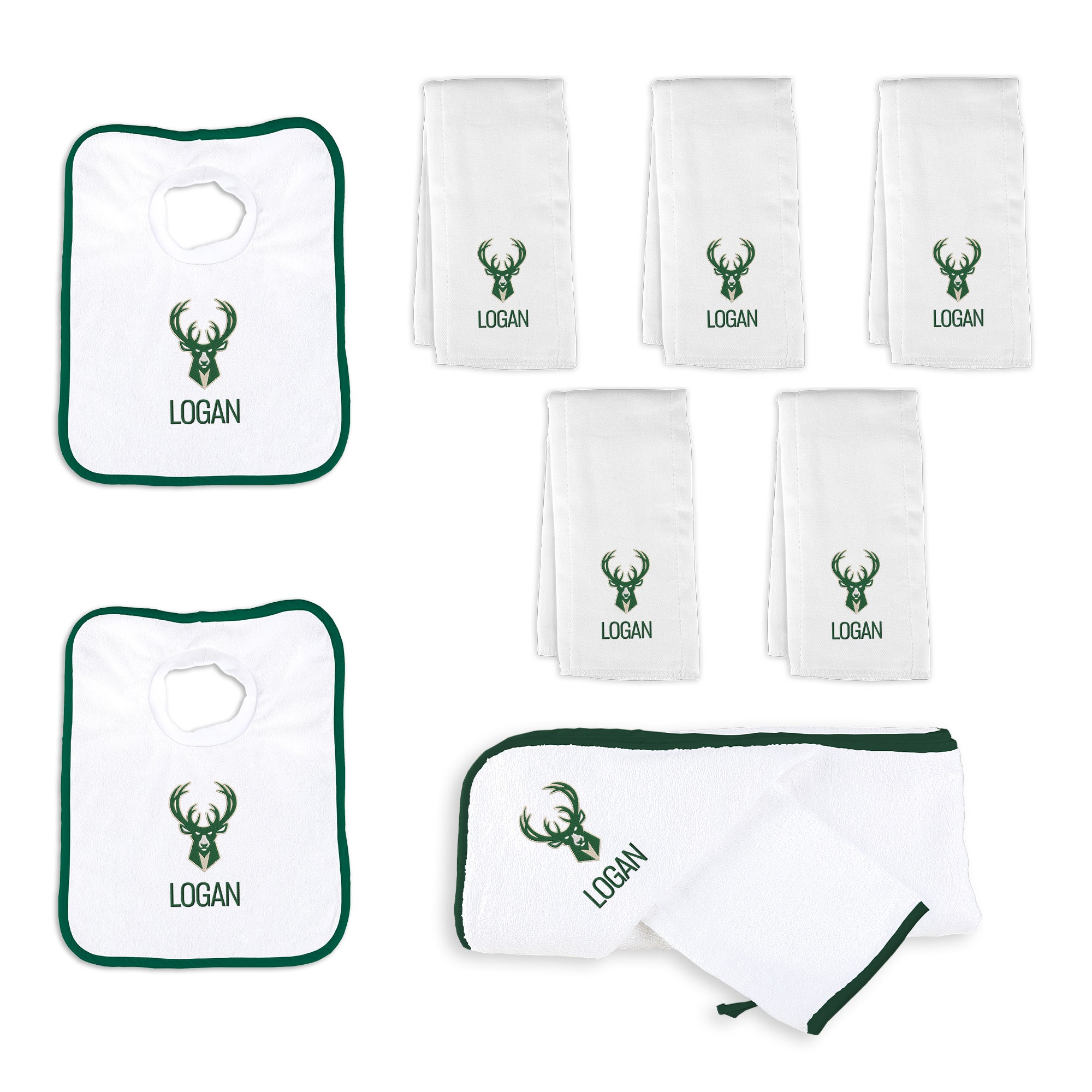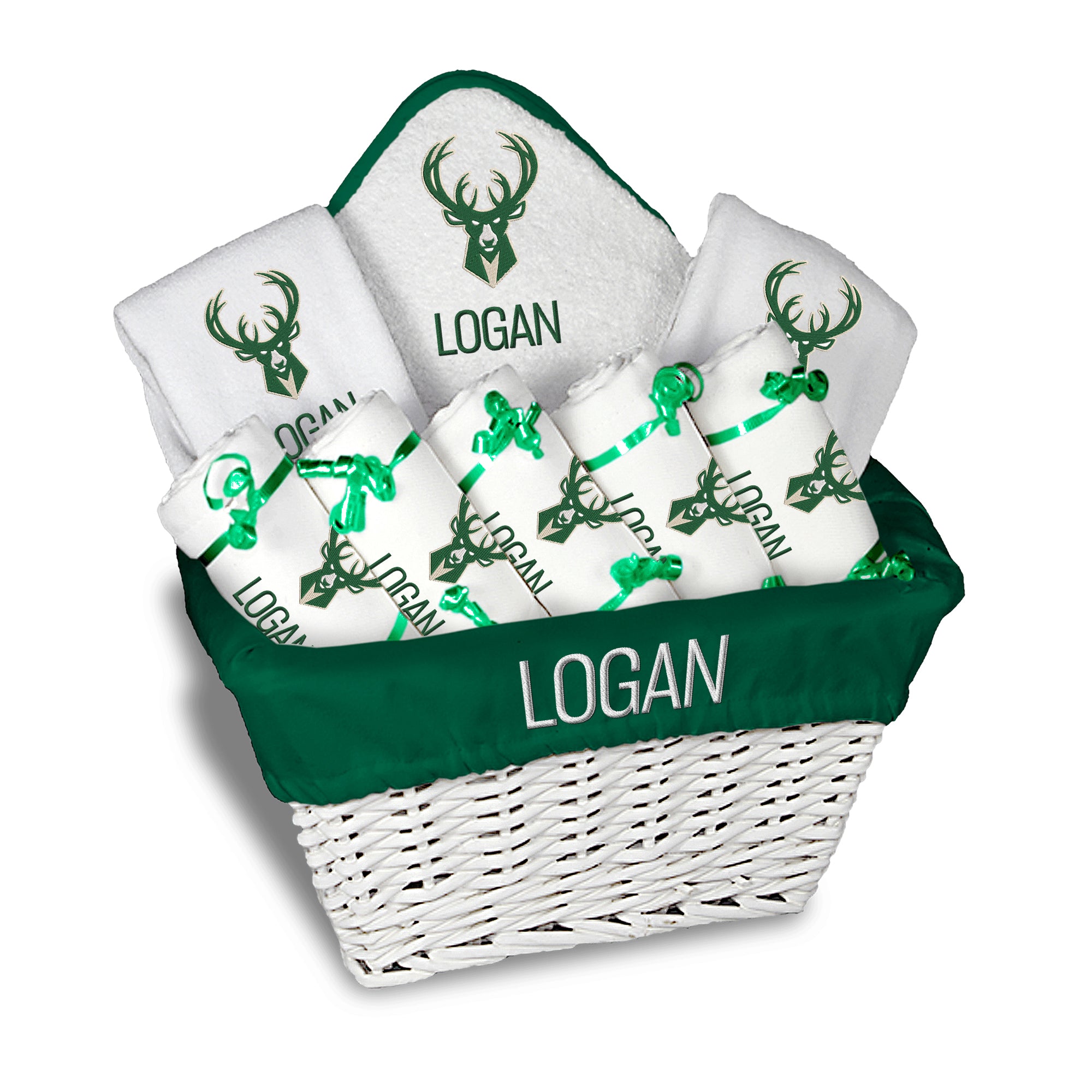 Our Personalized Milwaukee Bucks Large Gift Basket contains an assortment of our best-selling items packaged in a white willow basket with a personalized cotton liner.  Each basket holds five of our 100% cotton burp cloths, two 100% cotton terry pullover bibs, and one 100% cotton terry hooded towel and wash mitt. The burp cloths, bibs and hooded towel are each embroidered with the Bucks logo and baby’s name or nickname; the basket liner is embroidered with the baby’s name.