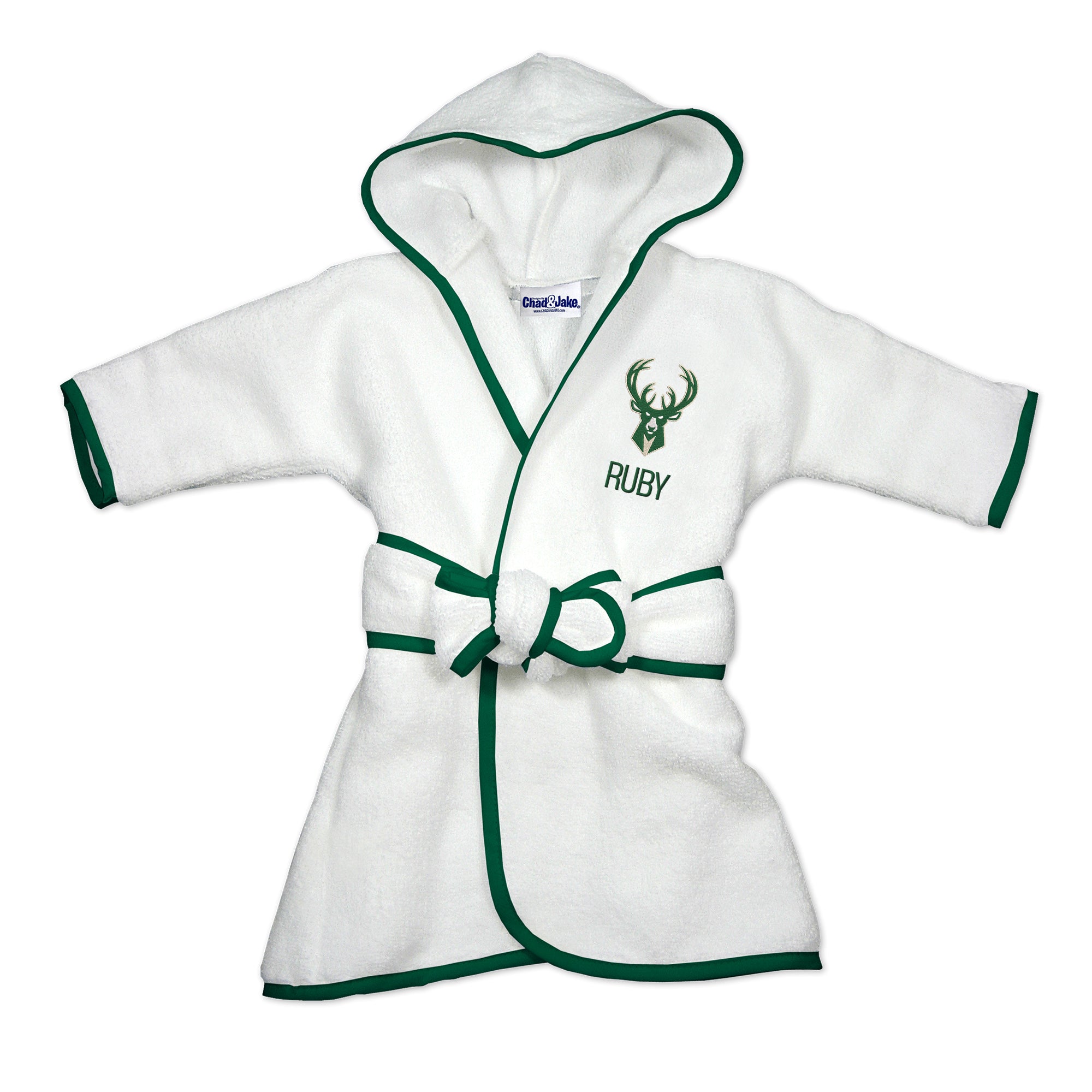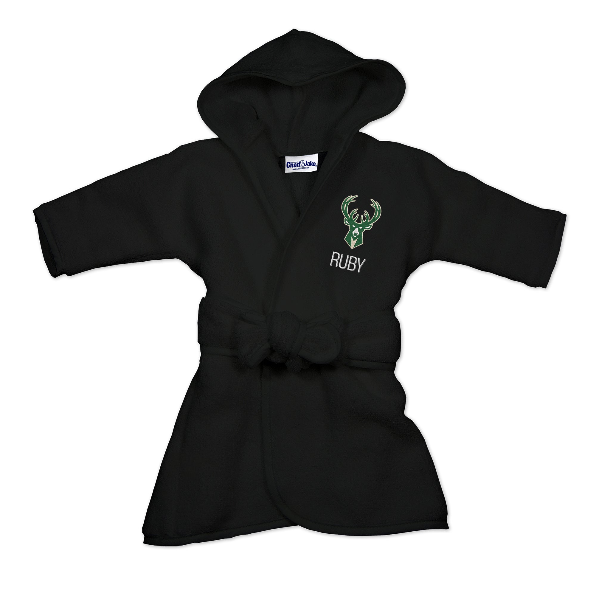 Our Personalized Milwaukee Bucks Infant Robe is a fun and practical accessory for every little Bucks fan.  Each robe is embroidered with the official Milwaukee Bucks logo and your own little one’s name or nickname.  What a great way for even the youngest fans to support their team and show Bucks pride!  Kids can wrap up after a bath or shower, cover up and dry off after swimming, or relax at home in the comfort of this plush Bucks robe sized just for them.