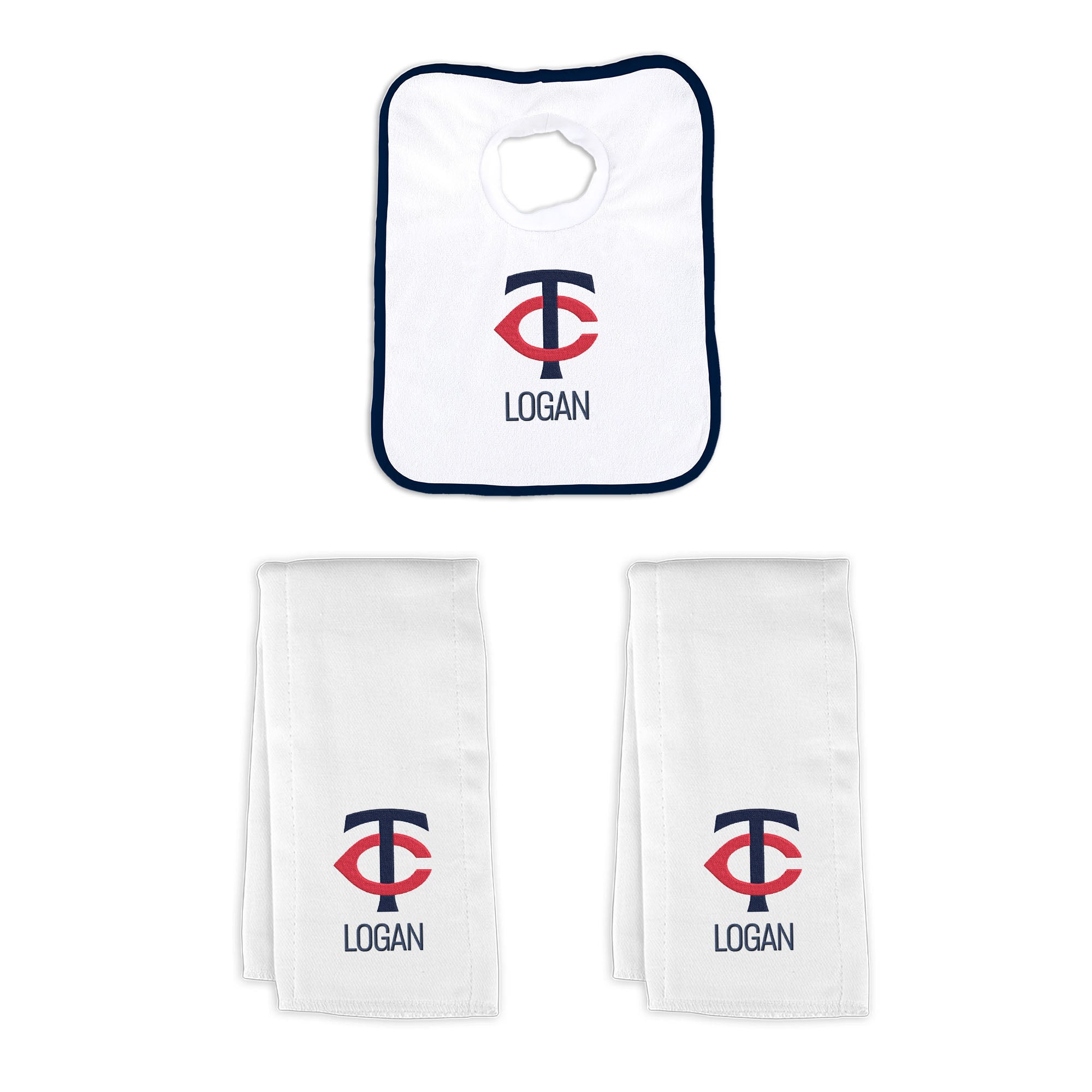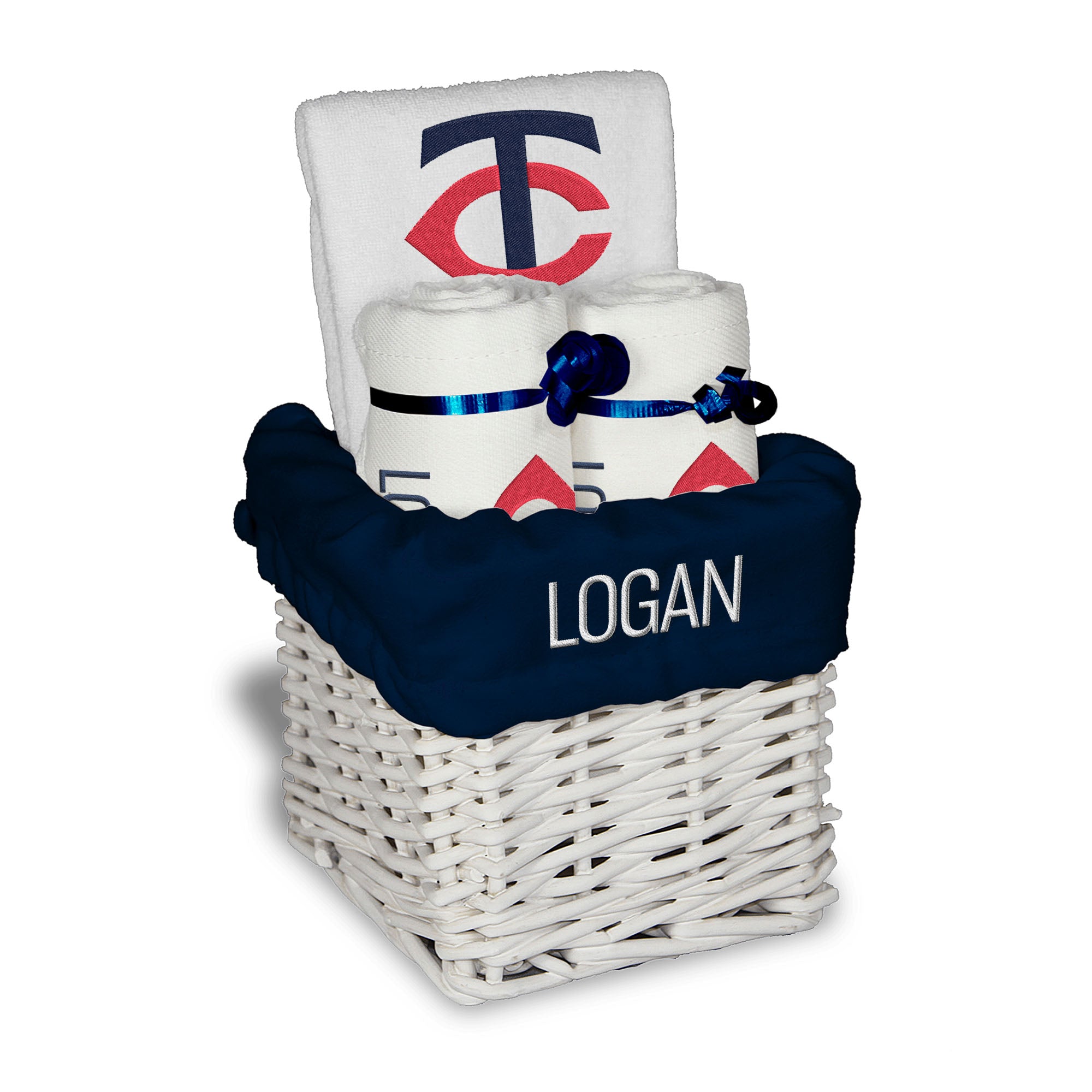Our Personalized Minnesota Twins Small Gift Basket contains 3 of our best-selling items packaged in a white willow basket with a personalized cotton liner. Each basket holds 2 of our 100% cotton burp cloths and a 100% cotton terry pullover bib. each piece is embroidered with the official Twins logo and baby's name or nickname.