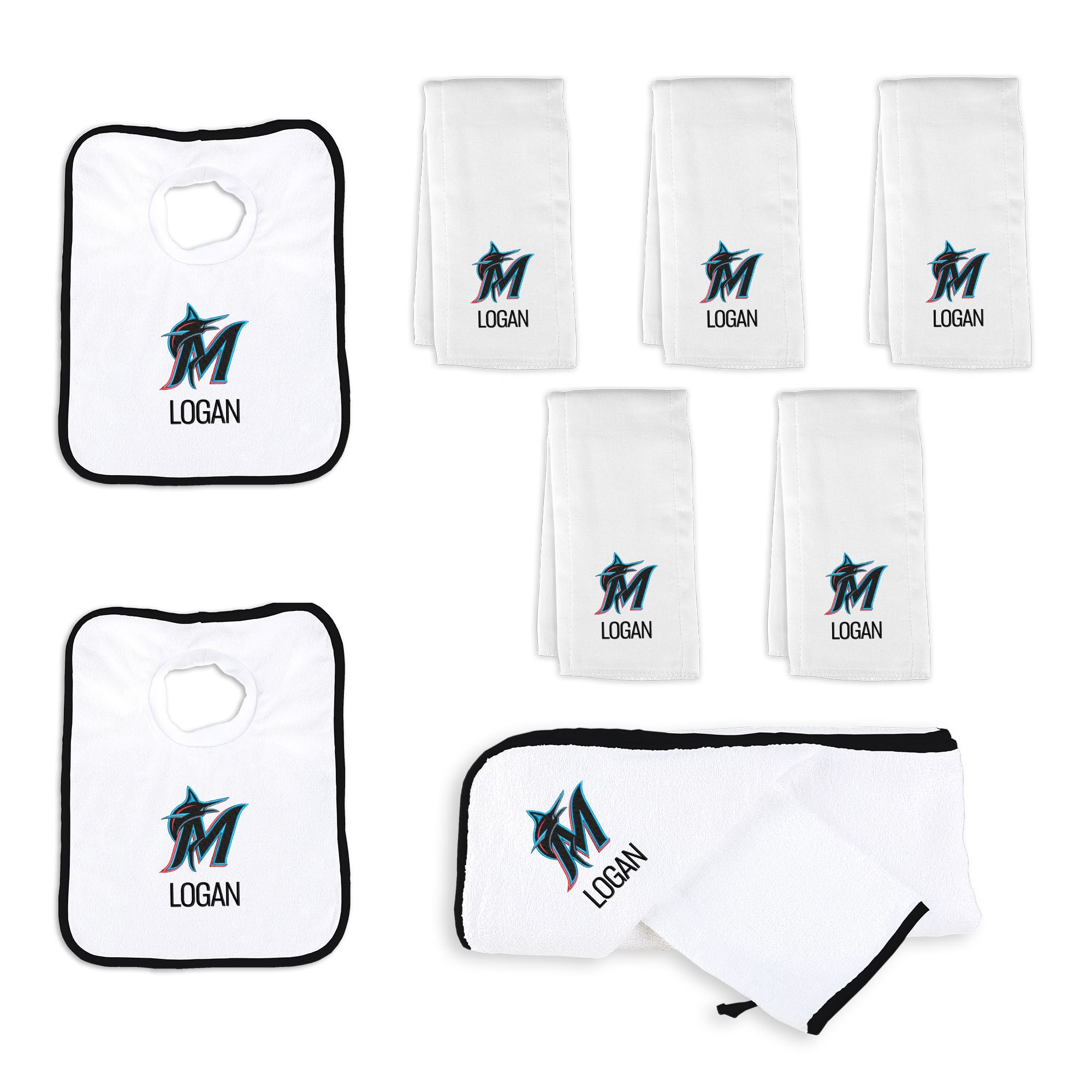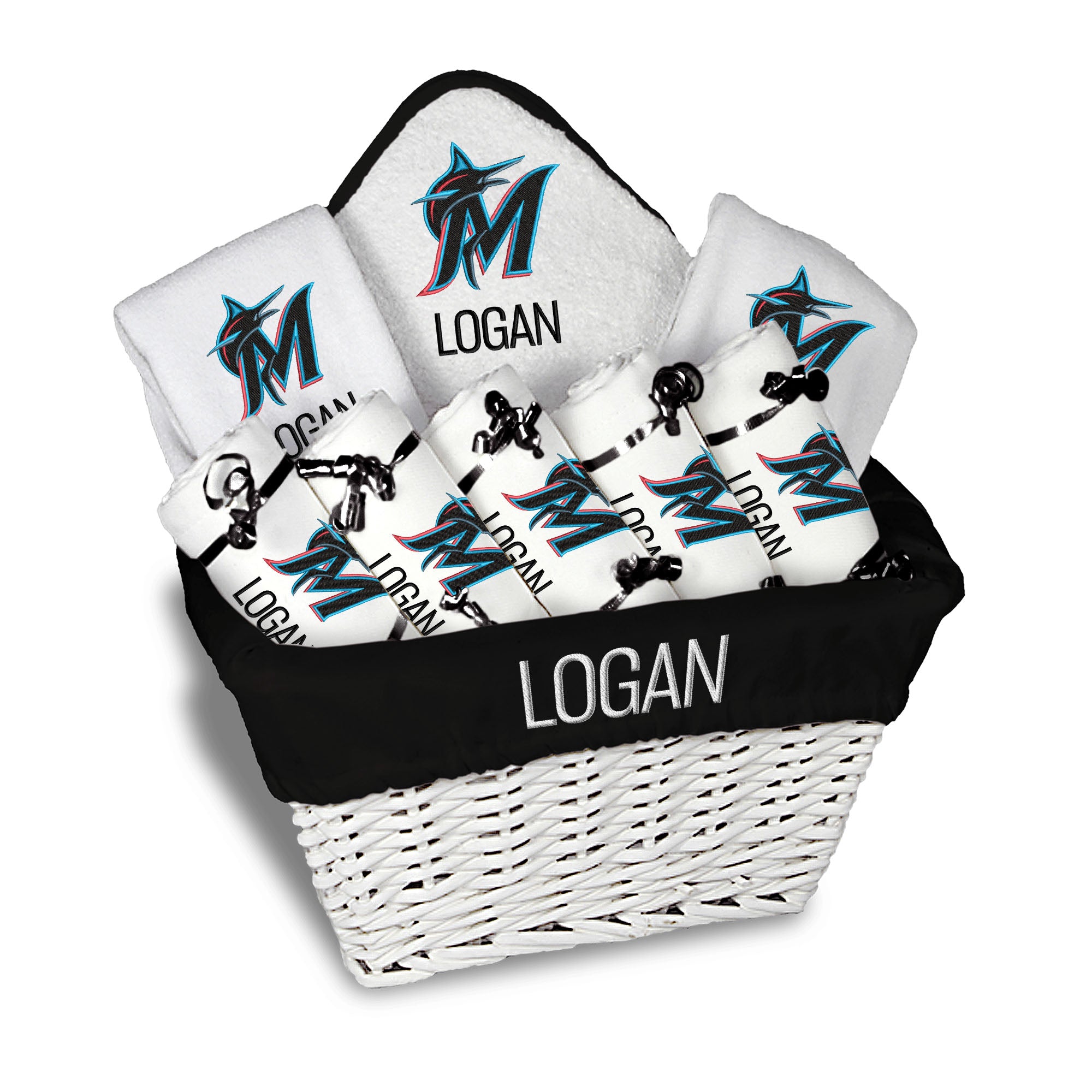 Our Personalized Miami Marlins Large Gift Basket contains an assortment of our best-selling items packaged in a white willow basket with a personalized cotton liner. Each basket holds five of our 100% cotton burp cloths, two 100% cotton terry pullover bibs, and one 100% cotton terry hooded towel and wash mitt. The burp cloths, bibs and hooded towel are each embroidered with the Marlins logo and baby’s name or nickname; the basket liner is embroidered with the baby’s name.
