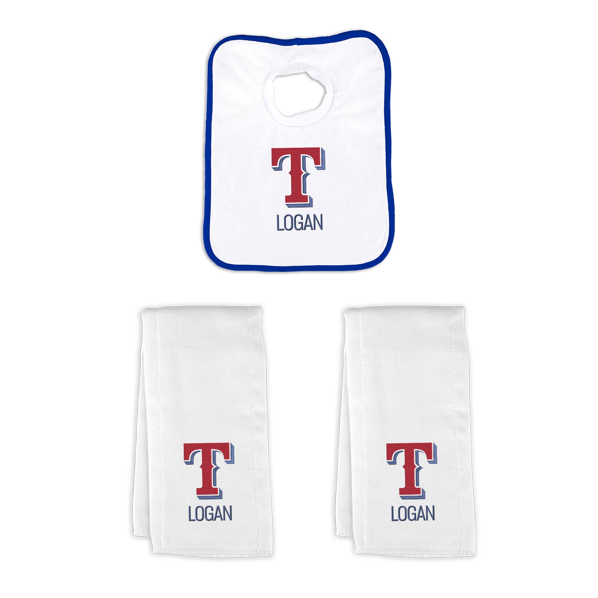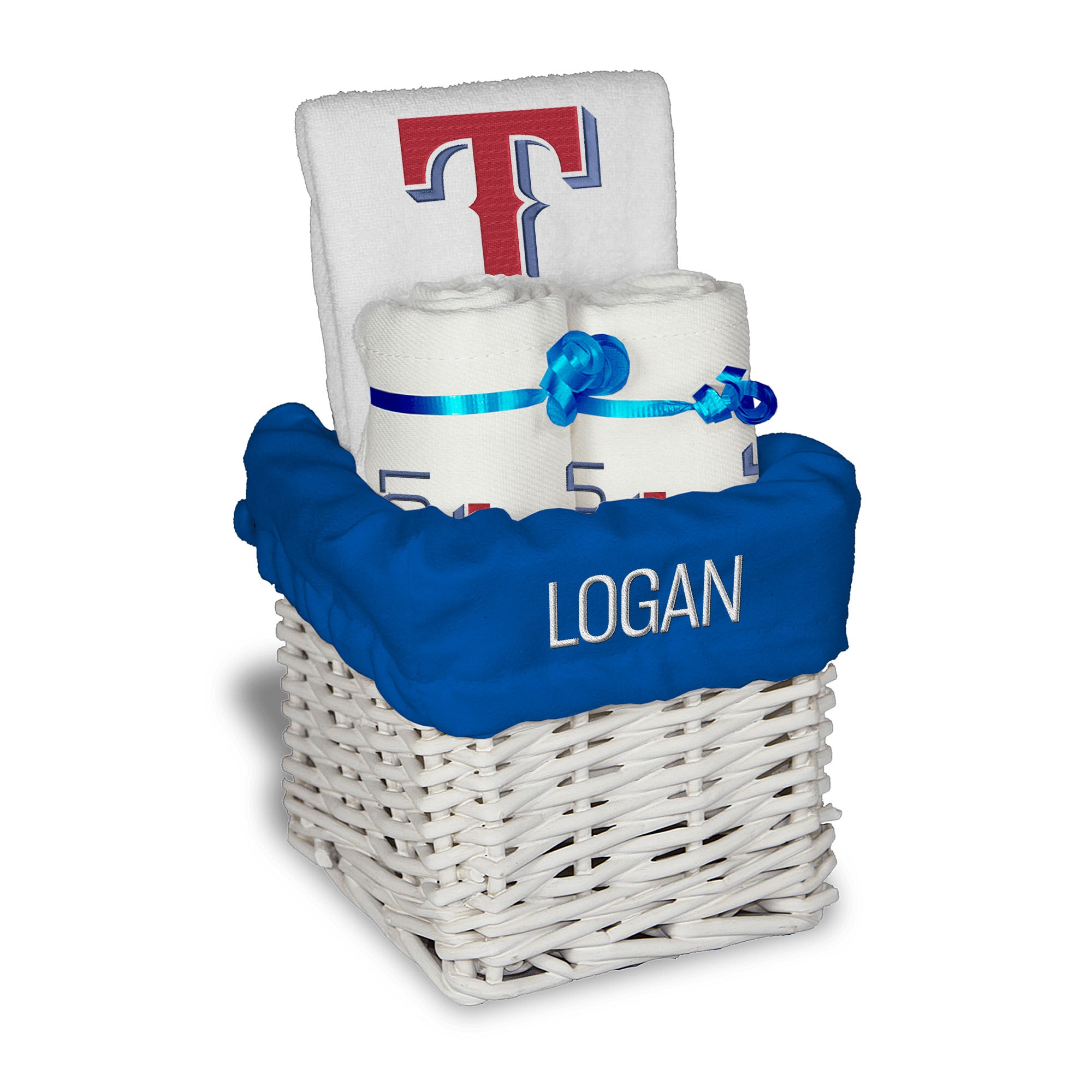 Our Personalized Texas Rangers Small Gift Basket contains 3 of our best-selling items packaged in a white willow basket with a personalized cotton liner.  Each basket holds 2 of our 100% cotton burp cloths and a 100% cotton terry pullover bib. each piece is embroidered with the official Rangers logo and baby's name or nickname.