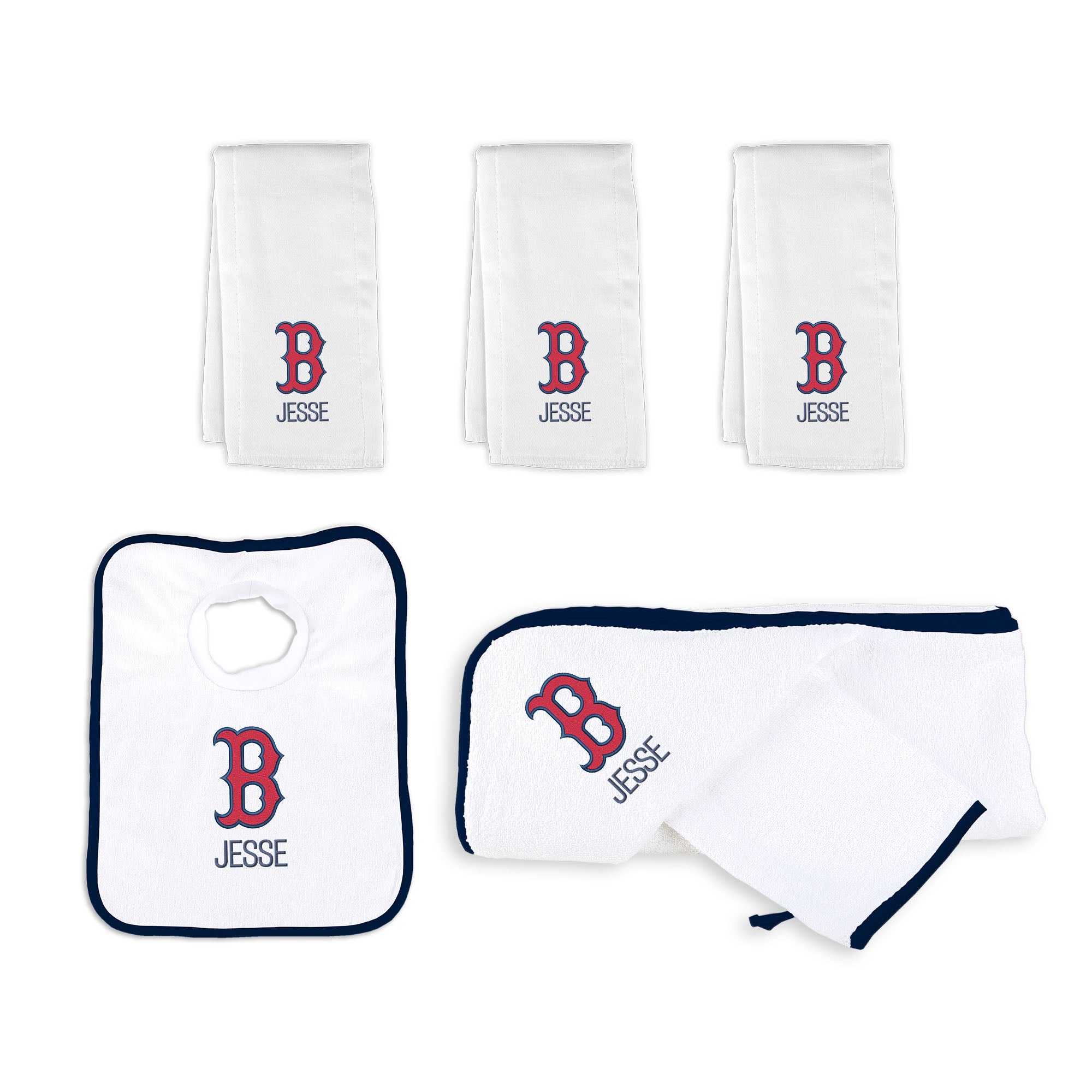 - 3 100% cotton burp cloths, each intricately embroidered with the Boston Red Sox "B" logo and your baby's name or nickname.