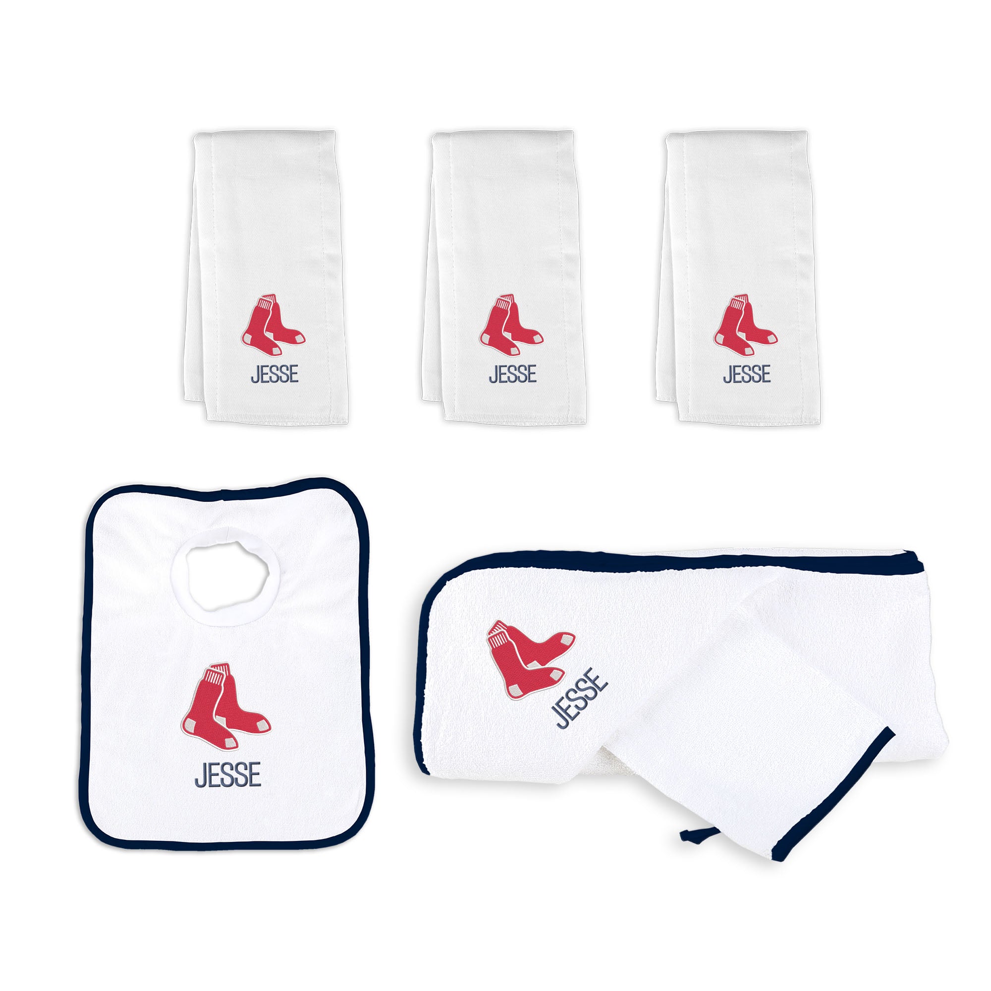 • 1 100% cotton terry hooded towel and wash mitt set, both adorned with the Boston Red Sox logo and your baby's name.
