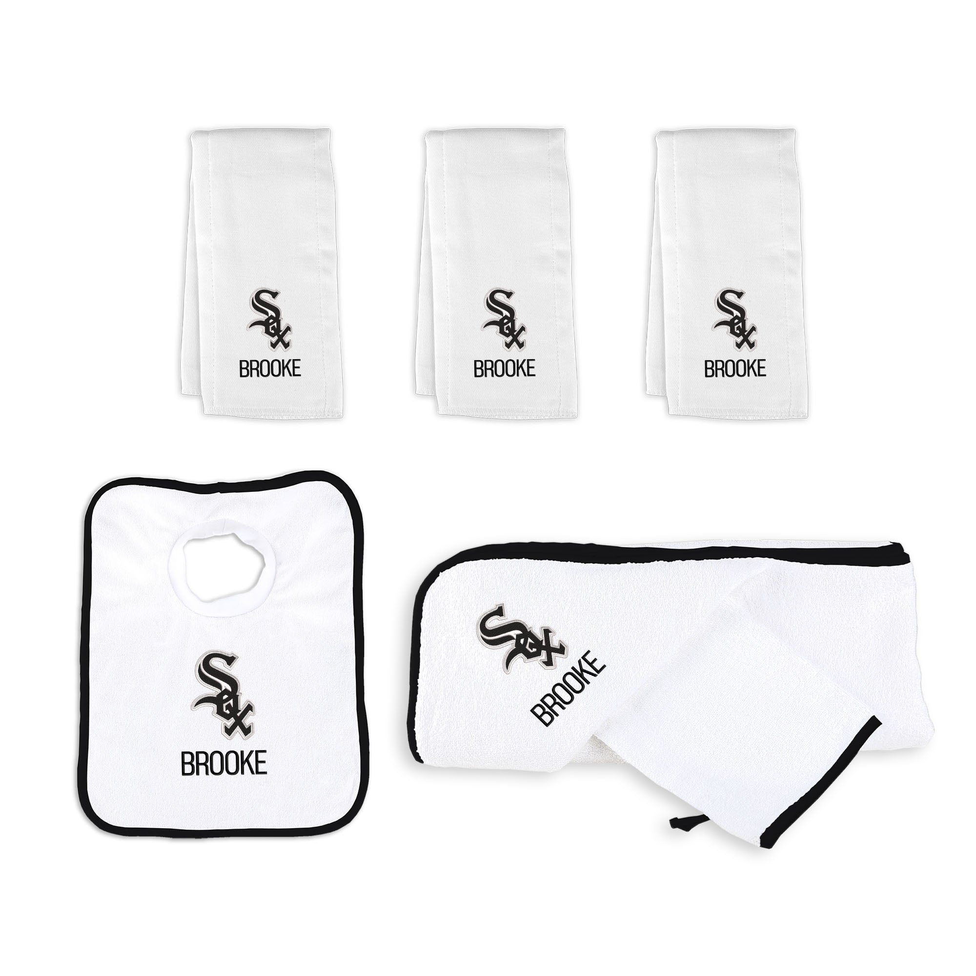 - 1 100% cotton terry hooded towel and wash mitt set, both adorned with the Chicago White Sox logo and your baby's name.