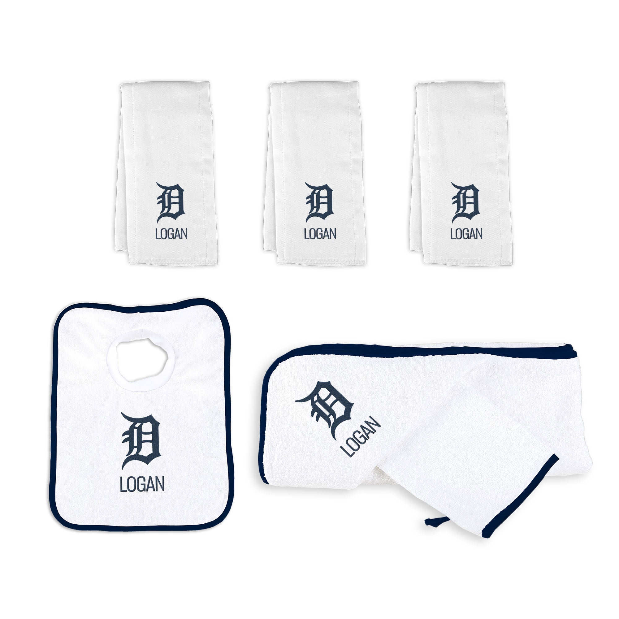 - 1 100% cotton terry hooded towel and wash mitt set, both adorned with the Detroit Tigers logo and your baby's name.