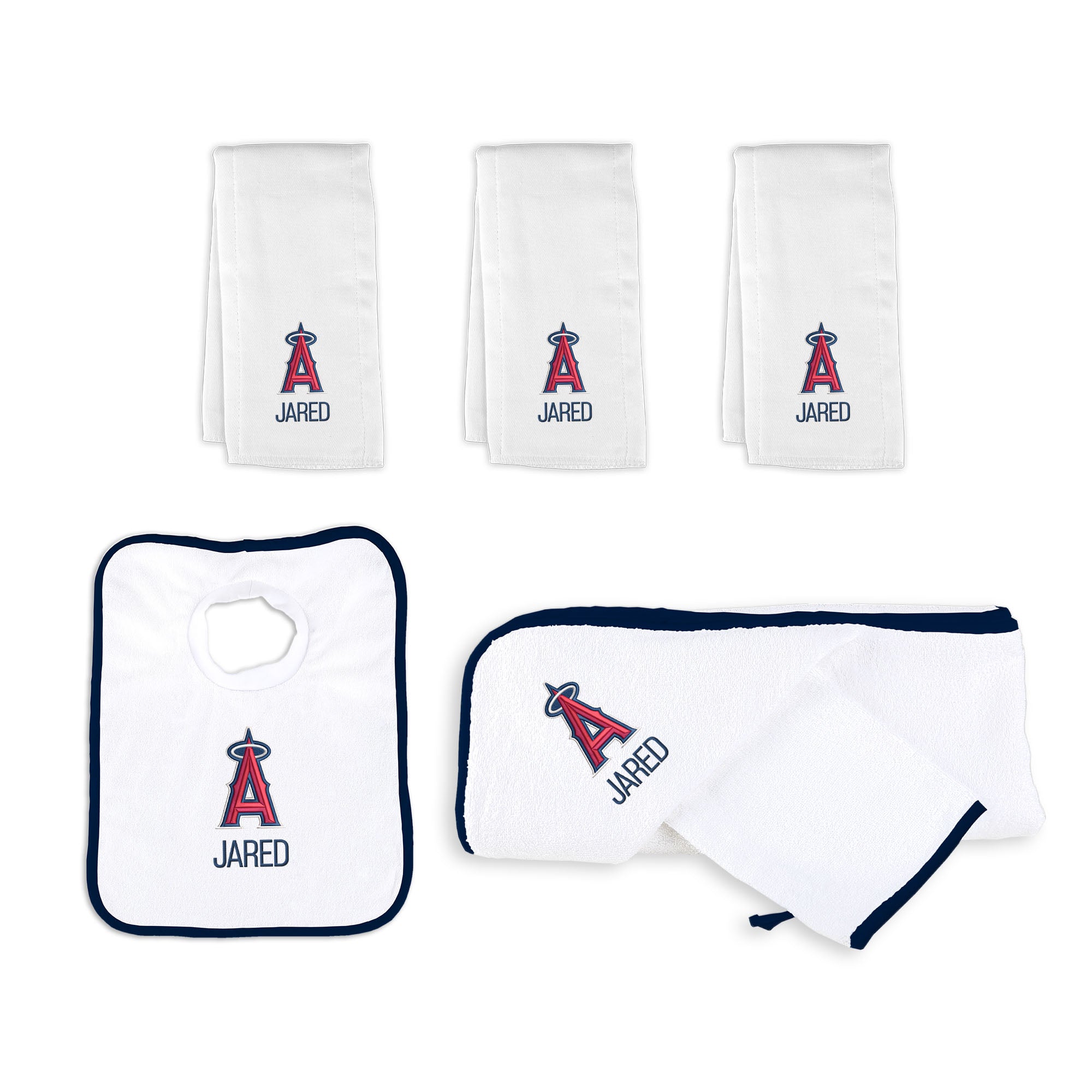 - 3 100% cotton burp cloths, each intricately embroidered with the LA Angels logo and your baby's name or nickname.