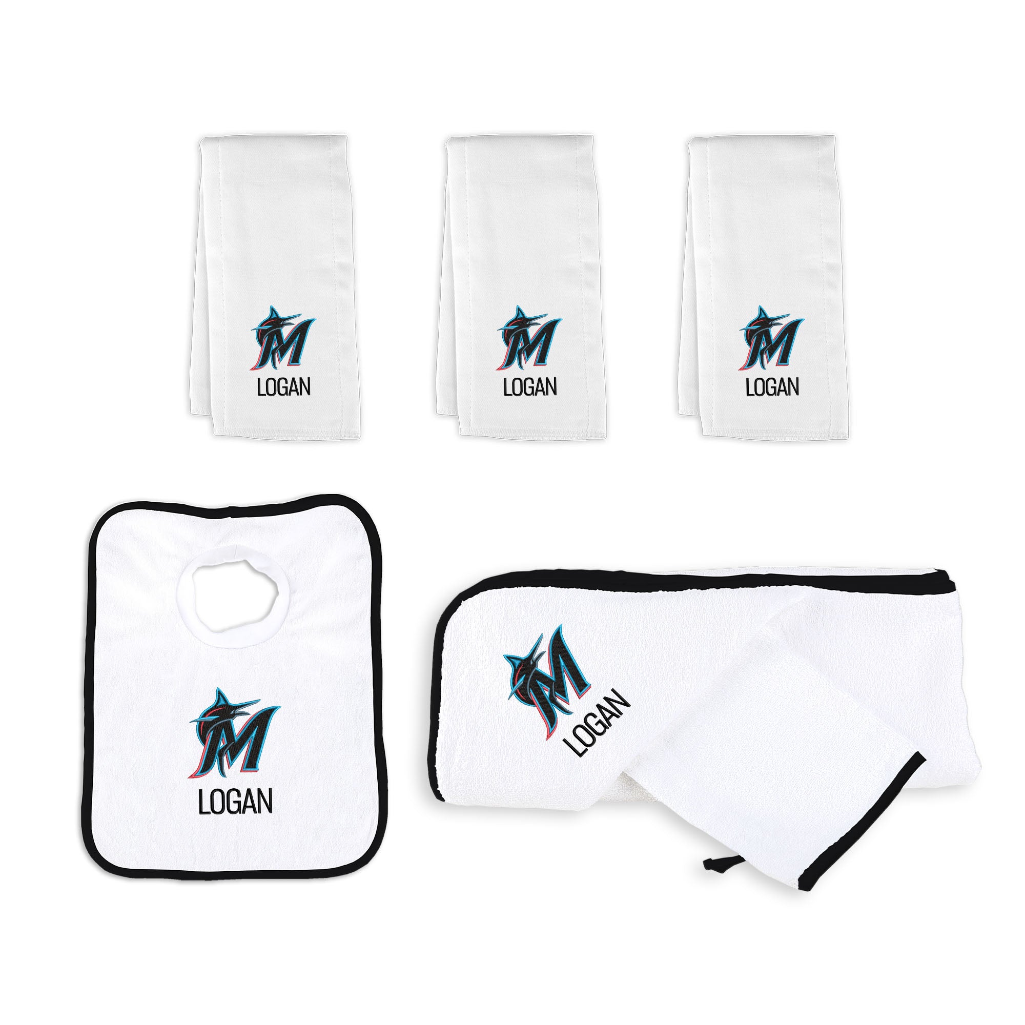 - 1 100% cotton terry hooded towel and wash mitt set, both adorned with the Miami Marlins logo and your baby's name.