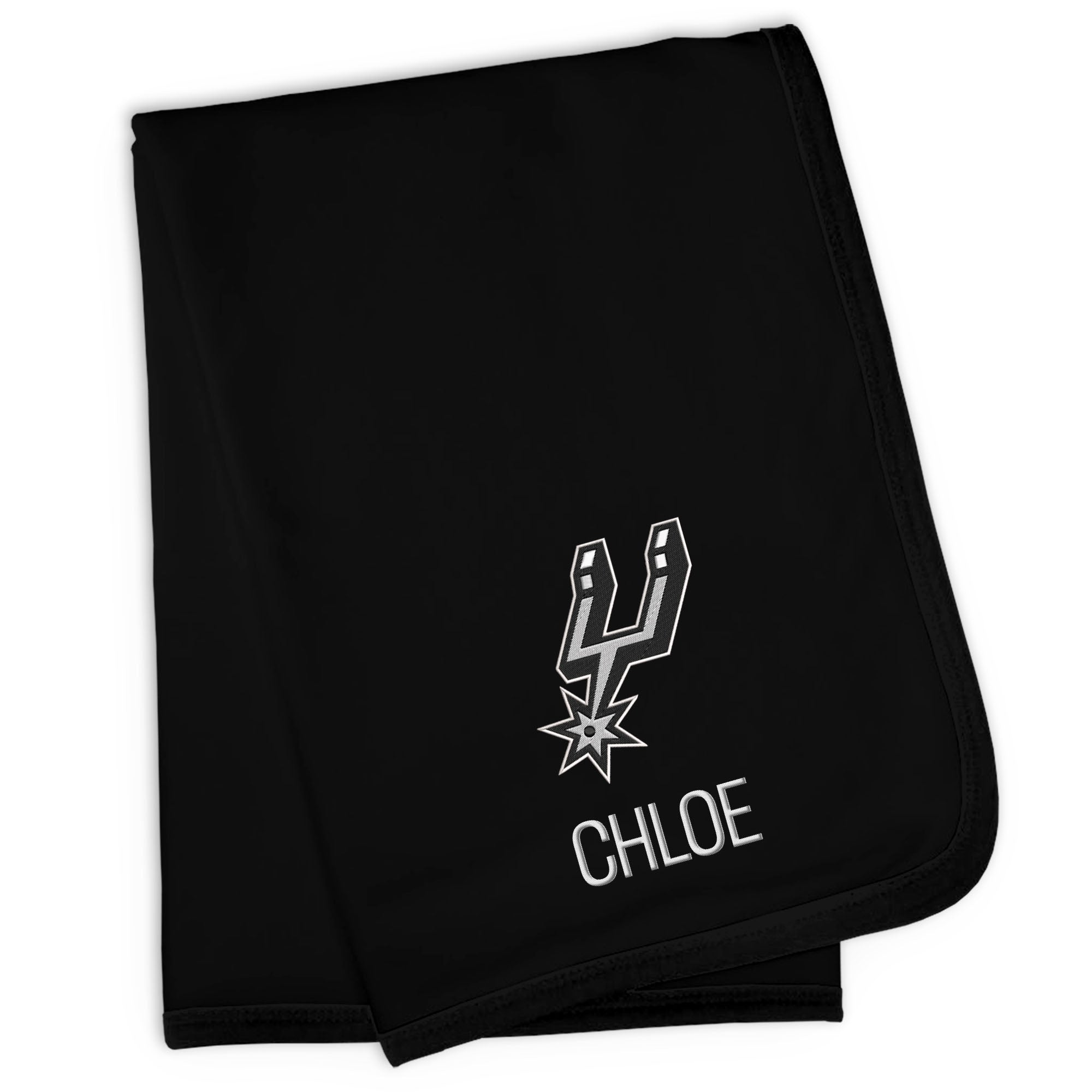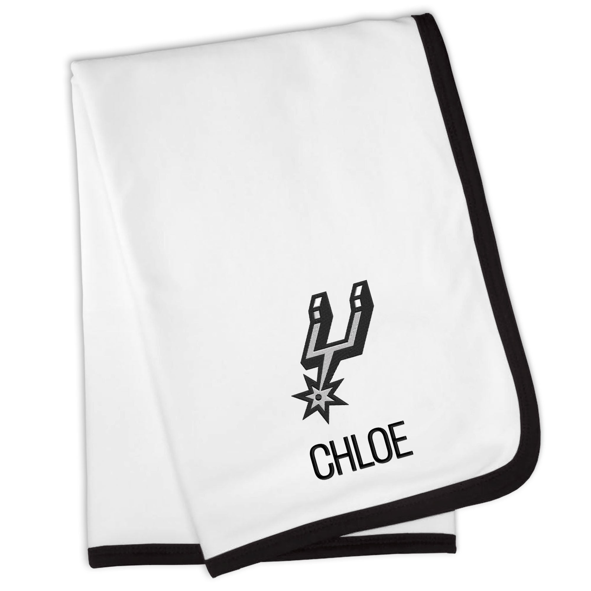 Our Personalized San Antonio Spurs Blanket is sized just right for a baby basketball fan. Constructed from super soft 100% cotton jersey knit and trimmed in Spurs team colors, this blanket is perfect for walks in the stroller or swaddling at bedtime.  Each blanket is embroidered with the official Spurs logo and your little one’s name or nickname.